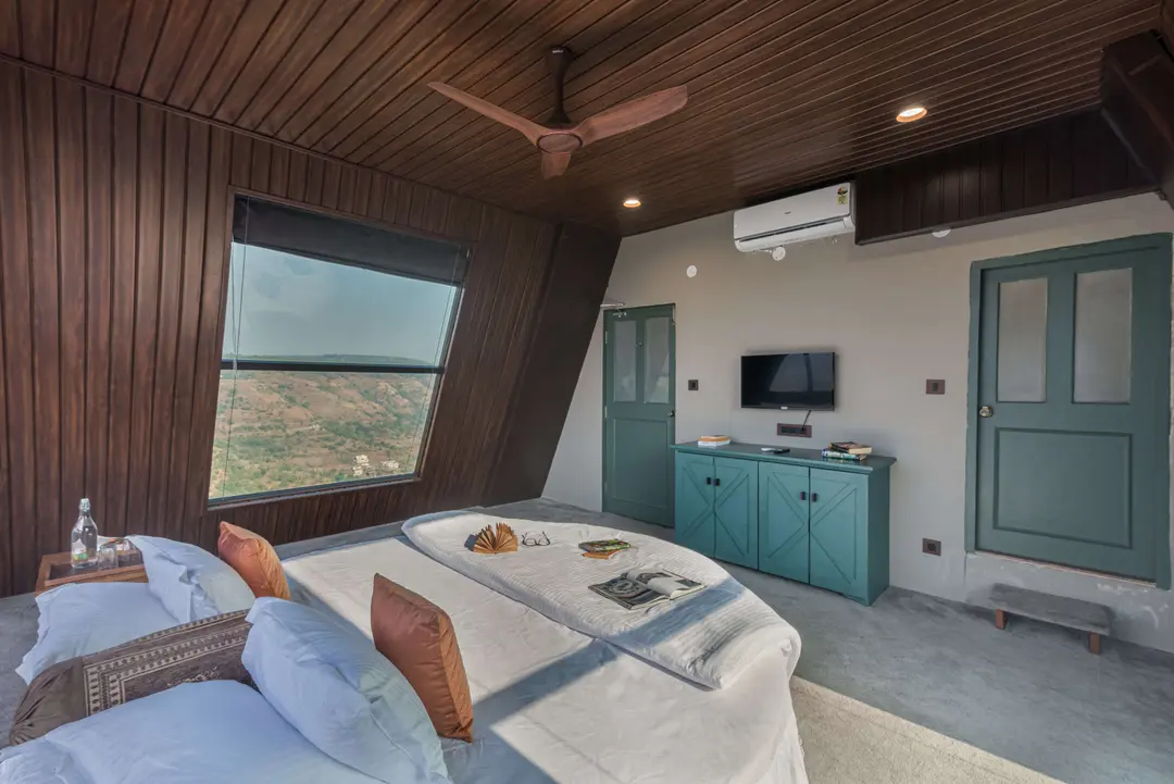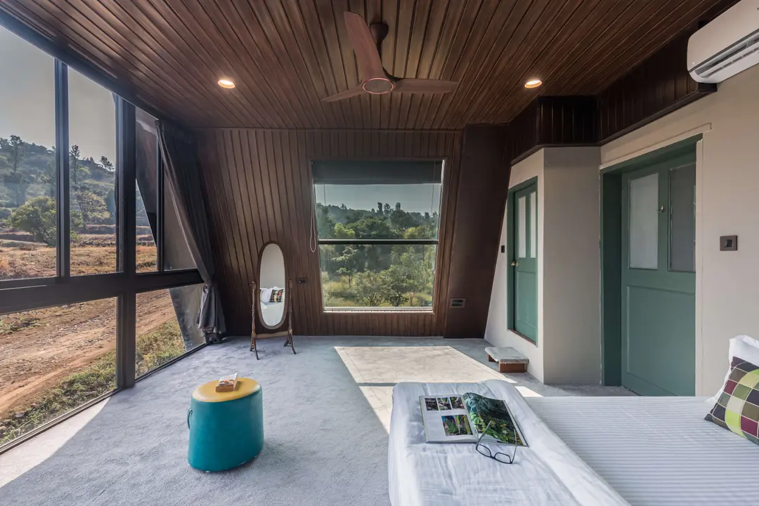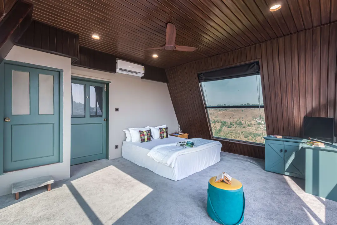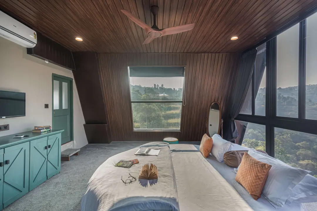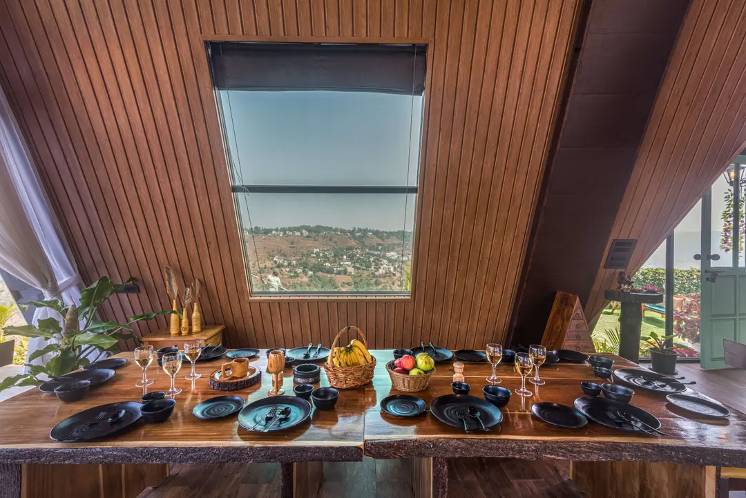 Aptly named, ‘A Vantage’, this unique pyramid-shaped architecture located at the edge of a hill in Panchgani has the most serene views in Panchgani. There is nothing but mountains, valley and the greenery around, giving you the feeling of owning the hill. BBQ nights by the infinity pool with these stunning views is the best part of the stay. The glass facade let’s you enjoy the lush greenery from every room and corner of the home.