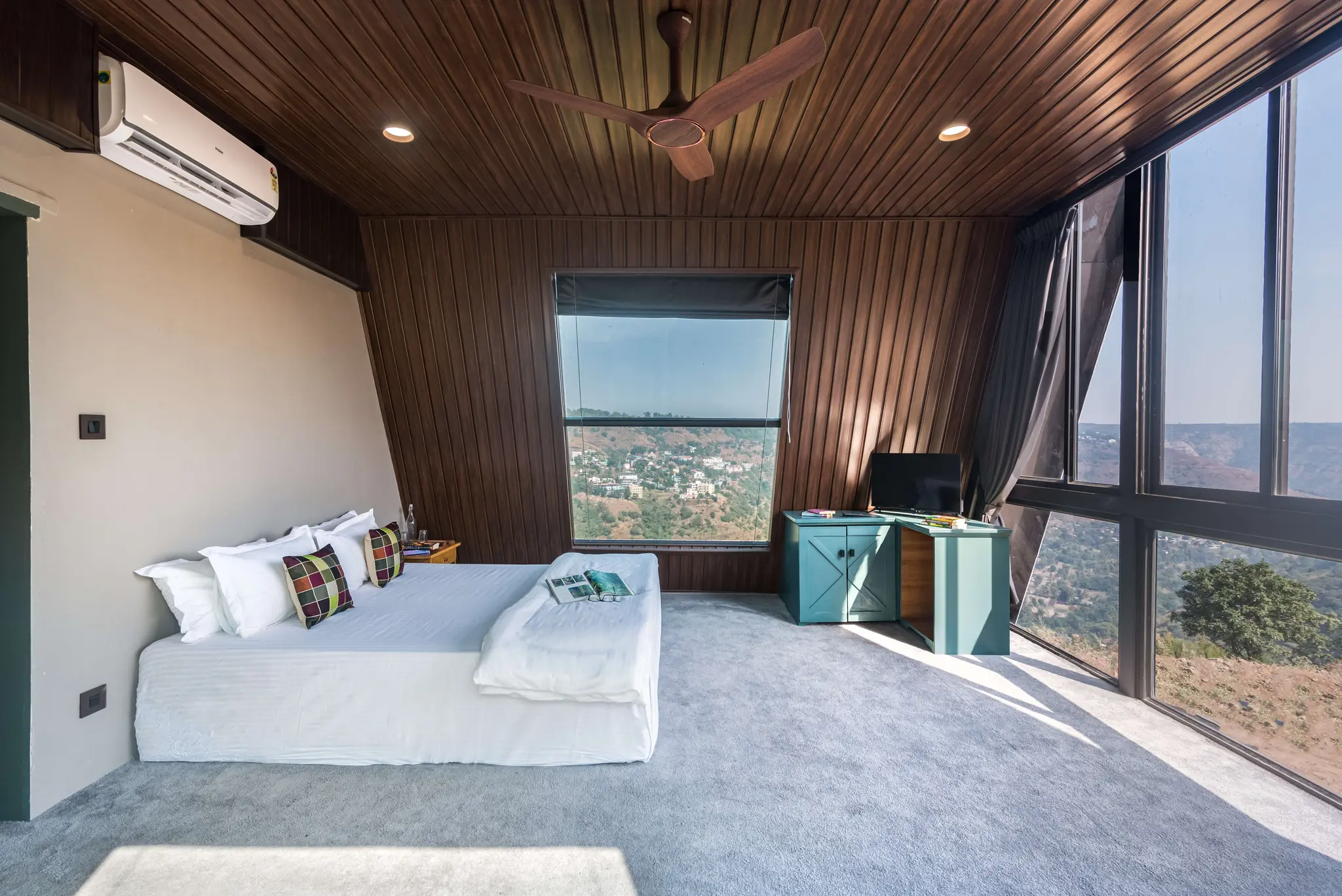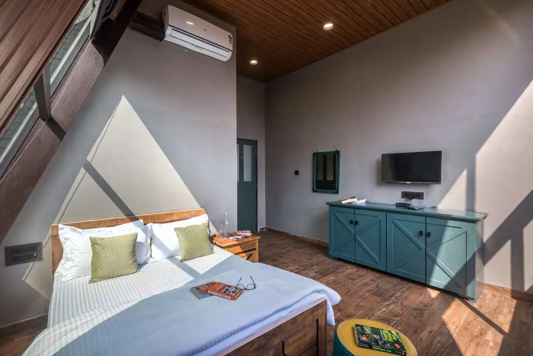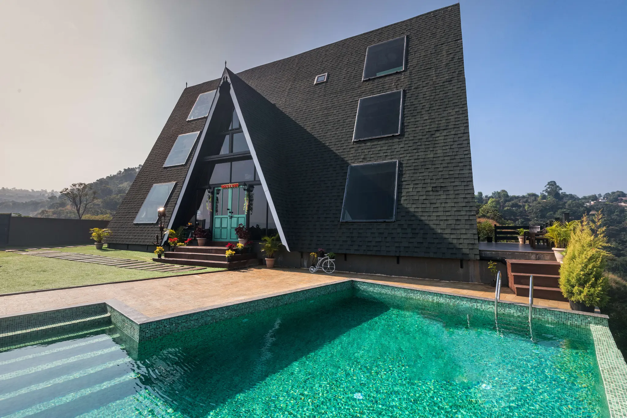 Aptly named, ‘A Vantage’, this unique pyramid-shaped architecture located at the edge of a hill in Panchgani has the most serene views in Panchgani. There is nothing but mountains, valley and the greenery around, giving you the feeling of owning the hill. BBQ nights by the infinity pool with these stunning views is the best part of the stay. The glass facade let’s you enjoy the lush greenery from every room and corner of the home.