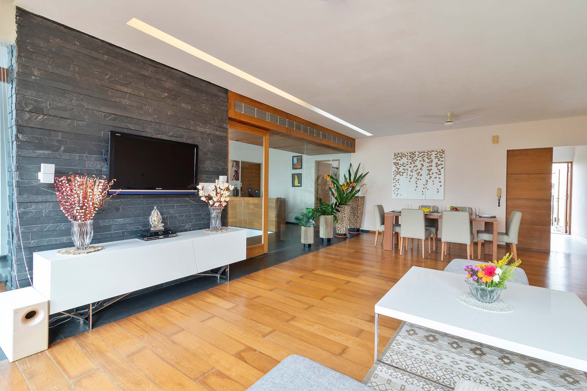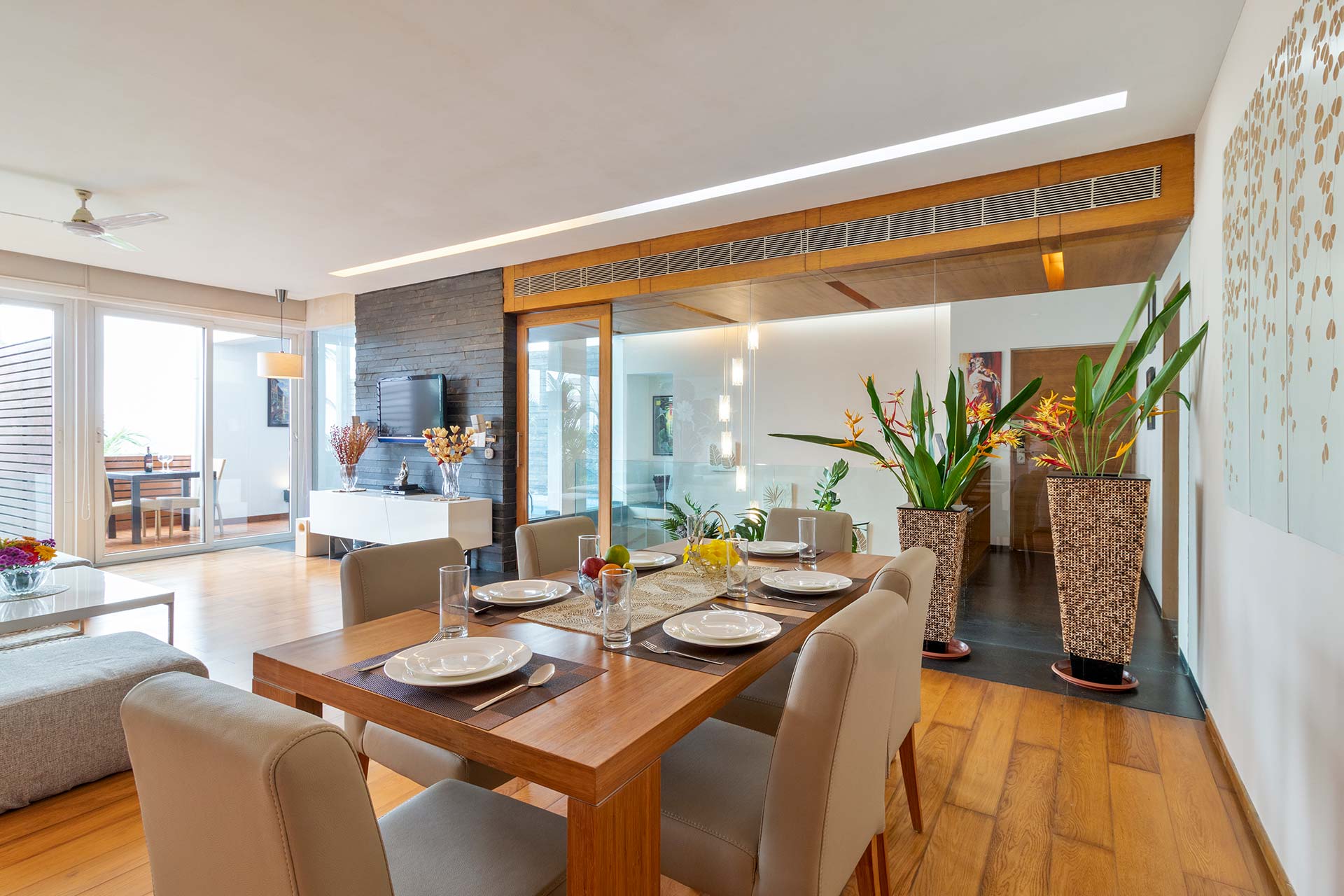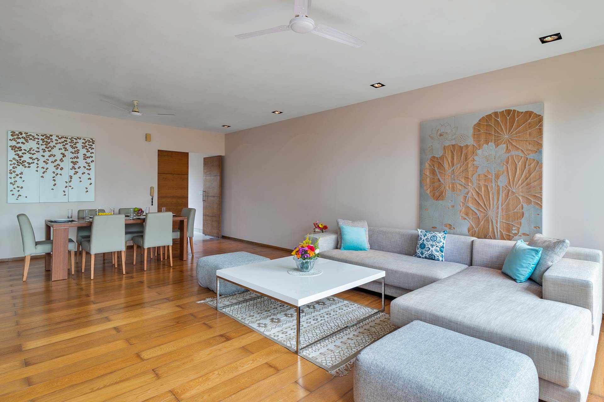 Escape the mundane to your own private oasis of solace and solitude – Acacia Skies is a luxurious holiday home nestled in the blissful neighbourhood of South Goa. Swathed in towering palms and verdant greenery, this modern duplex apartment is thoughtfully embellished with plush furnishings and stunning yet muted artworks. The wooden, muted palette follows throughout the home, echoing a soothing charm. If you wish to head out, Joets is just 7 minutes away where you can enjoy some amazing live music. After some fresh cocktails & a musical session, you can head to Hollant beach – a hidden gem where you can enjoy a nice swim. If you’re in the mood to speed things up a little, Panjim is 30 minutes away.