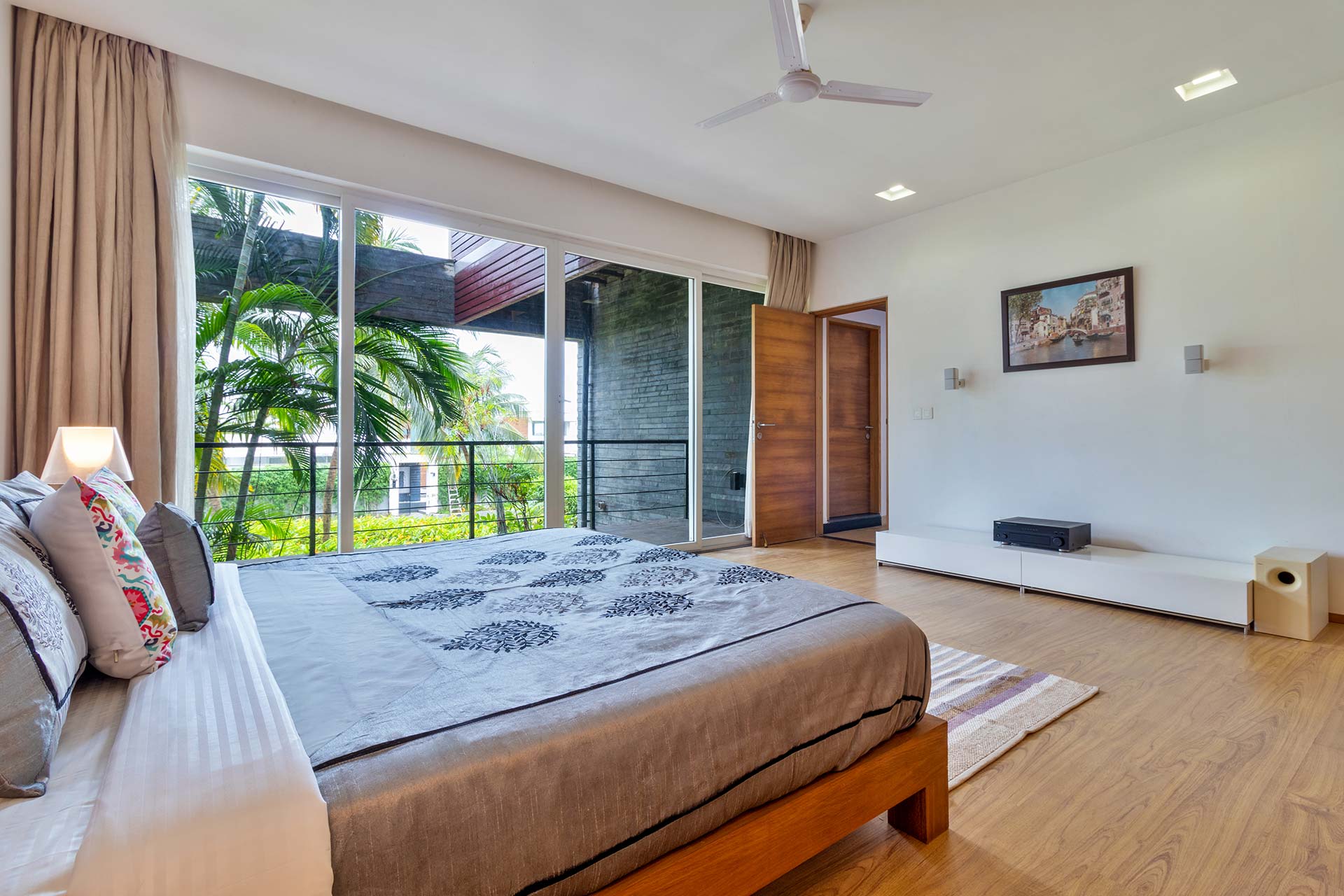 This is a spacious, air-conditioned bedroom on the lower level that opens up to an attached balcony overlooking the surroundings.