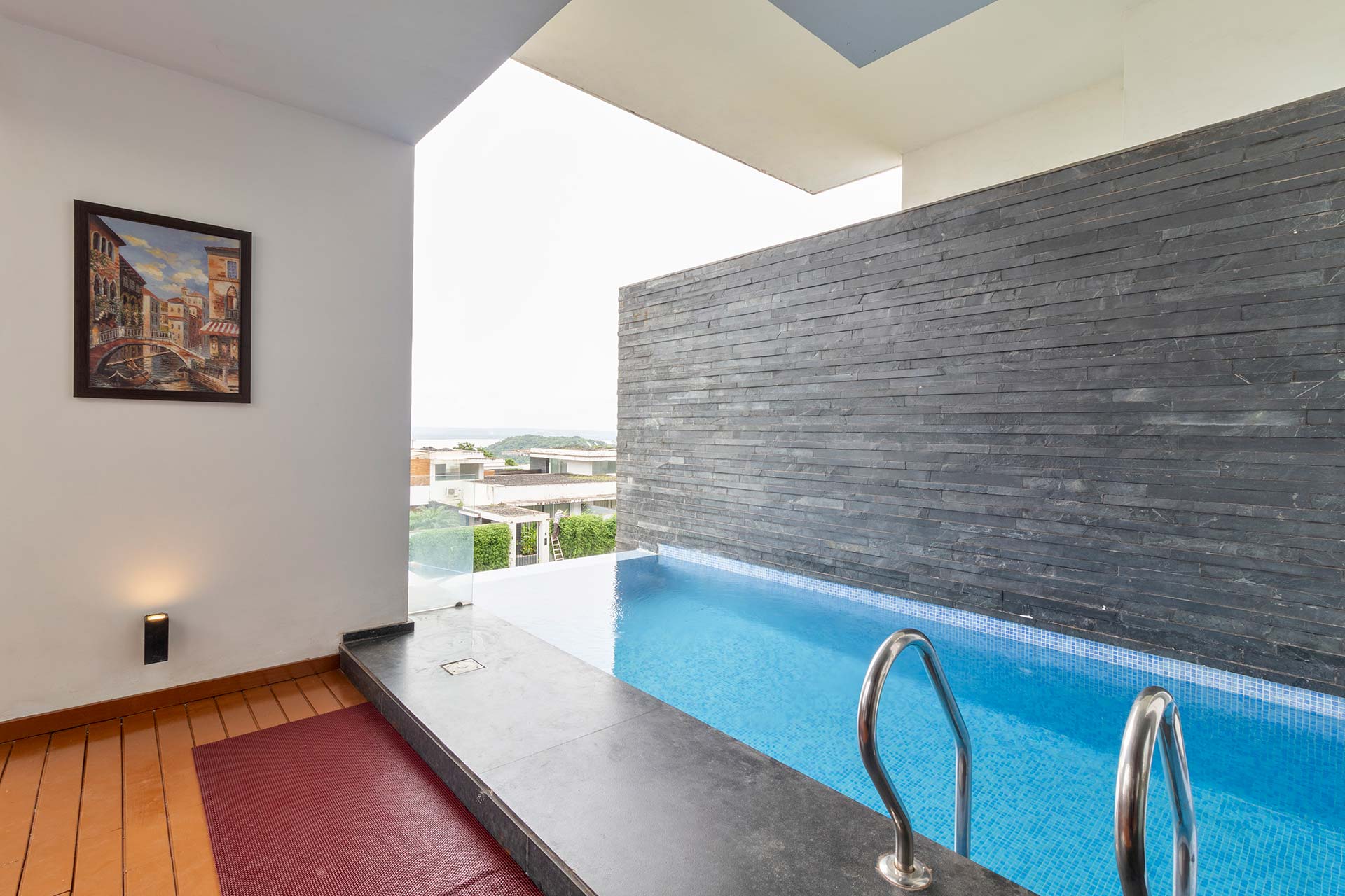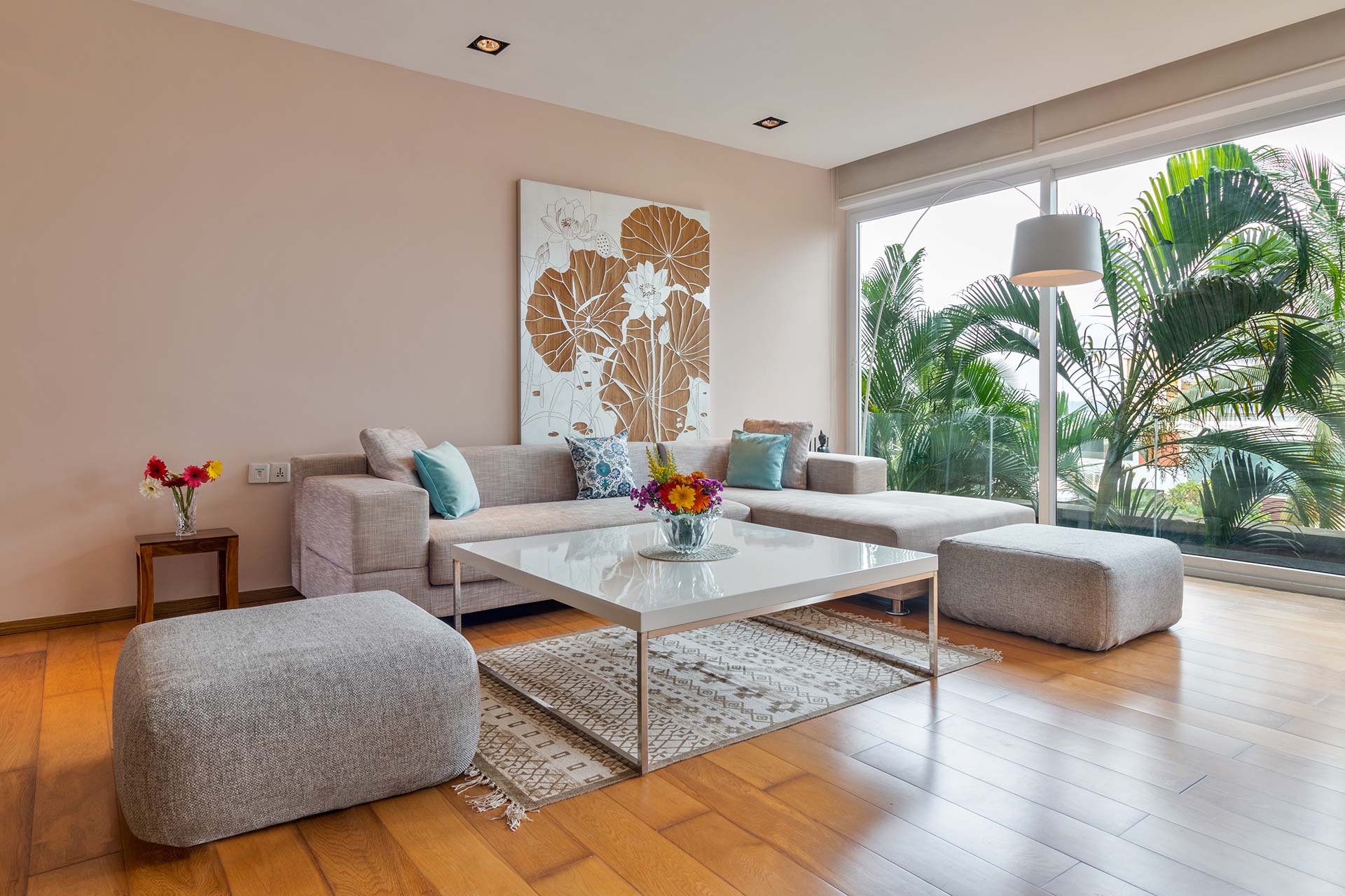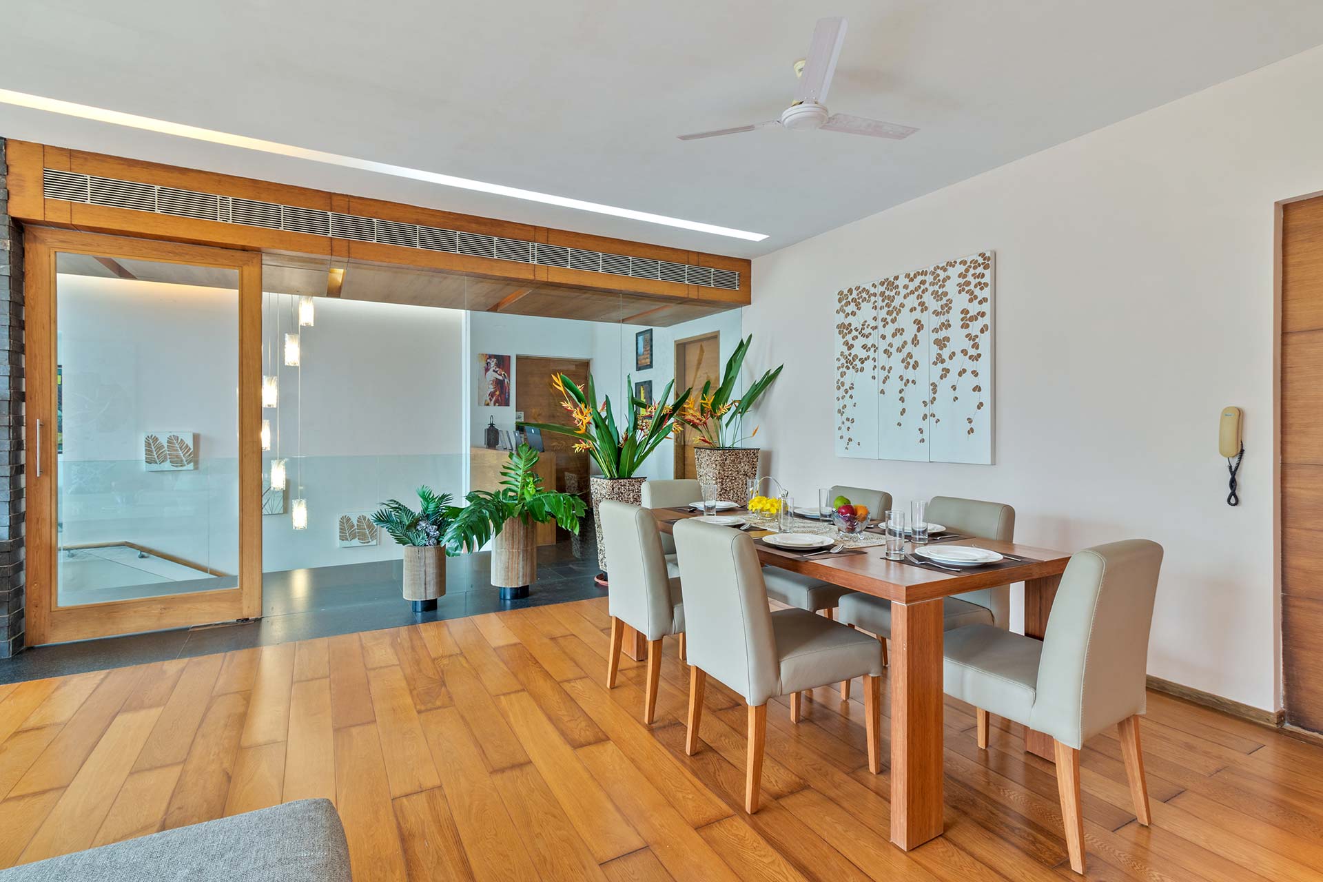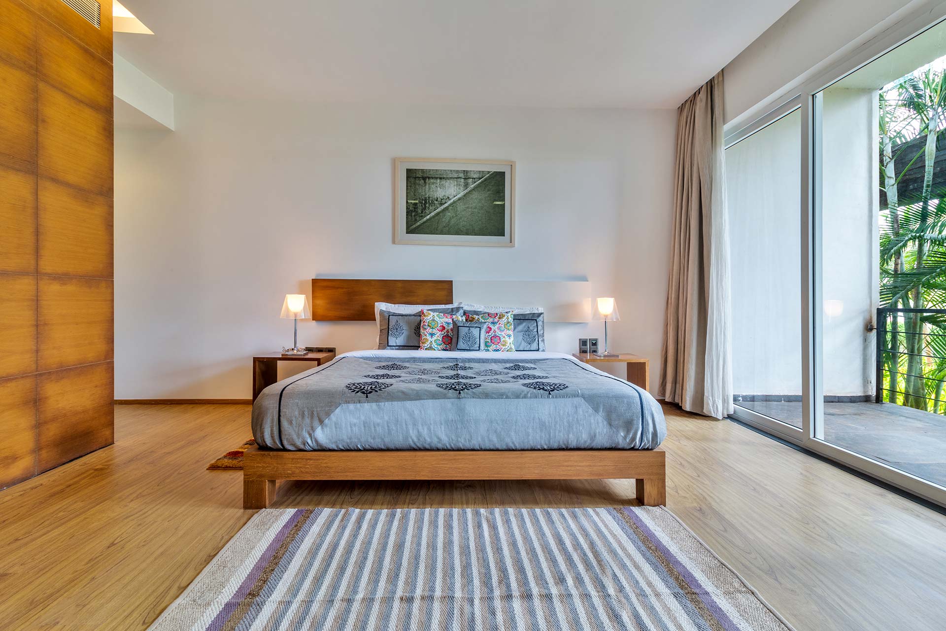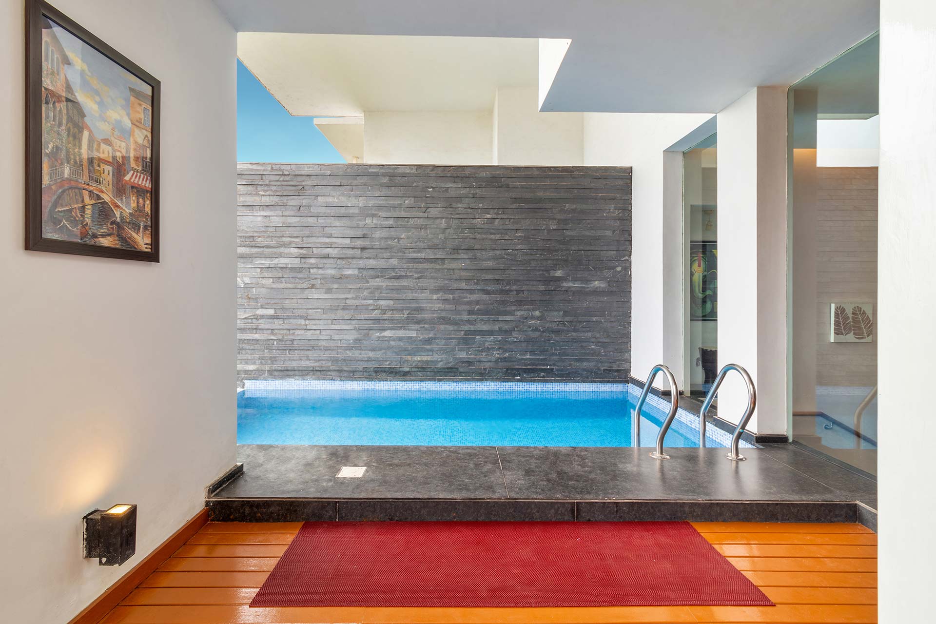 Escape the mundane to your own private oasis of solace and solitude – Acacia Skies is a luxurious holiday home nestled in the blissful neighbourhood of South Goa. Swathed in towering palms and verdant greenery, this modern duplex apartment is thoughtfully embellished with plush furnishings and stunning yet muted artworks. The wooden, muted palette follows throughout the home, echoing a soothing charm. If you wish to head out, Joets is just 7 minutes away where you can enjoy some amazing live music. After some fresh cocktails & a musical session, you can head to Hollant beach – a hidden gem where you can enjoy a nice swim. If you’re in the mood to speed things up a little, Panjim is 30 minutes away. Once you’re done exploring the city, the private swimming pool promises to be the perfect hang-out spot, whilst the balcony is ideal for relishing your morning tea, whilst savouring the partial landscapes of the river and clear skies. For a comfortable and secure stay, please take the time to read the Home Truths, House Rules and Policies thoroughly.