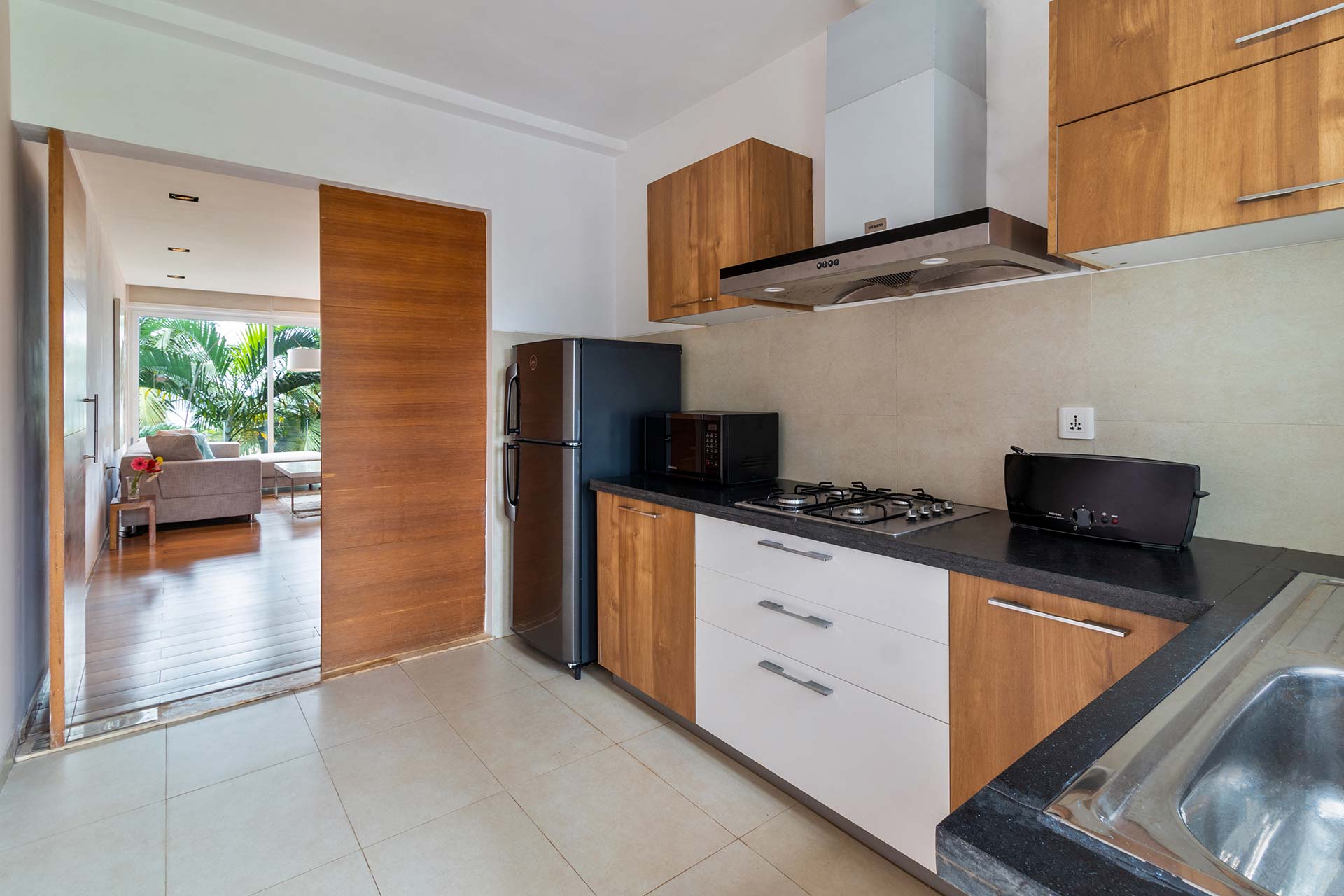 It is equipped with a microwave, gas stove, refrigerator, water purifier, toaster, crockery and cutlery.