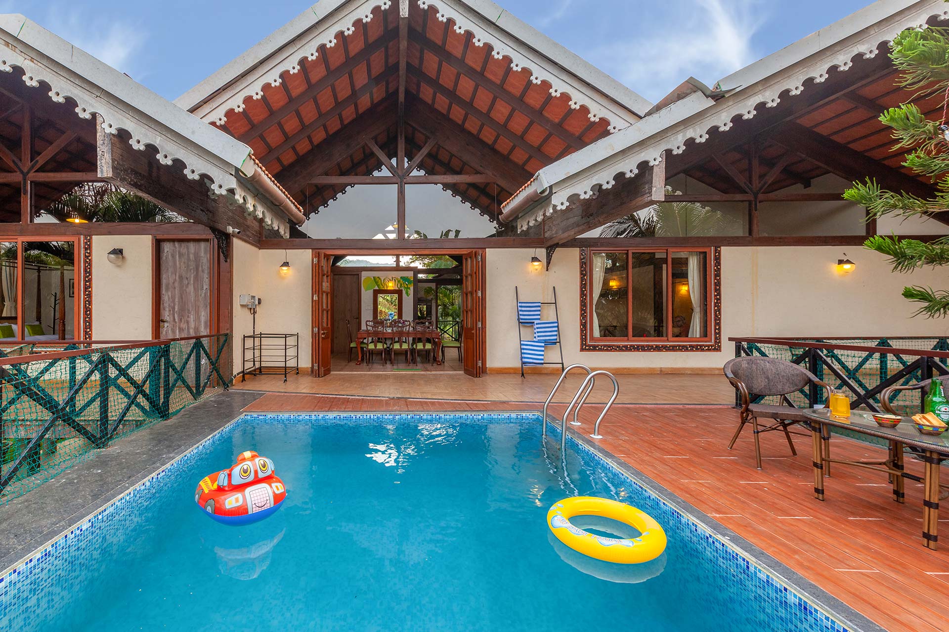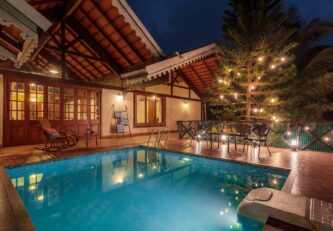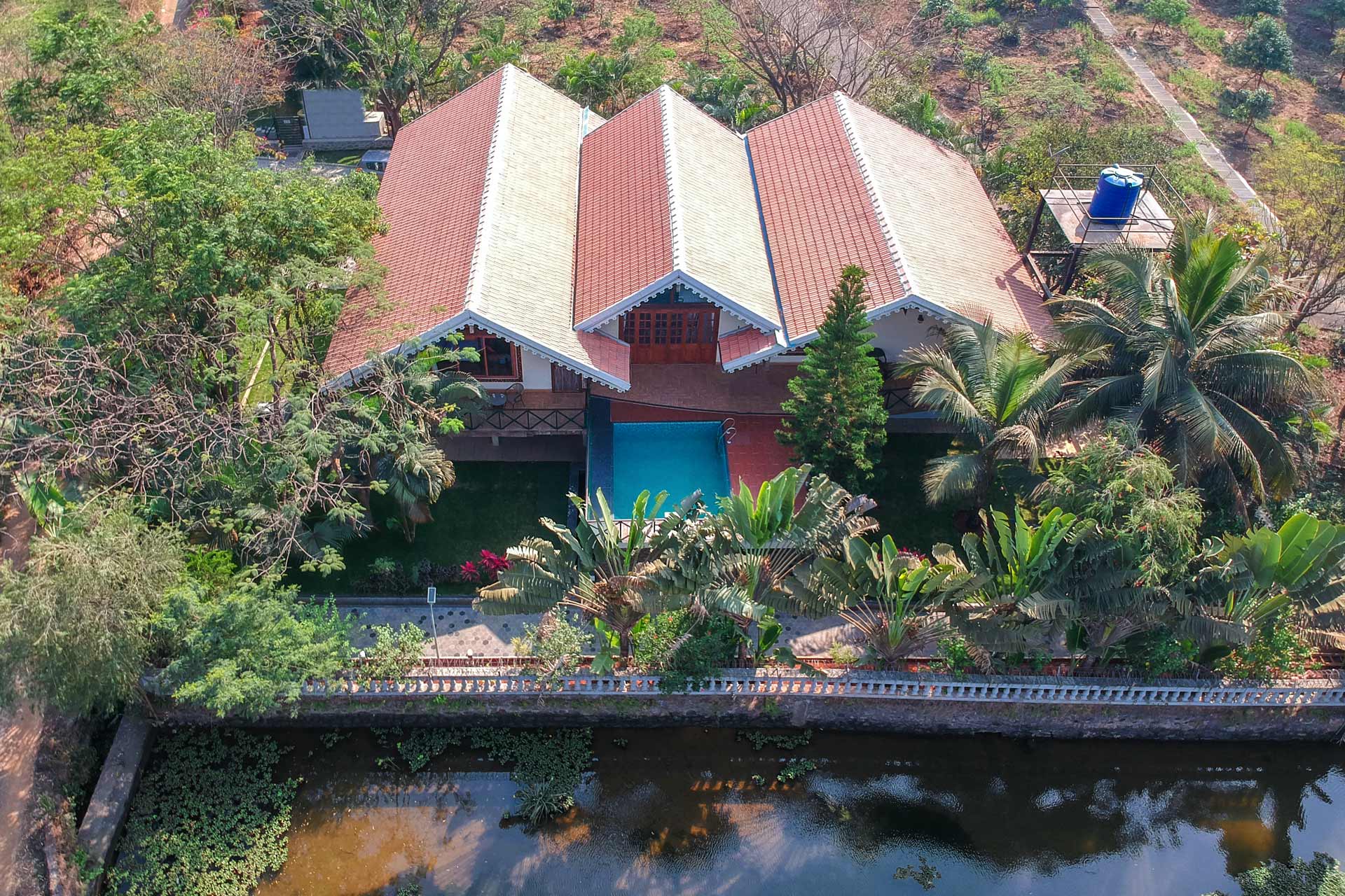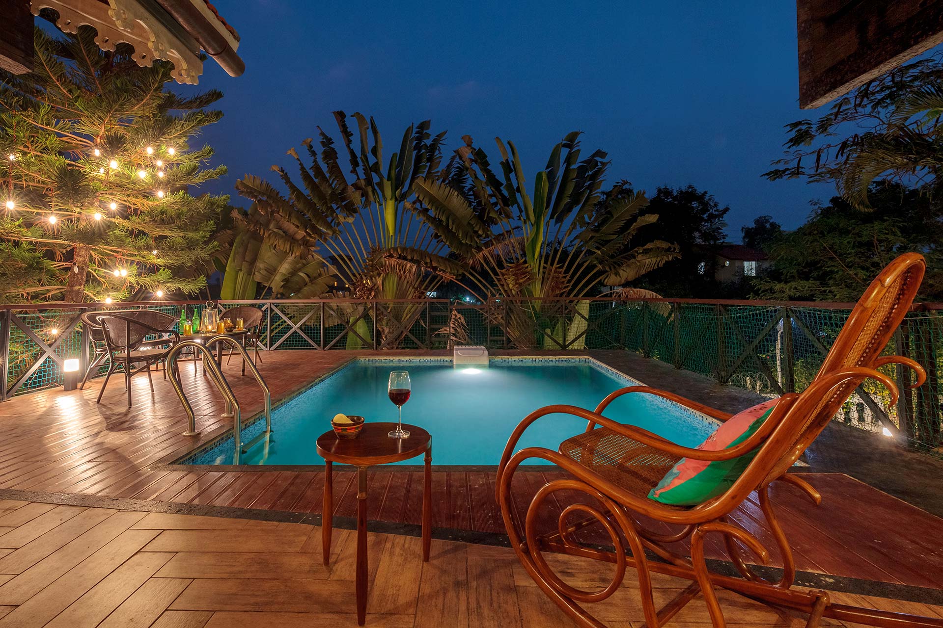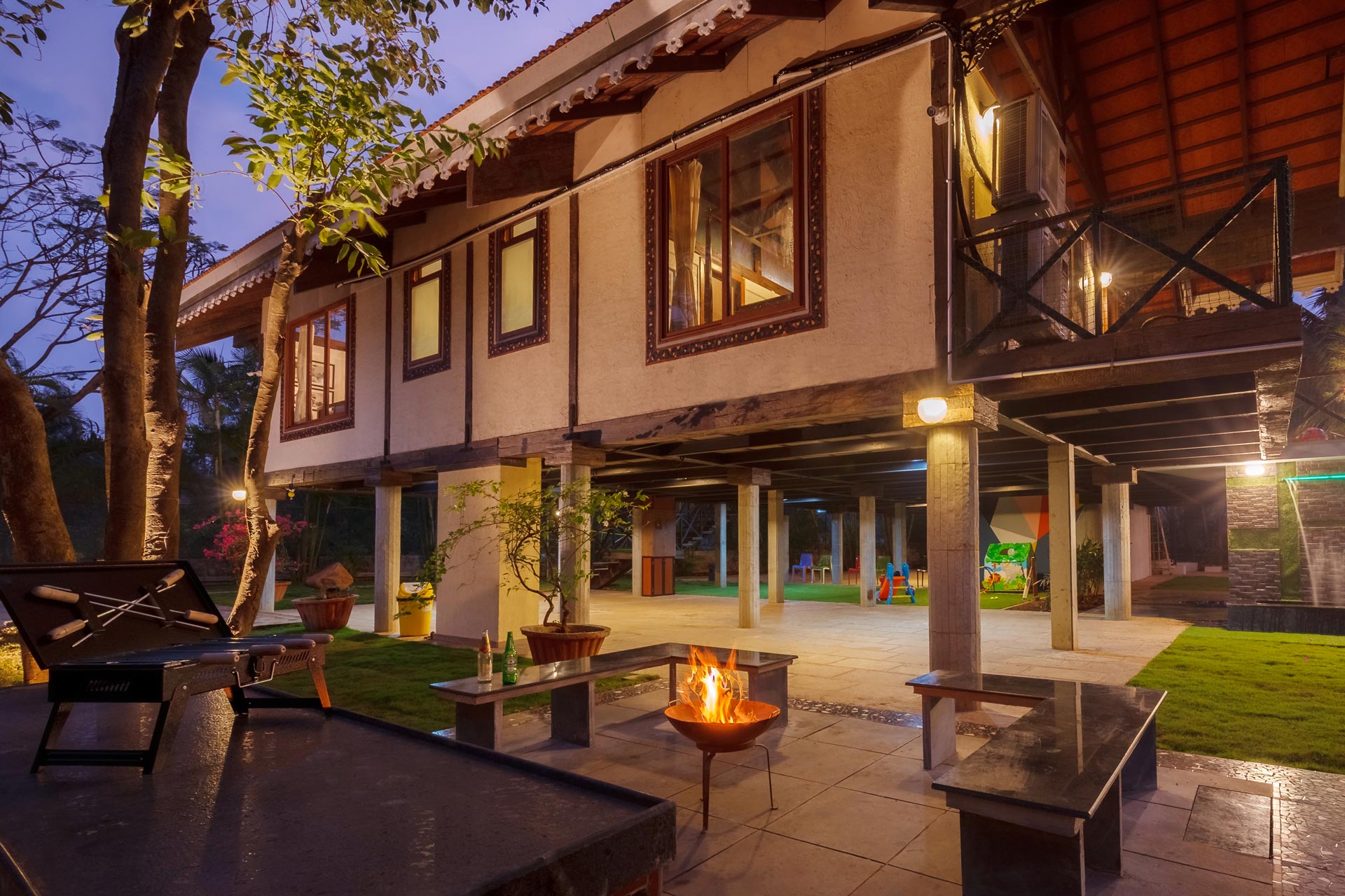 A melange of cosy indoor spaces and a brown wooden facade, this holiday home echoes an unmatchable earthy charm. Nestled amidst nature, the gorgeous structure, paired with a plethora of amenities offered, guarantee a getaway unlike any other. It features a private swimming pool overlooking the green surroundings and a living room that serves as a perfect reading spot. Tucked away from the prying eyes of the bustling city life, while here, you will be in the company of twittering birds and soothing landscapes, that promise a rejuvenating nature escape.