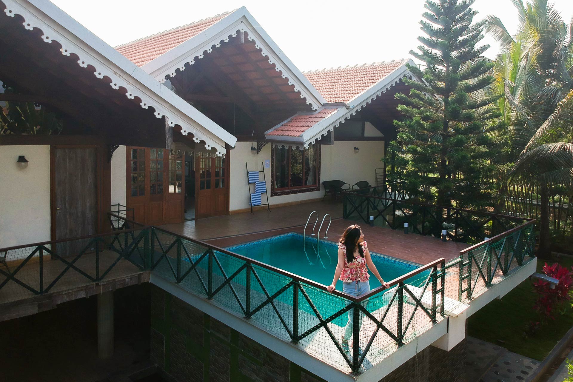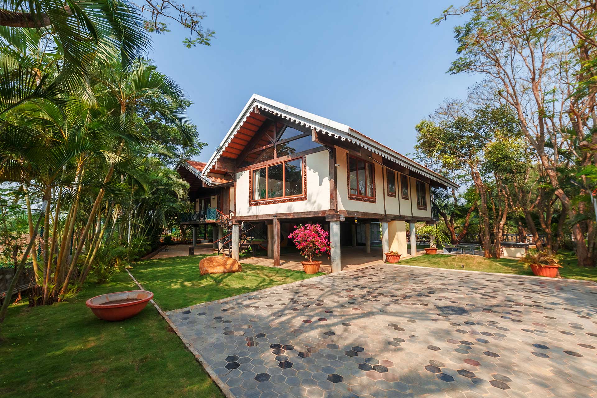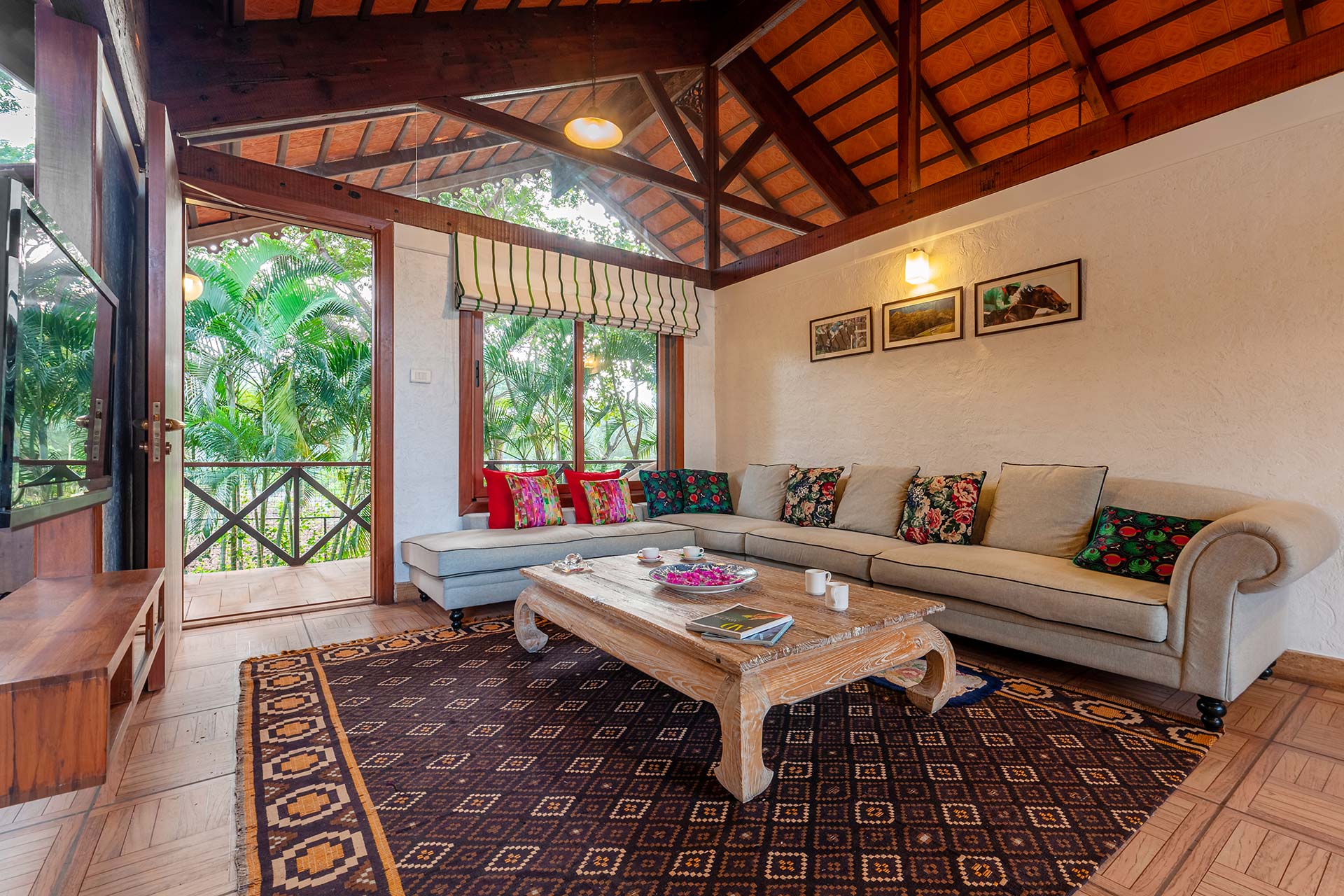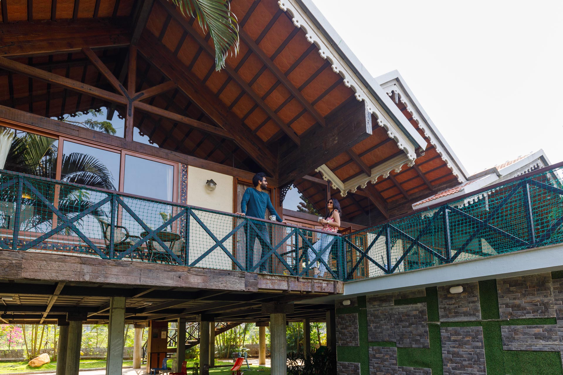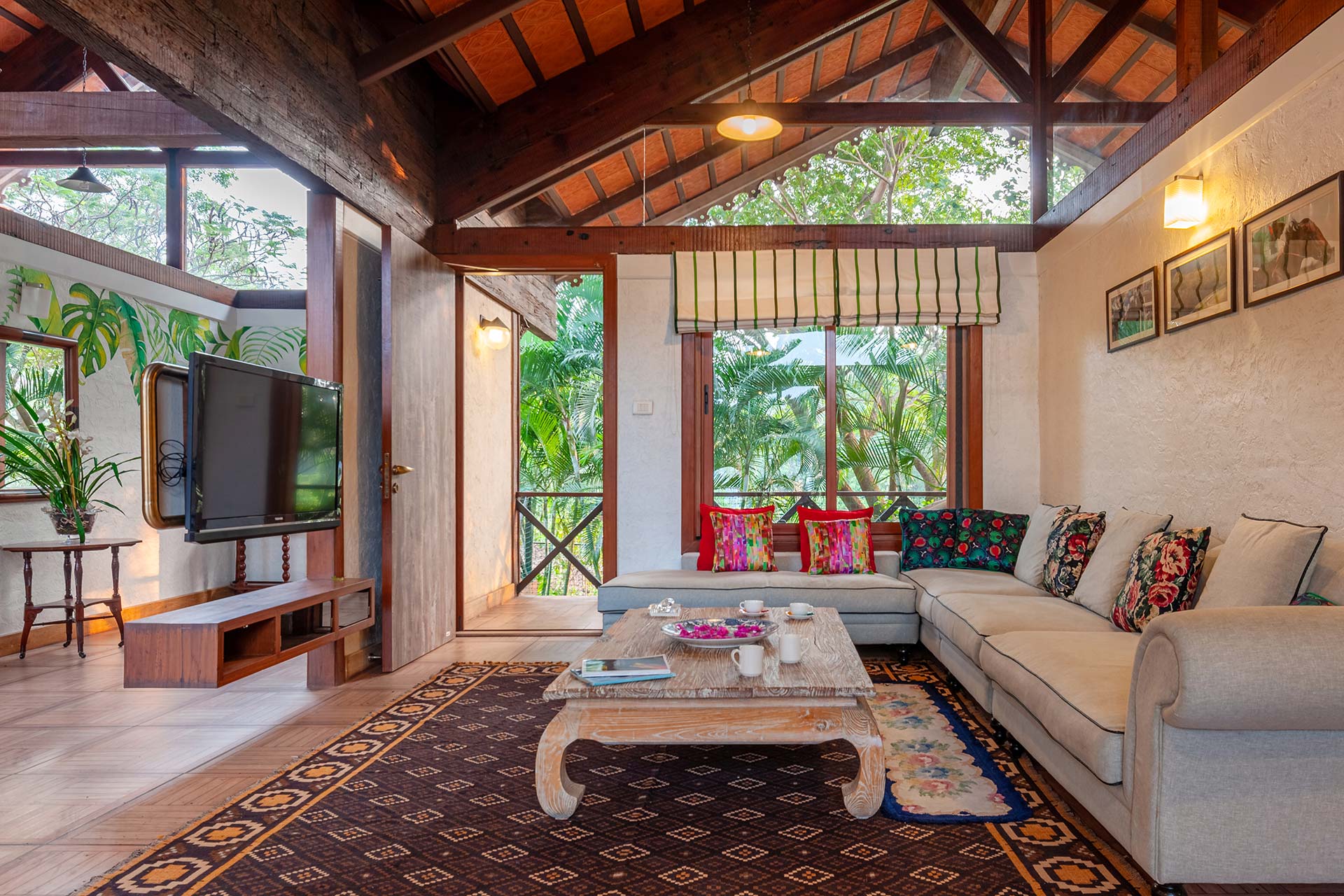 A melange of cosy indoor spaces and a brown wooden facade, this holiday home echoes an unmatchable earthy charm. Nestled amidst nature, the gorgeous structure, paired with a plethora of amenities offered, guarantee a getaway unlike any other. It features a private swimming pool overlooking the green surroundings and a living room that serves as a perfect reading spot. Tucked away from the prying eyes of the bustling city life, while here, you will be in the company of twittering birds and soothing landscapes, that promise a rejuvenating nature escape.