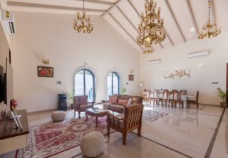 Behold the awe-inspiring Bellevue Palace, a lavish abode nestled in the heart of Nashik’s Grape County. The moment your eyes behold its palatial structure, you will be enraptured by its captivating beauty. The surrounding landscape is nothing short of enchanting, whisking you away to a world of opulence and grandeur. Once you enter the magnificent estate, you will be greeted by an opulent display of chic furnishings and all modern conveniences, ensuring that your stay is one of absolute comfort. The stylishly designed bar counter beckons you to unwind with a tantalising cocktail in hand while gazing out at the breathtaking view. The culinary offerings are nothing short of immersive, featuring a plethora of mouth-watering options, from sizzling BBQ to a live pizza counter, guaranteeing that your taste buds are in for an unforgettable treat.
