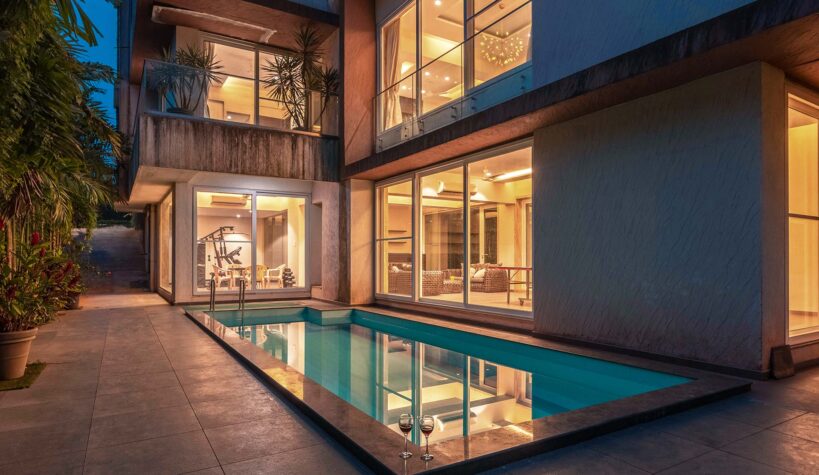 One of the most elegant homes we’ve seen, This villa is the perfect place for a luxurious getaway. Its muted interior colours are vibrantly lit, and make for a great backdrop to your holiday. With a Jacuzzi in the bathroom, a swing on the balcony, cosy sofas in the living room, and a beautiful gazebo outside, you will find it hard to pick your favourite spot here. If you would like to sneak in a workout, you may use the gym. This villa is perfect for a stay for a group of around 30 people, and it also offers the opportunity to host an event for up to 100 guests at an additional cost. Well worth a visit, we say!