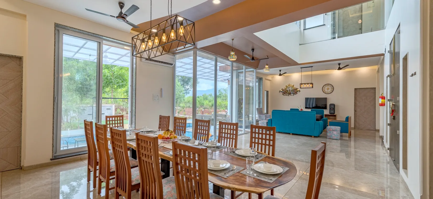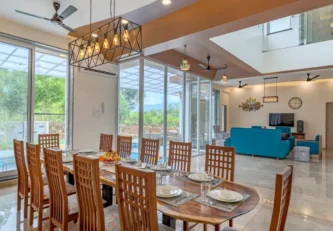 • As one of the best villas in Karjat, it first flaunts a large living room with French windows followed by an outdoor pool. The living room has a 12-seater dining table towards its left and a sitting area towards its right from where you can enter the pool deck.