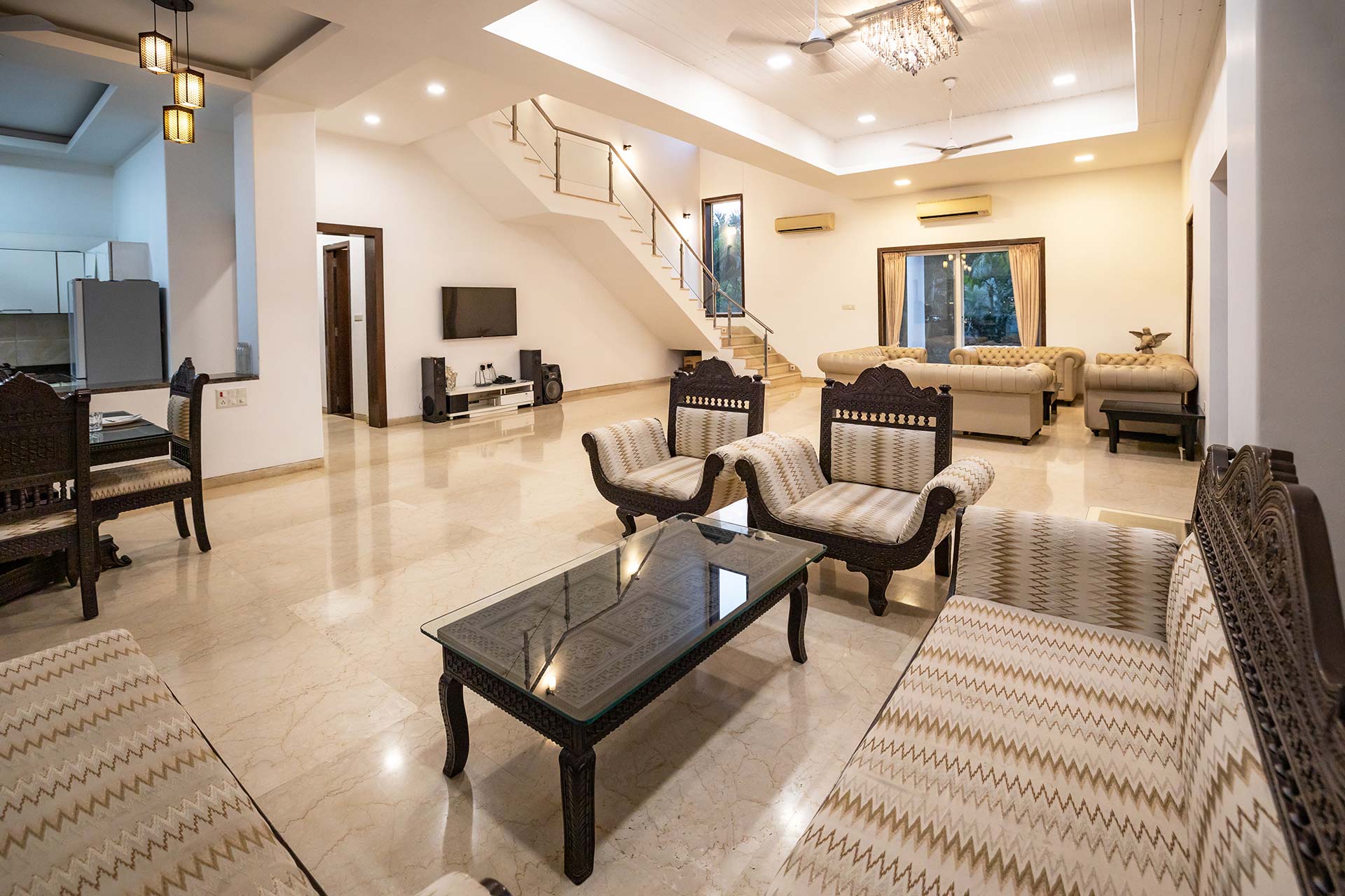 – The living room seats up to 18 people. It offers a music system and TV.