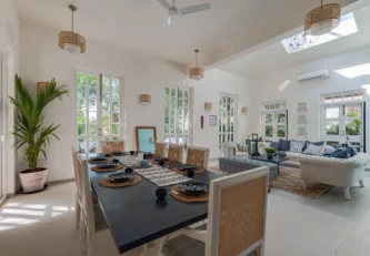 Villa D of Isprava’s gated community, Colina, exemplifies the Mediterranean design style and emphasises the indoor-outdoor living connect. The interiors are soothing with a primarily neutral grey-white colour palette, brought to life with blue accents. The large glass doors and windows of this Goan-Portuguese home, along with the stunning skylight in the living area, let in ample natural light and allow you to take in the lush green foliage. The dining area that opens out onto the private pool area, is perfect for a dinner soirée while the terrace, fitted with its own bar, is where you can enjoy your aperitifs. The 3 cozy bedrooms and den offer homely comforts and the best amenities for you to relax and unwind. Colina is truly a haven for city-dwellers. No two luxury homes here are alike and yet they maintain a beautiful sense of harmony. You can book multiple villas in the community for larger groups, while enjoying the privacy within your own villa. Conveniently located in Assagaon, Goa’s trendiest cafés and restaurants are right at your doorstep while the pristine beaches of Ashvem and Mandrem are just a short drive away.