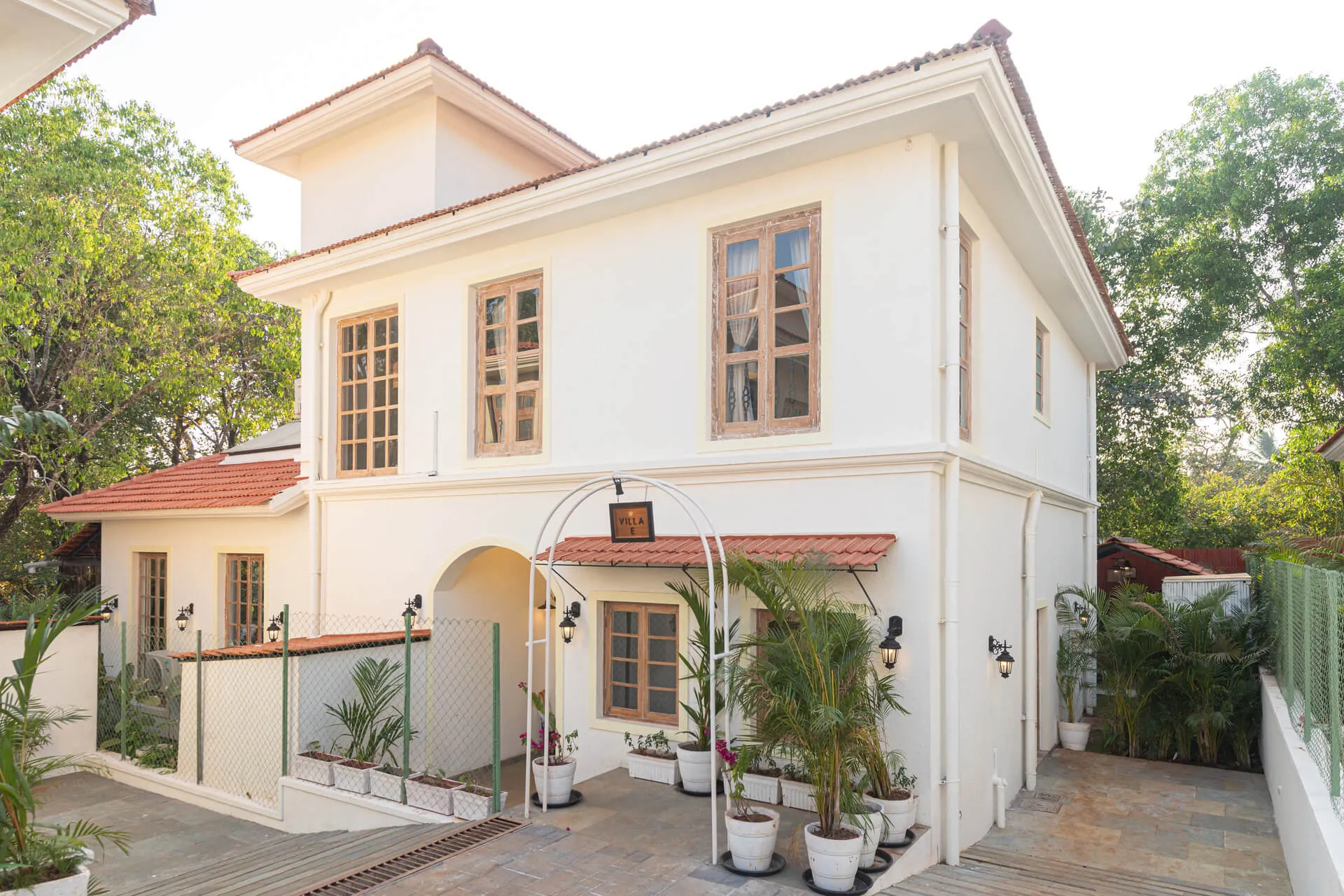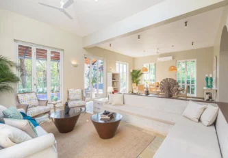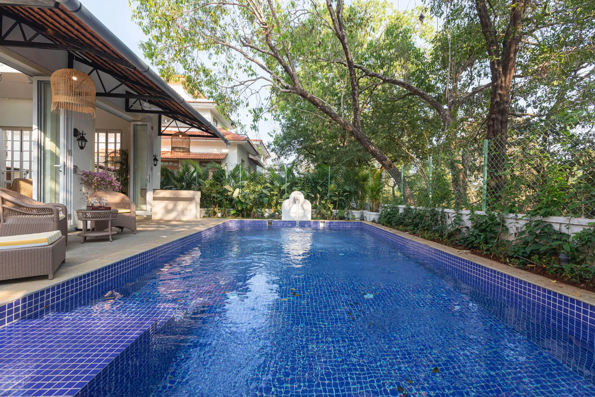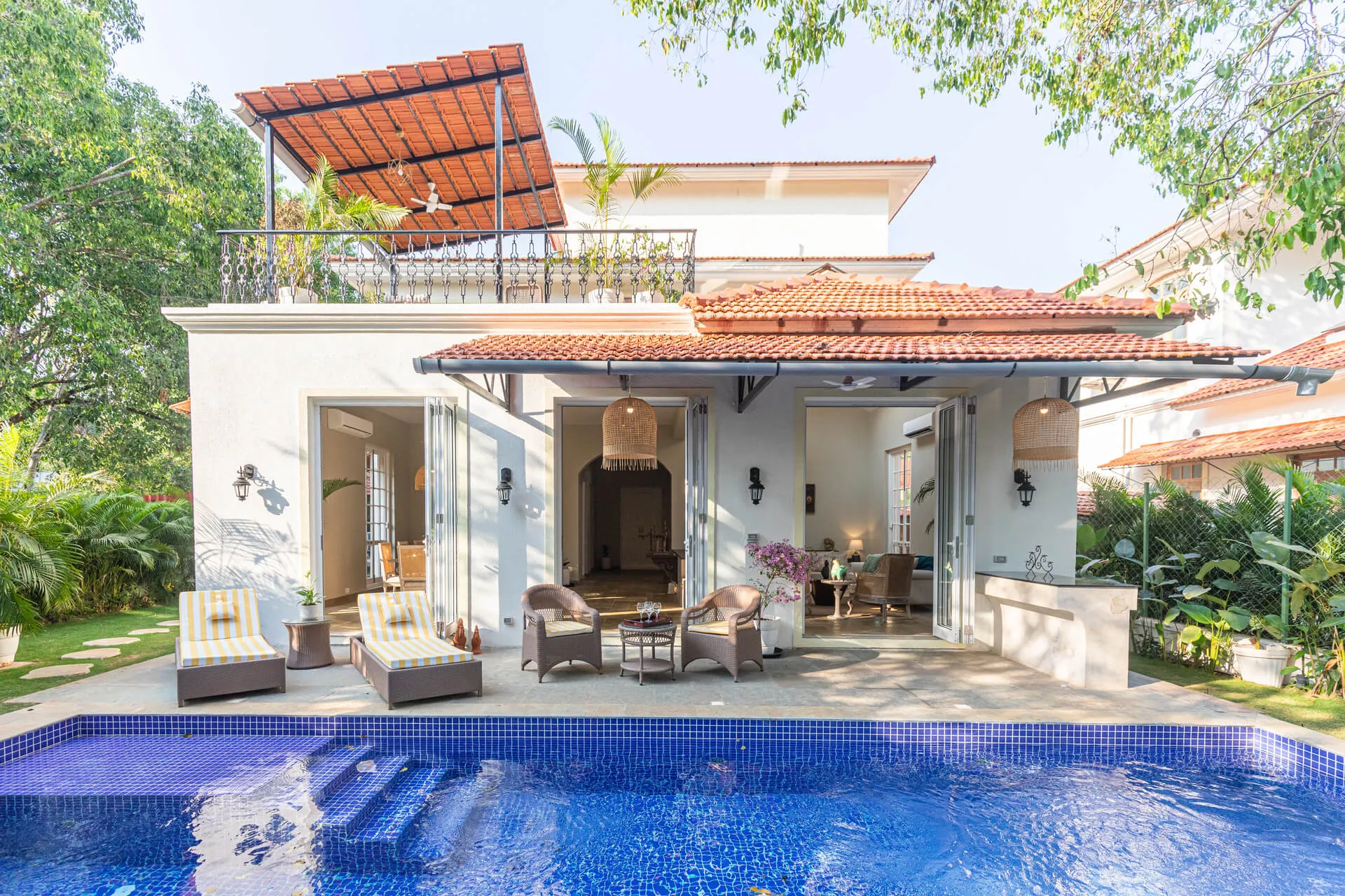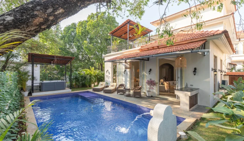 A sanctuary that offers you respite from the hustle and bustle of city life, Colina Villa E boasts a lush environment that is complemented by the Goan-Portuguese architecture. Indoors, earthy tones, rich wooden finishes and warm cane accents give the 3 ensuite bedrooms, the den and the living area a tranquil and calming vibe. Outdoors, the gorgeous cobalt blue pool, flanked by a jacuzzi, sets the stage for a relaxing day as you relish a steady stream of chilled beverages and your favourite nibbles, served by staff. The gazebo in the garden and the first floor terrace are great spaces for you and your loved ones to sit back and enjoy endless conversations.