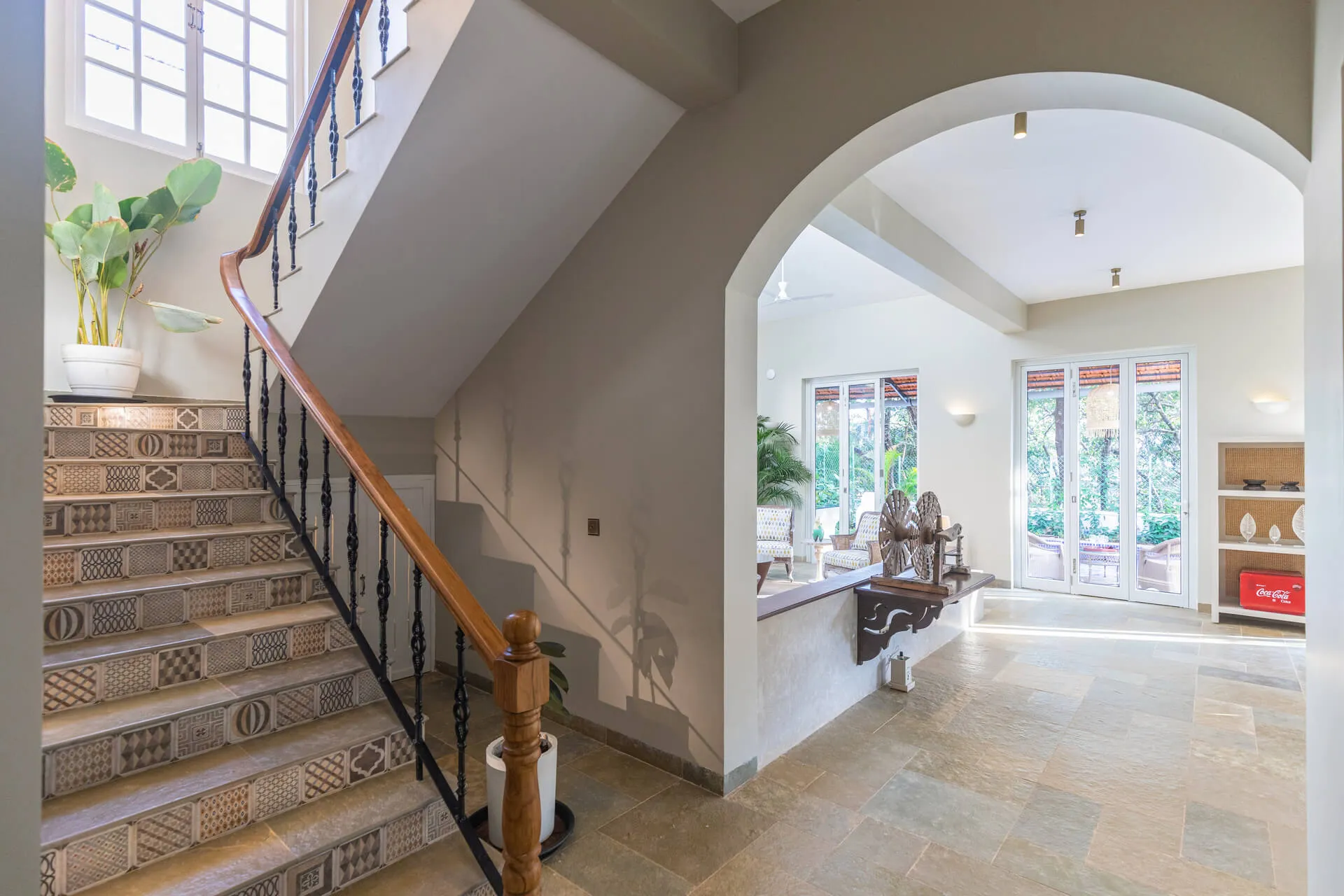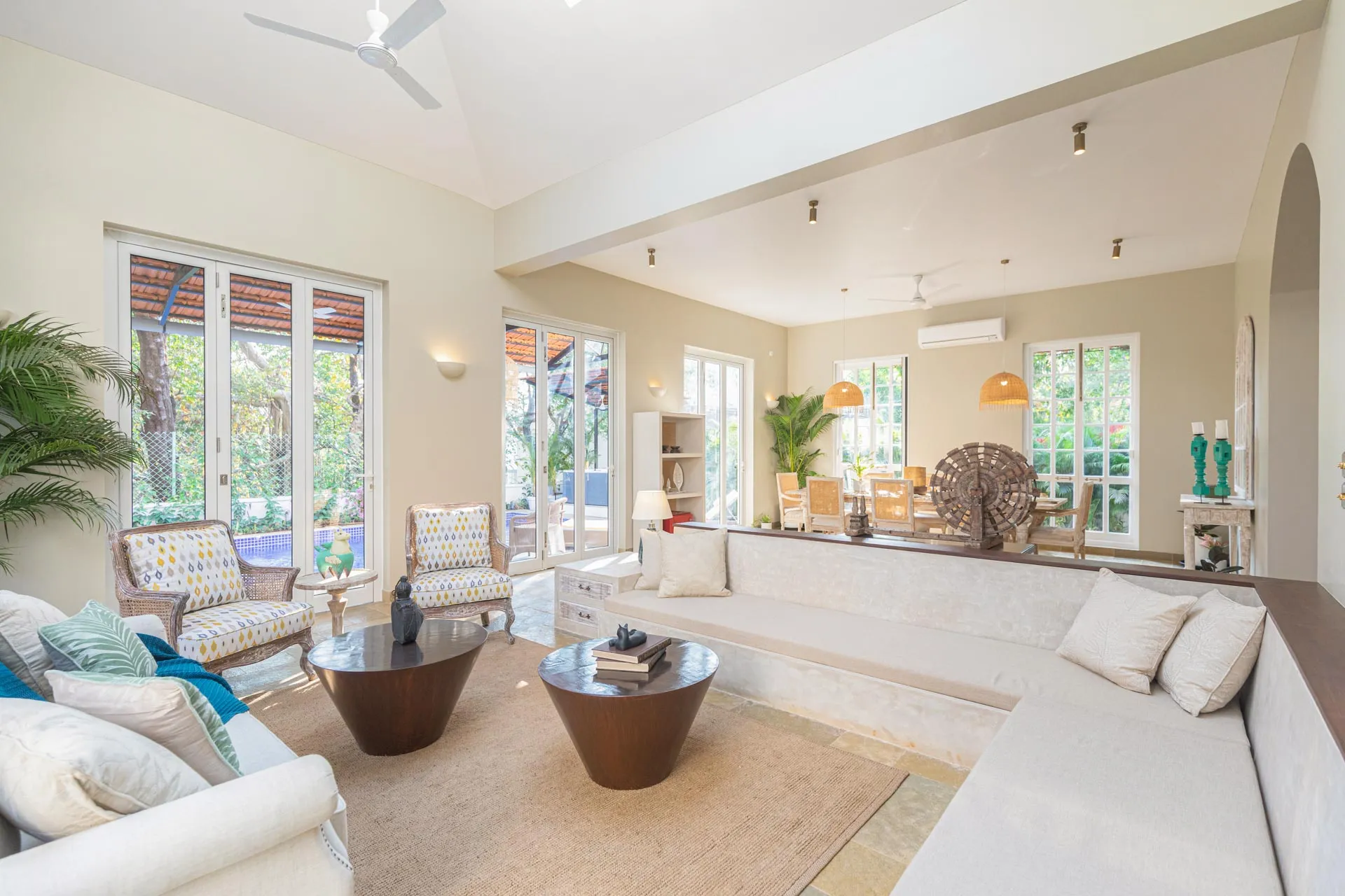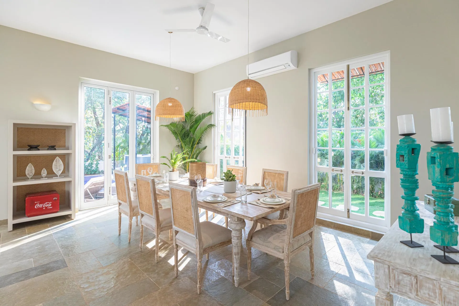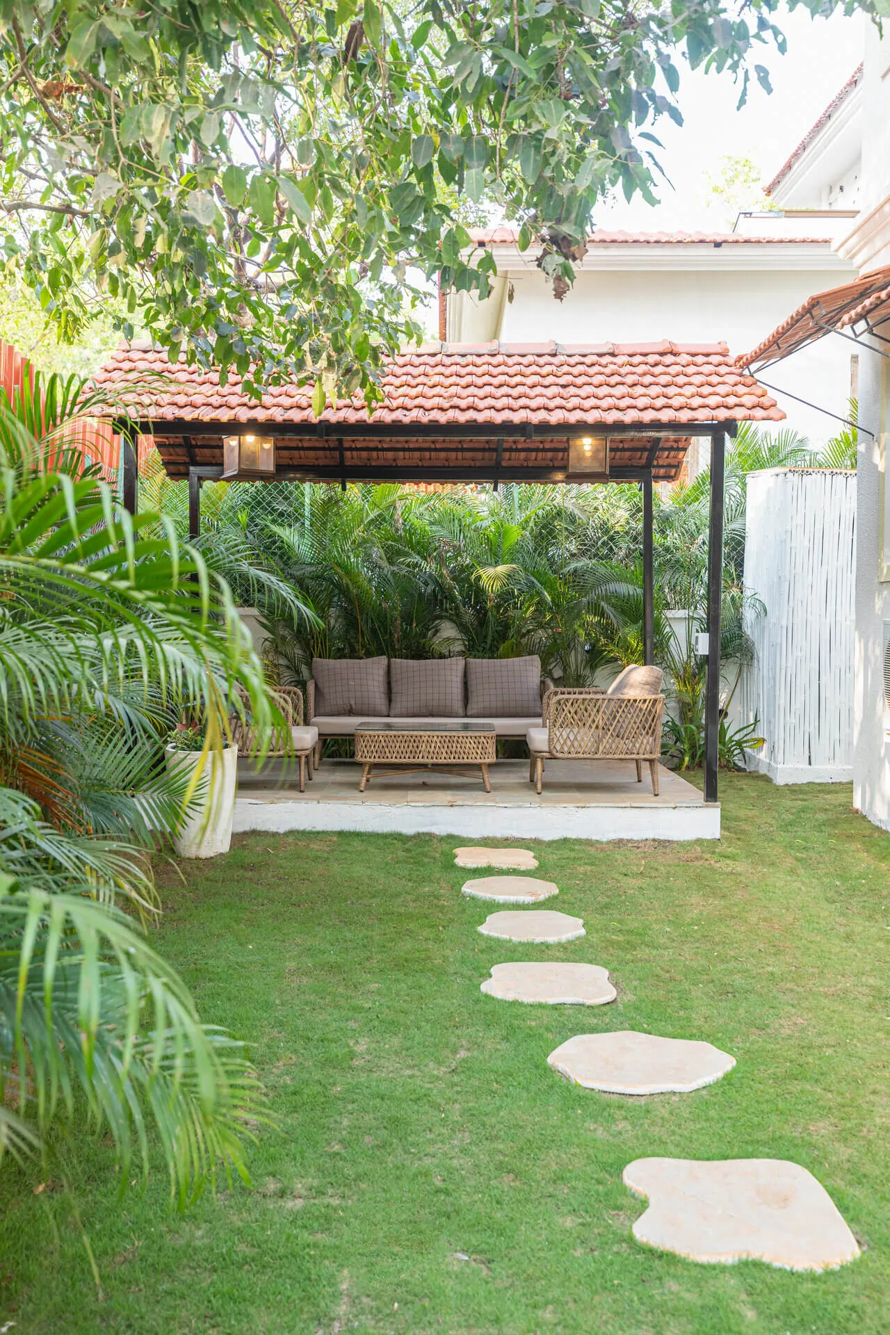 A sanctuary that offers you respite from the hustle and bustle of city life, Colina Villa E boasts a lush environment that is complemented by the Goan-Portuguese architecture. Indoors, earthy tones, rich wooden finishes and warm cane accents give the 3 ensuite bedrooms, the den and the living area a tranquil and calming vibe. Outdoors, the gorgeous cobalt blue pool, flanked by a jacuzzi, sets the stage for a relaxing day as you relish a steady stream of chilled beverages and your favourite nibbles, served by staff. The gazebo in the garden and the first floor terrace are great spaces for you and your loved ones to sit back and enjoy endless conversations.