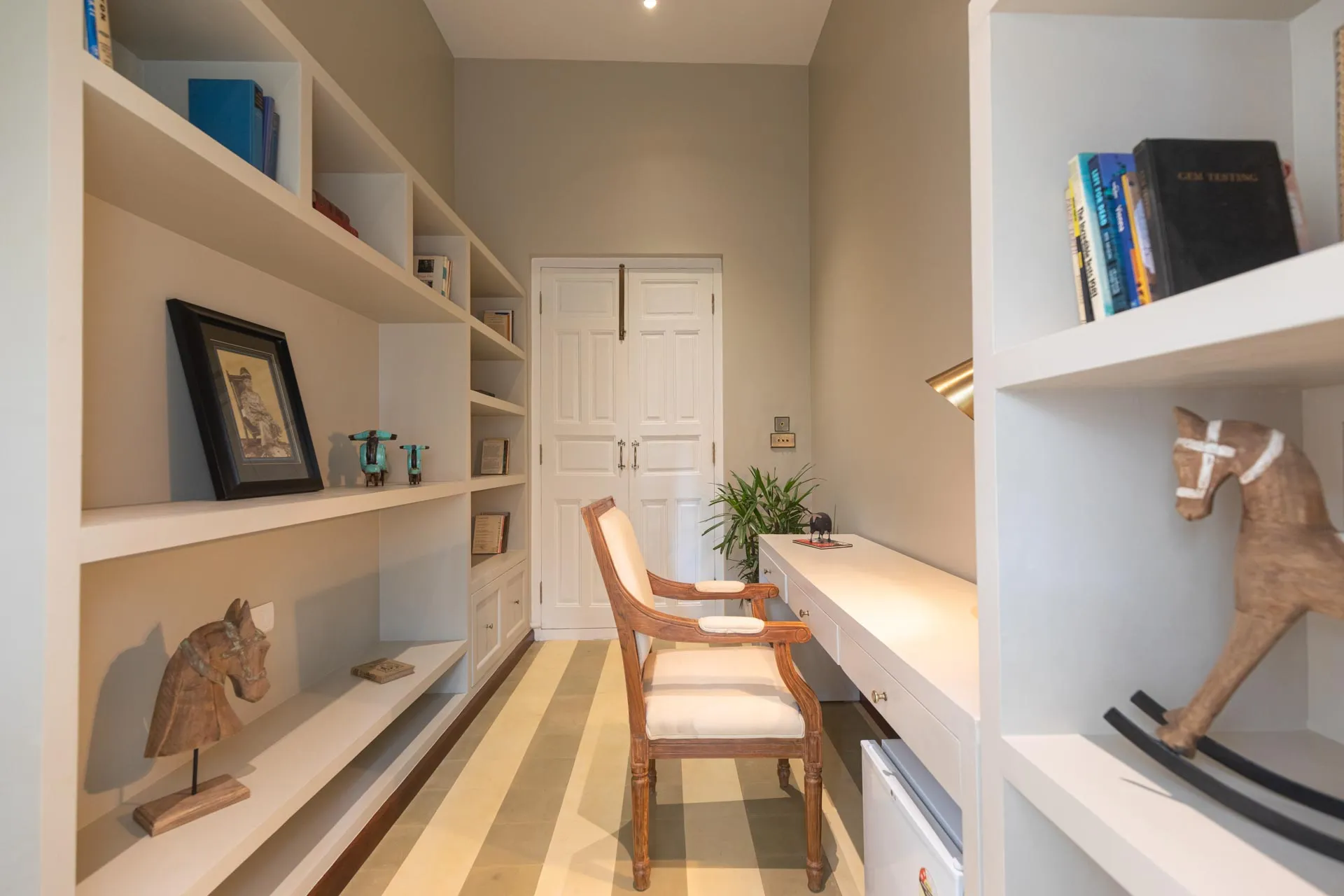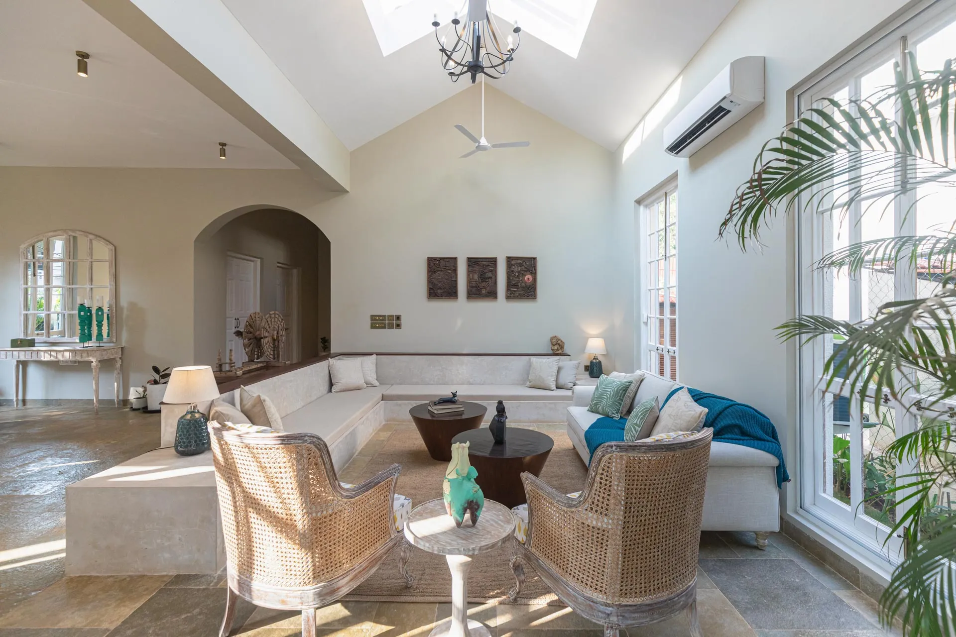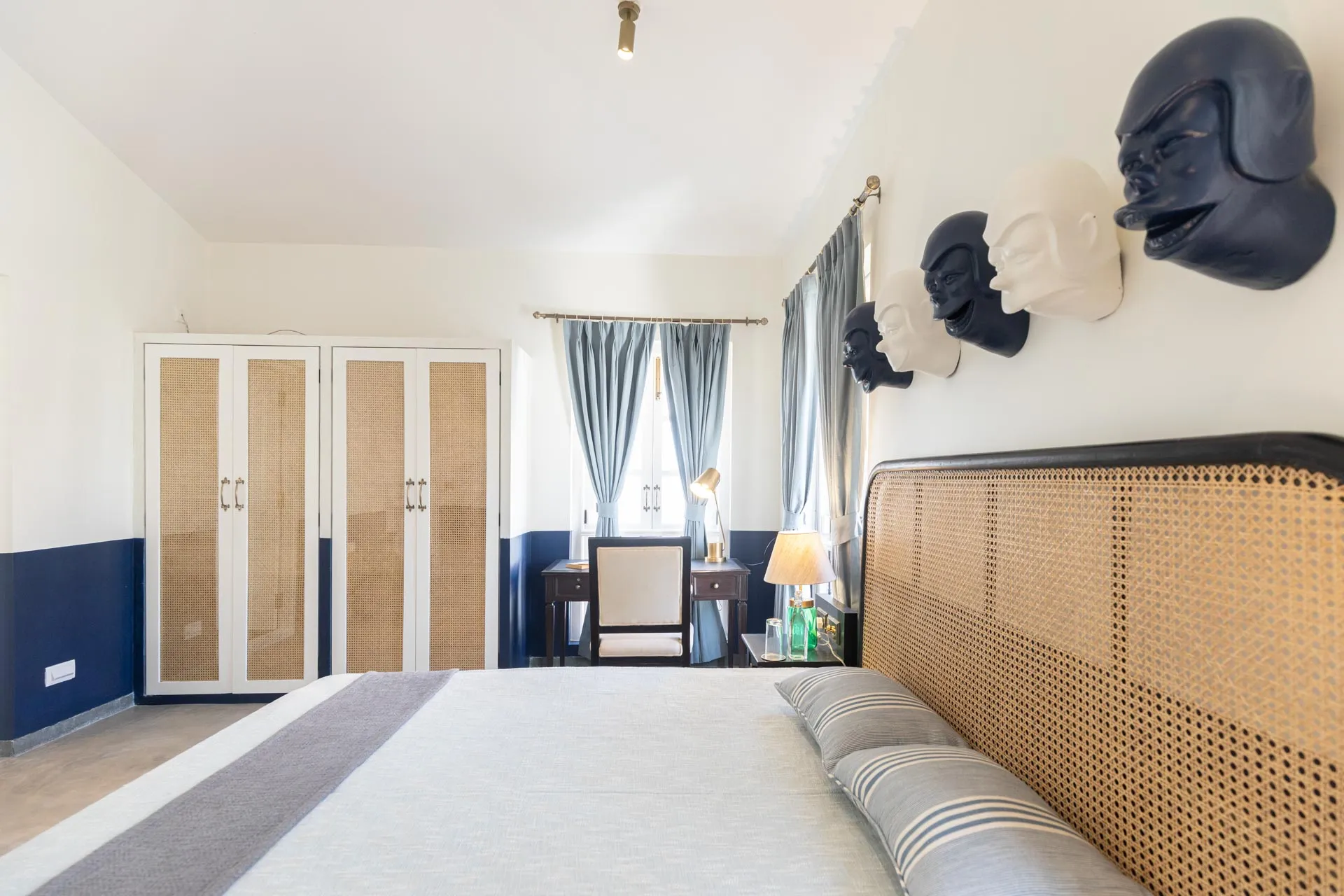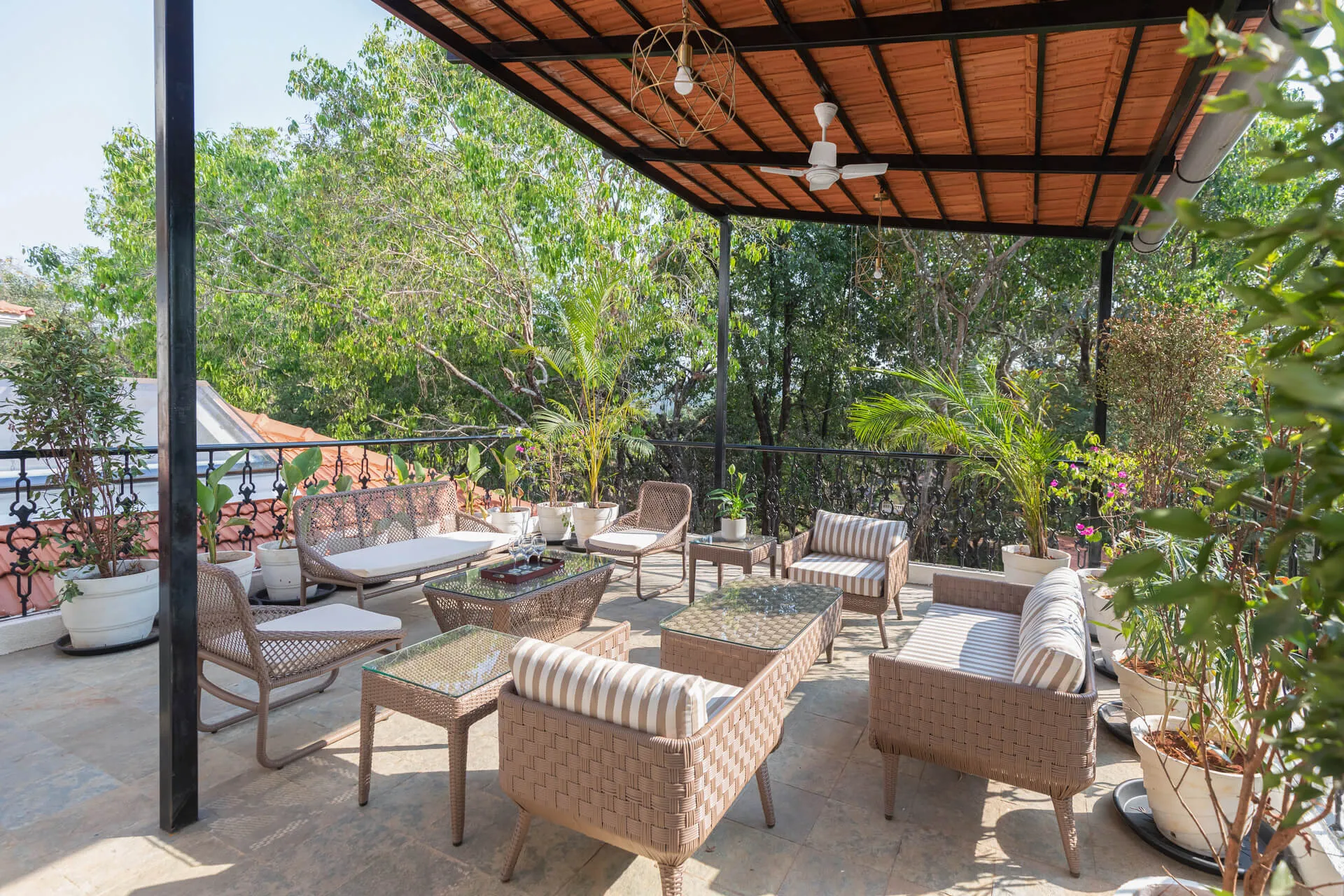 A sanctuary that offers you respite from the hustle and bustle of city life, Colina Villa E boasts a lush environment that is complemented by the Goan-Portuguese architecture. Indoors, earthy tones, rich wooden finishes and warm cane accents give the 3 ensuite bedrooms, the den and the living area a tranquil and calming vibe. Outdoors, the gorgeous cobalt blue pool, flanked by a jacuzzi, sets the stage for a relaxing day as you relish a steady stream of chilled beverages and your favourite nibbles, served by staff. The gazebo in the garden and the first floor terrace are great spaces for you and your loved ones to sit back and enjoy endless conversations.