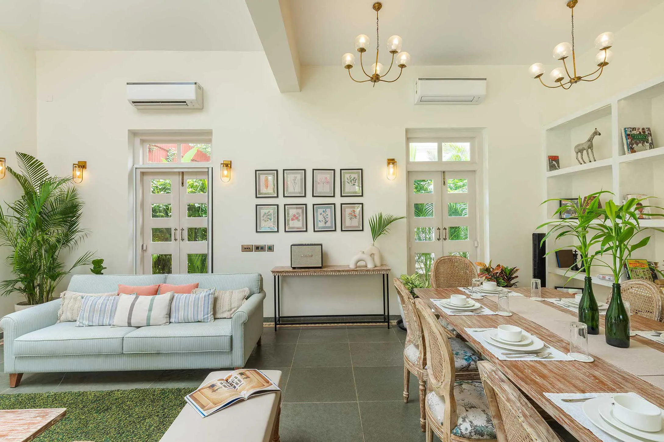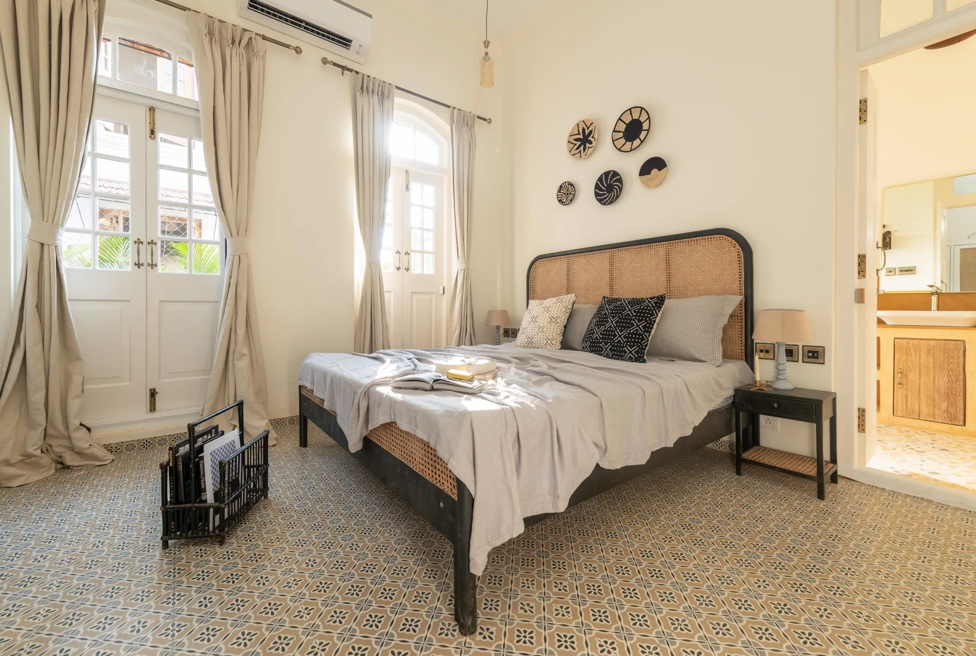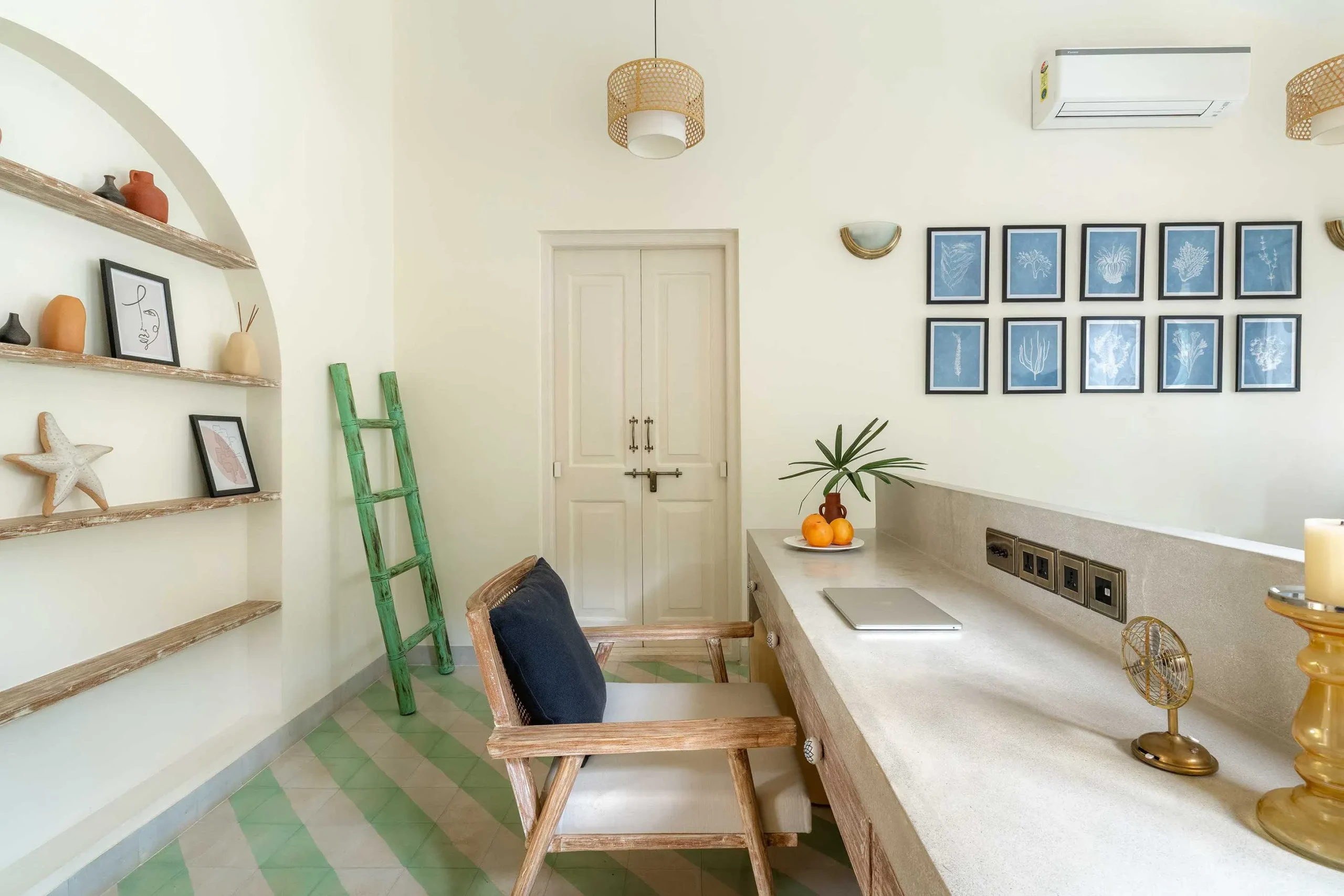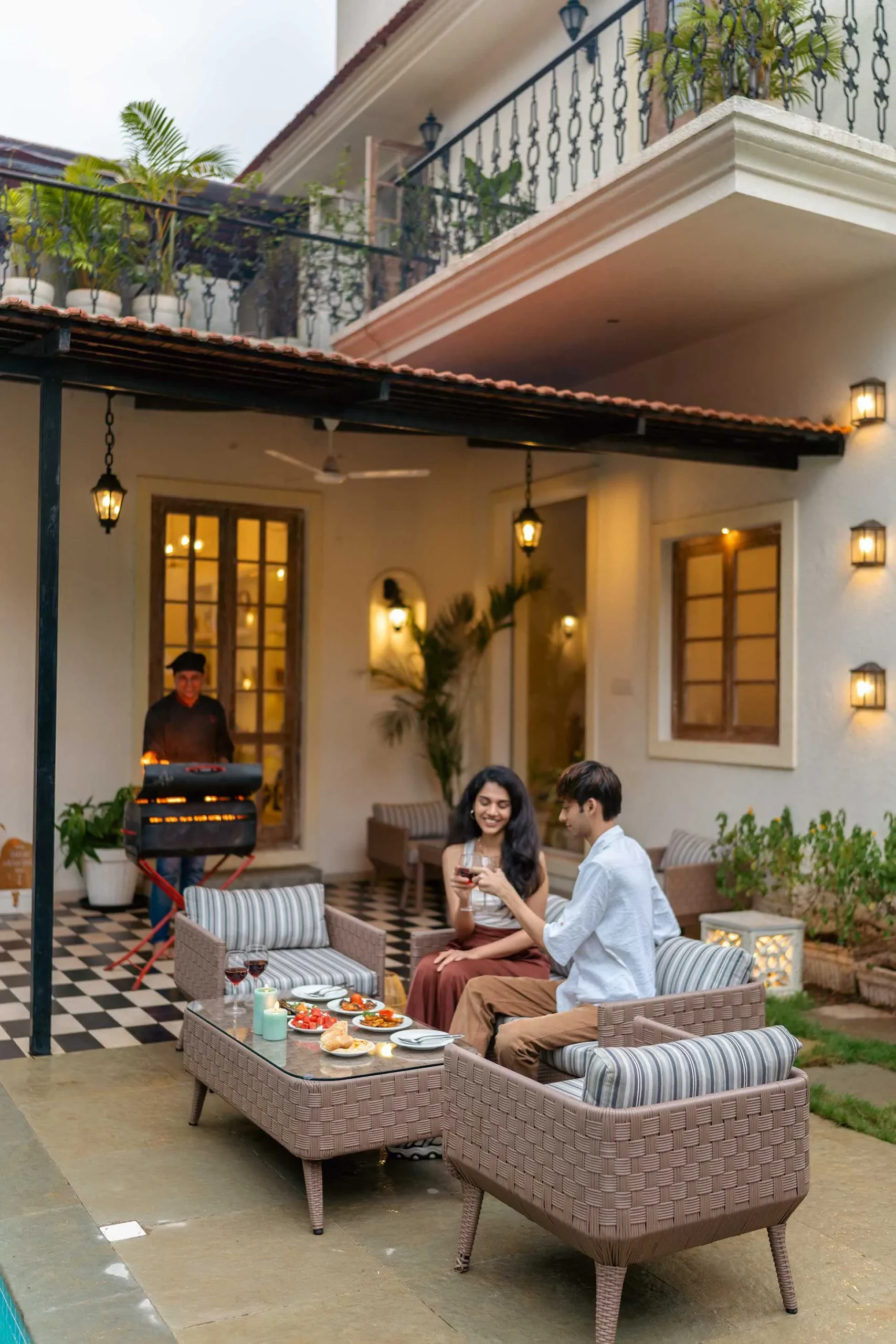 A stunning skylight enhances the light, airy atmosphere of the living space while the soothing colour palettes juxtaposed with patterned tiles in the 3 ensuite bedrooms create a playful harmony. With a private pool, terrace and multiple sit-outs, the Mediterranean-inspired Villa H encourages you to make the most of the balmy Goan weather. The semi-covered bar sets the tone for a revelrous evening with family or unending conversations with your confidants.