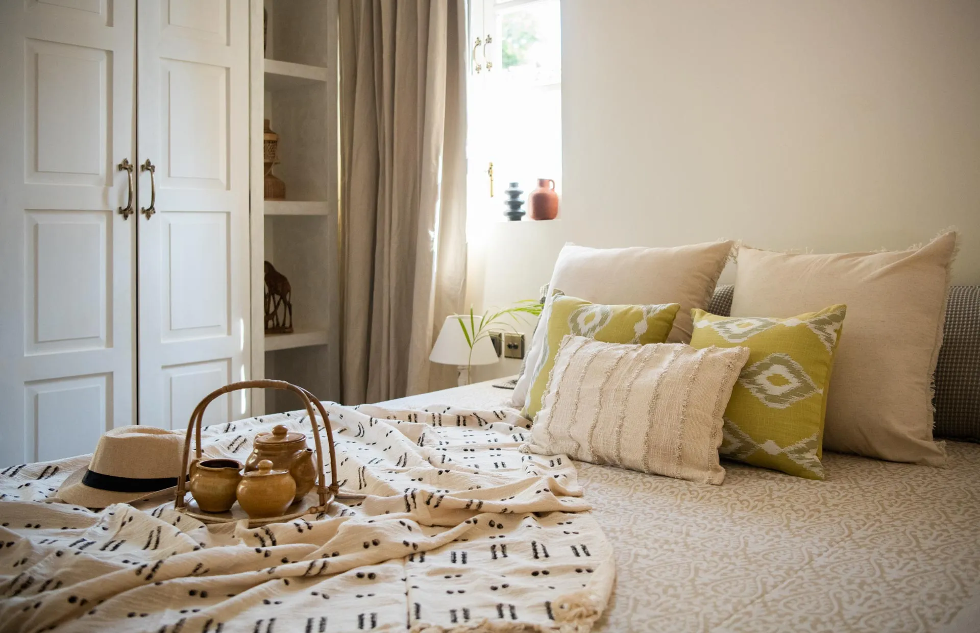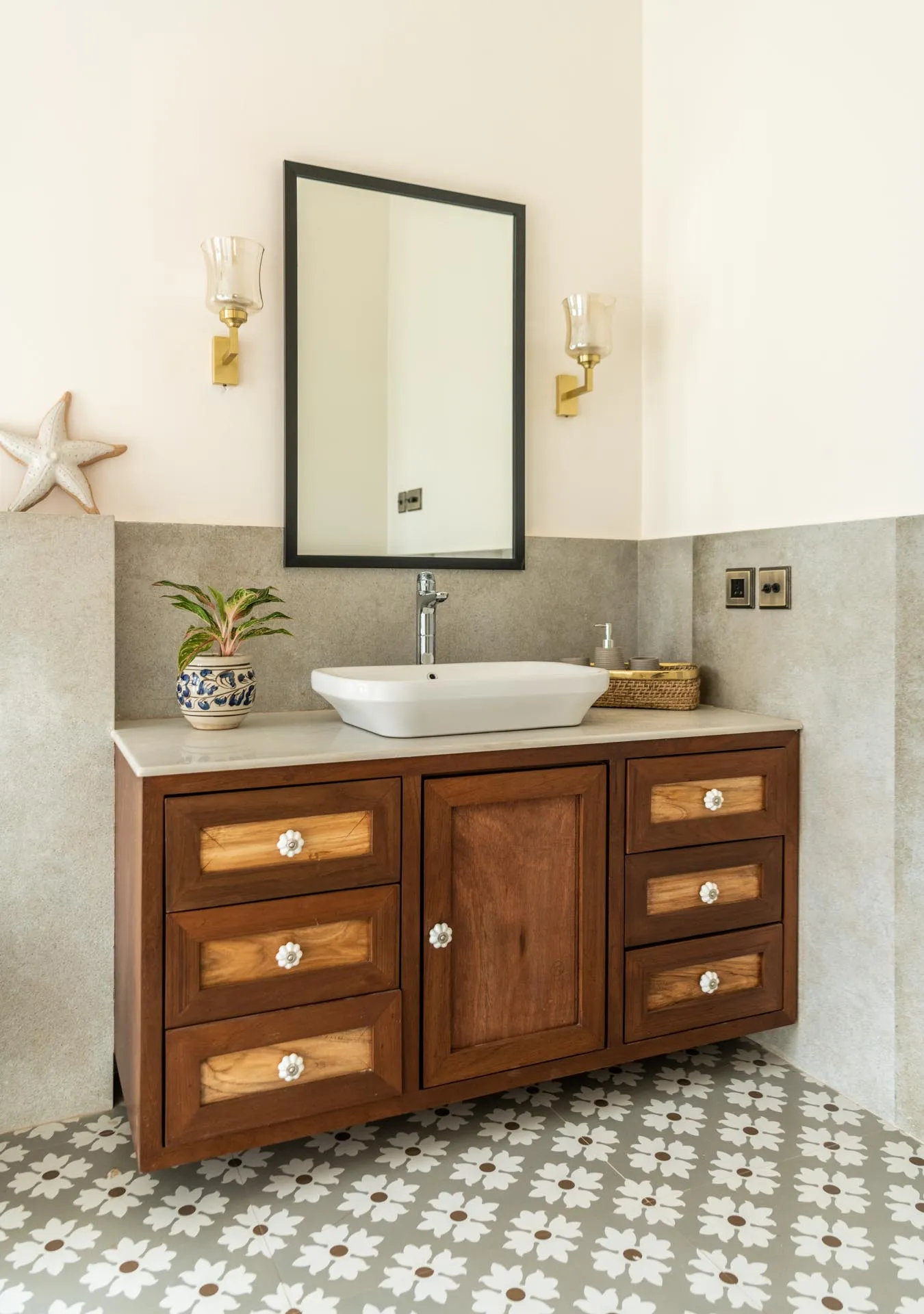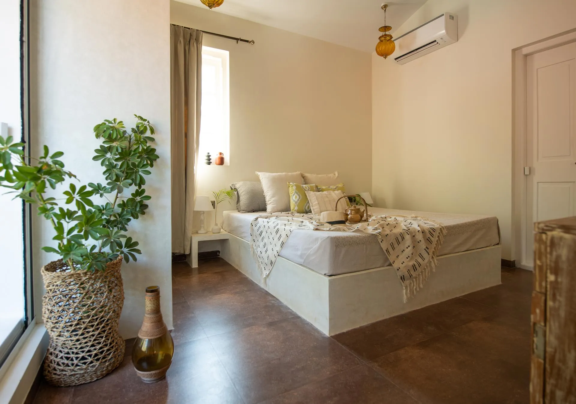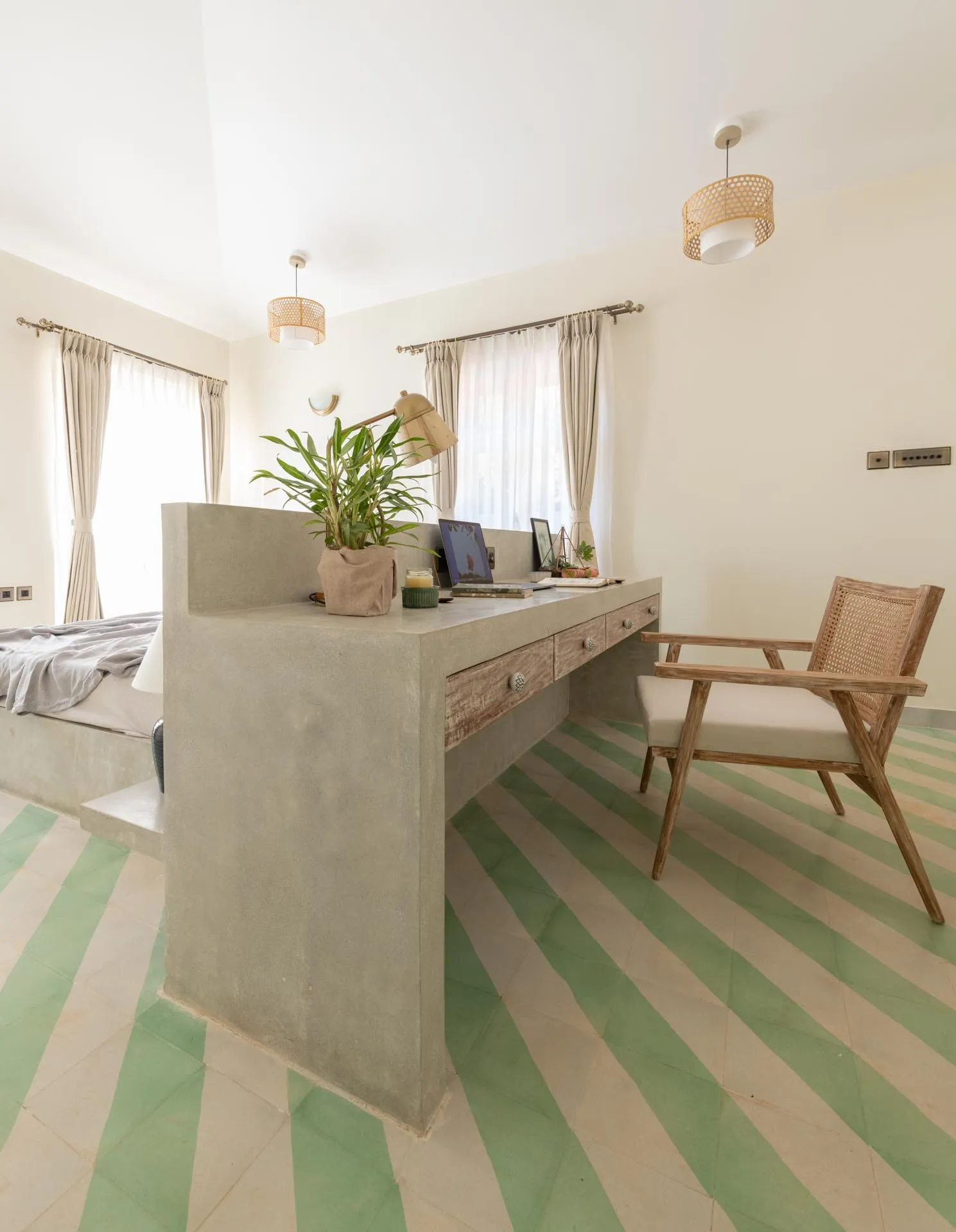 A stunning skylight enhances the light, airy atmosphere of the living space while the soothing colour palettes juxtaposed with patterned tiles in the 3 ensuite bedrooms create a playful harmony. With a private pool, terrace and multiple sit-outs, the Mediterranean-inspired Villa H encourages you to make the most of the balmy Goan weather. The semi-covered bar sets the tone for a revelrous evening with family or unending conversations with your confidants.