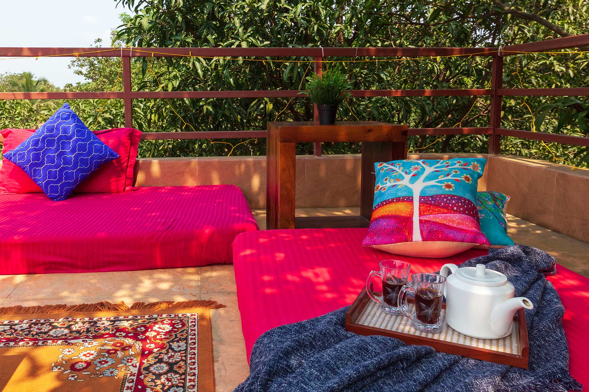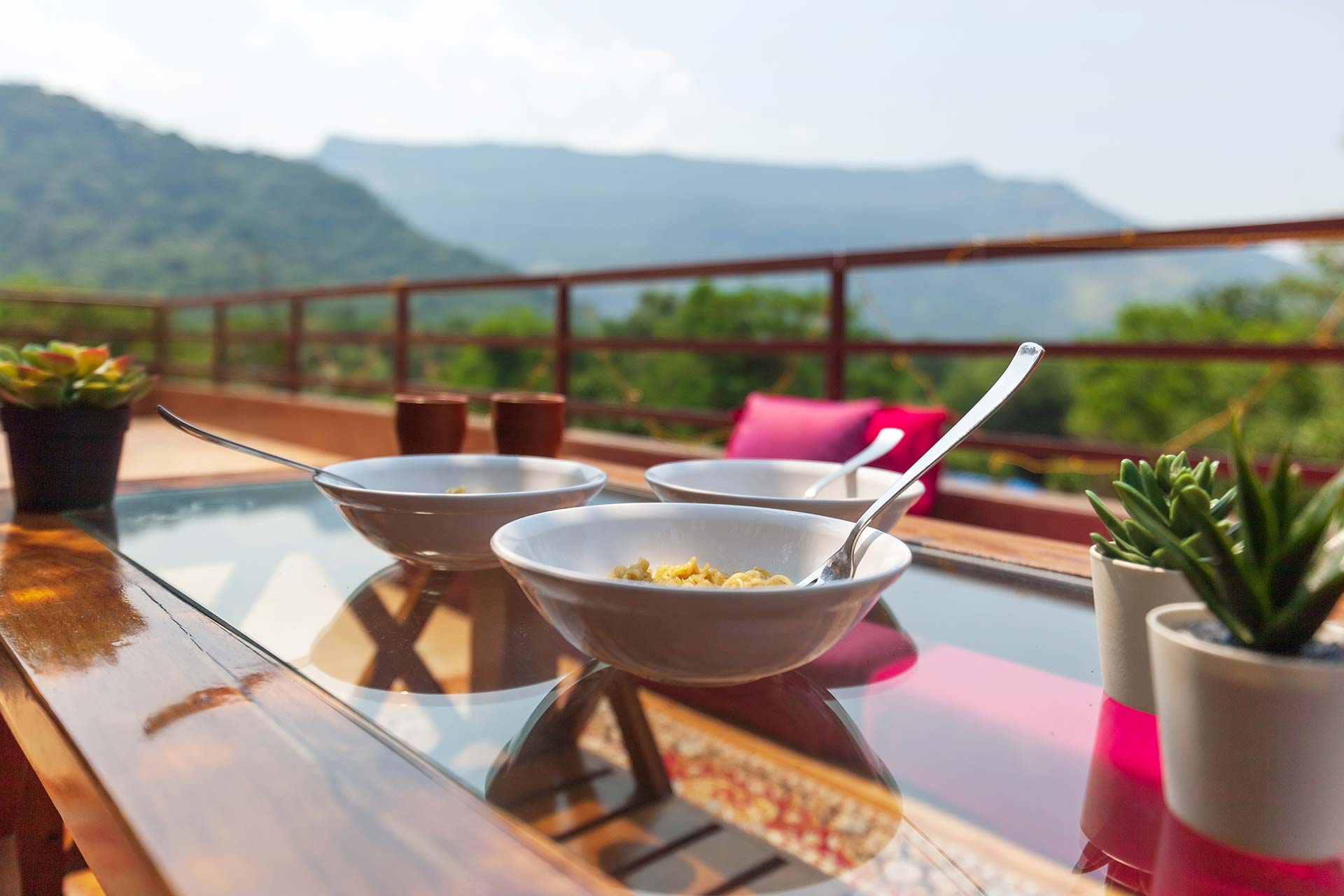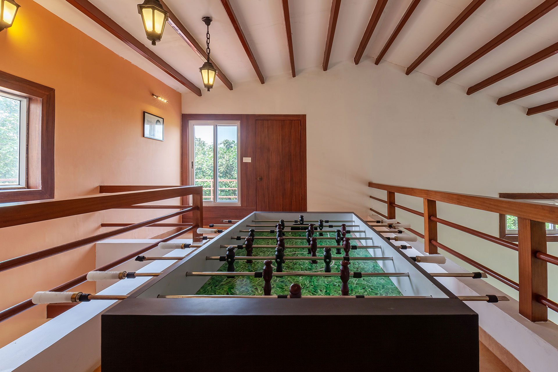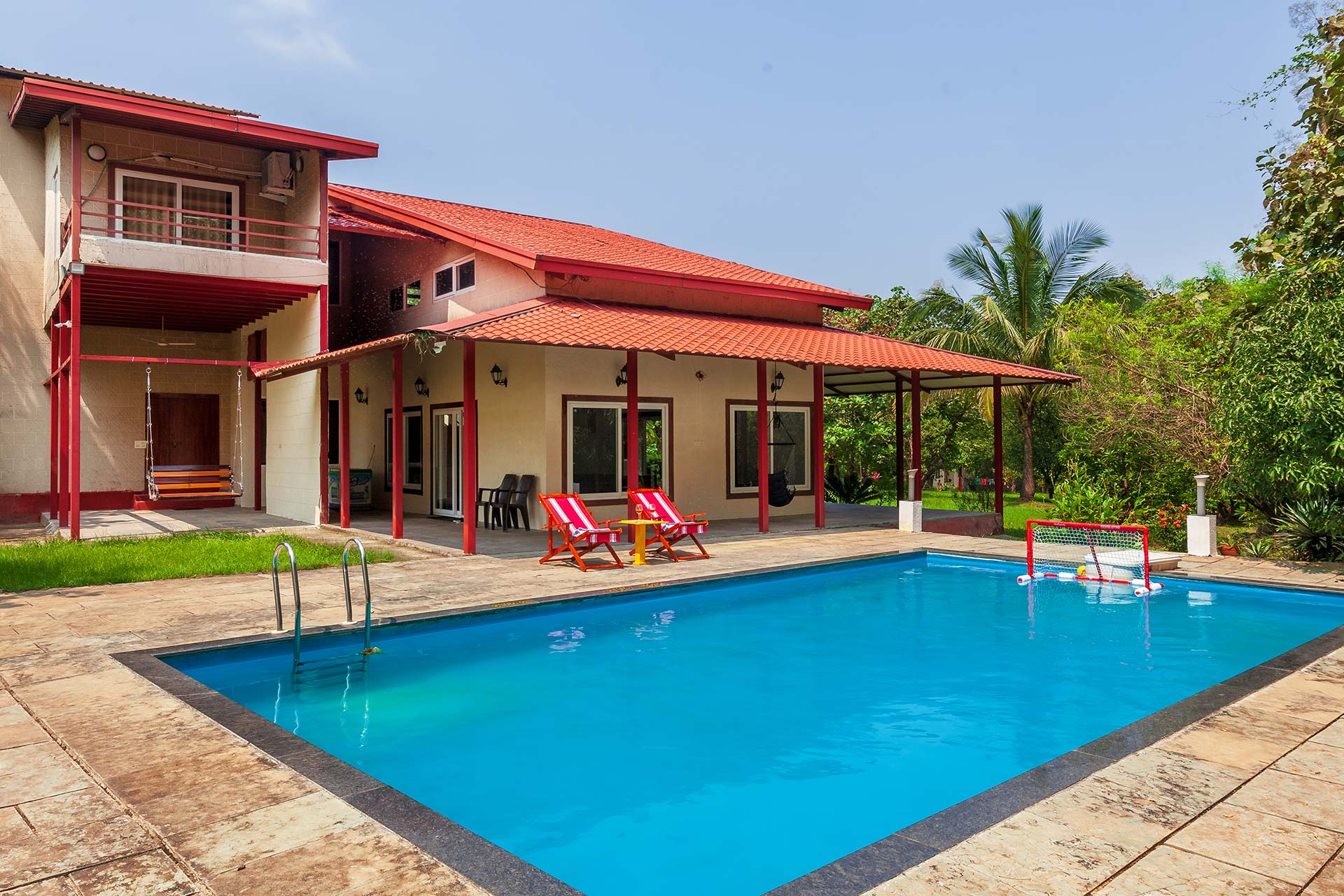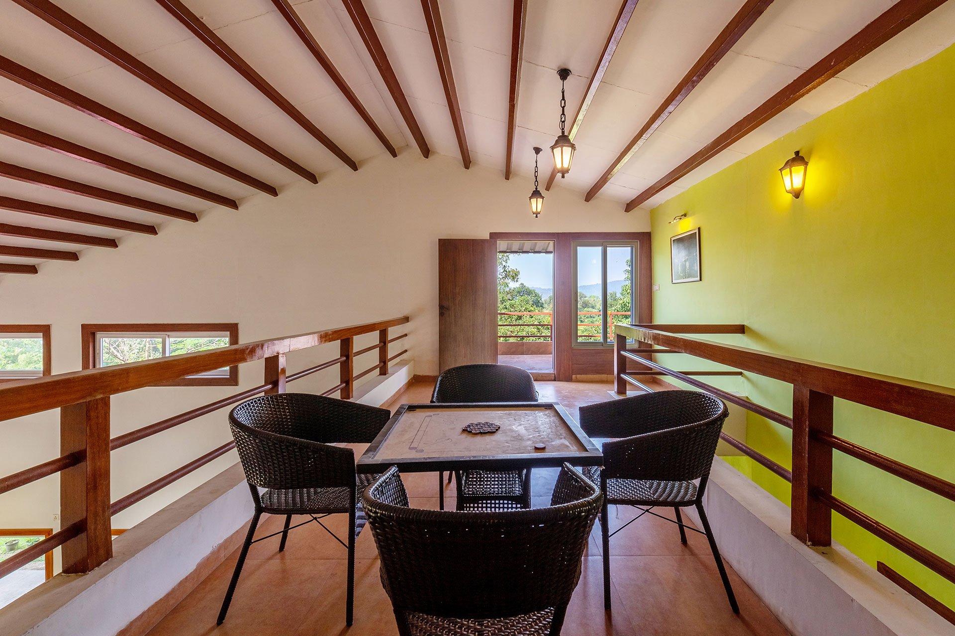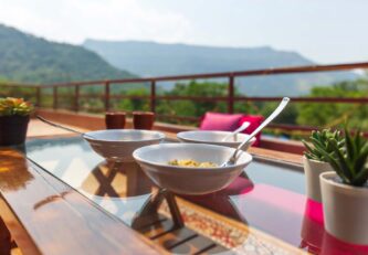 Within the property, guests can enjoy a relaxing dip or practise their scoring skills in a game of pool polo in the private swimming pool. They can take a peaceful stroll on the lawn and bask in the sun. If you’re up for some fun and frolic, guests can also enjoy a game of soccer or cricket on the well-manicured lawns. Enjoy competitive rounds of board games such as Ludo, Snakes & Ladders or foosball with your peers. Swing leisurely at any of the multiple spots, or find a cosy nook to read a book, meditate or do some yoga. Guests can soak in the gorgeous views from the balconies. Want to watch movies or catch up on sports? Get your Wi-Fi streaming devices and connect to the TVs. Guests can also relish a hearty barbecue meal. A mini-trek can be organized through the lush forests and hillocks for a small extra fee, subject to the caretaker’s availability.