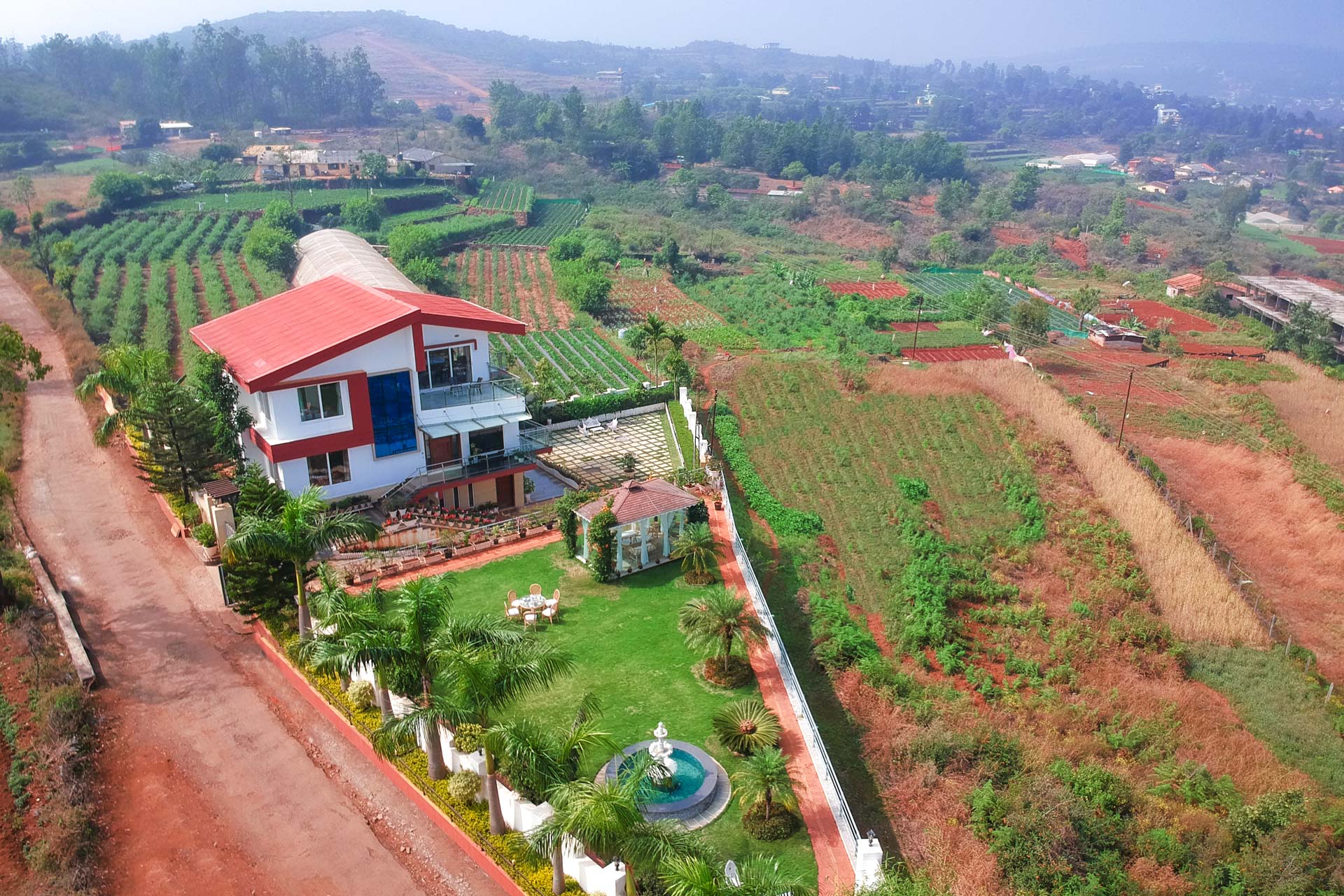– The exteriors of the villa feature a verdant lawn with a water fountain, 7,500 sq. ft. in size.