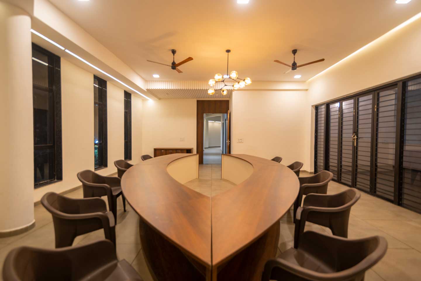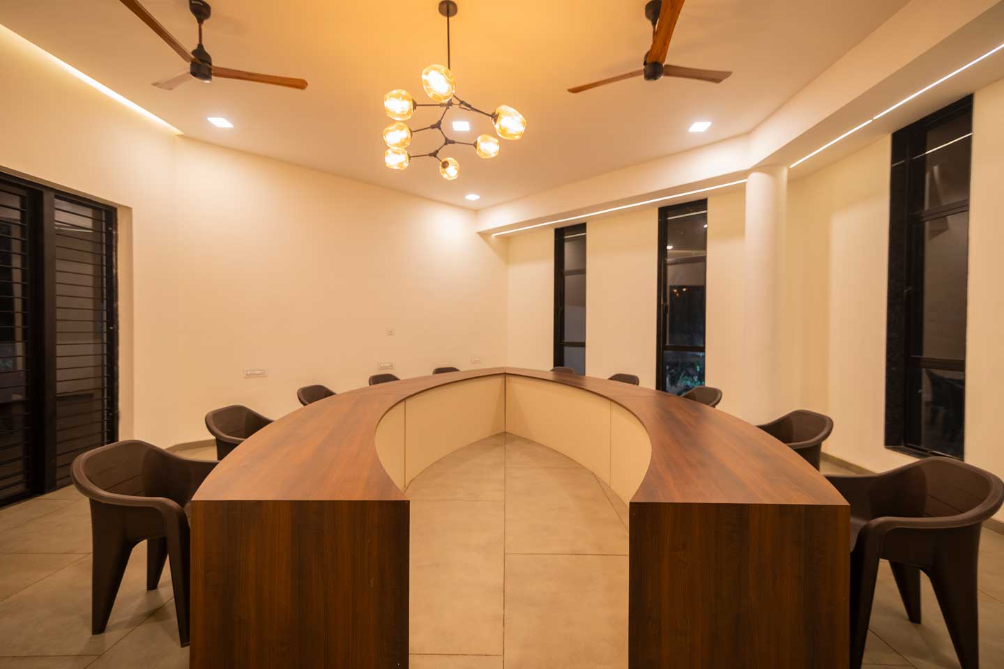 – The first floor of the villa also houses a conference room, featuring a round table and ample seating arrangements.