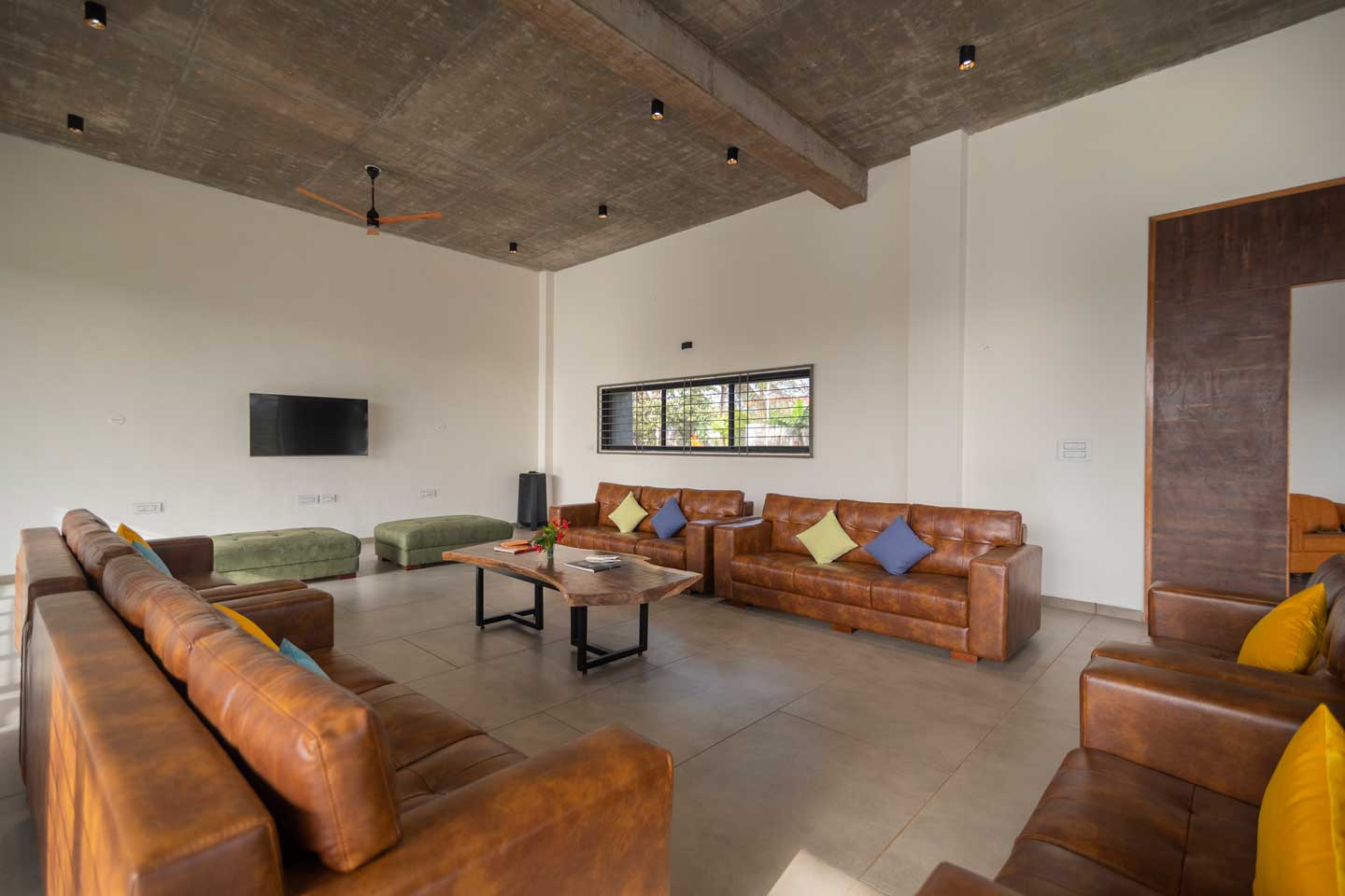 – The living room opens up to the verdant exteriors of the home that serve as the perfect respite.