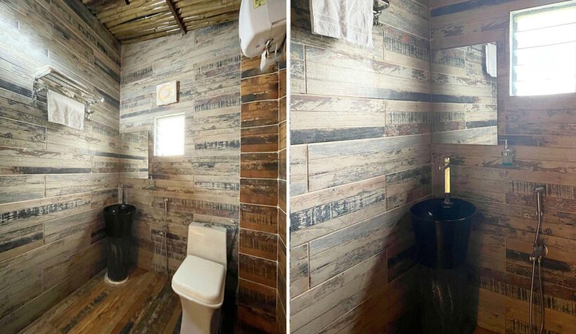 – All attached bathrooms have geysers, towels, basic toiletries, and a rustic bamboo shower area.