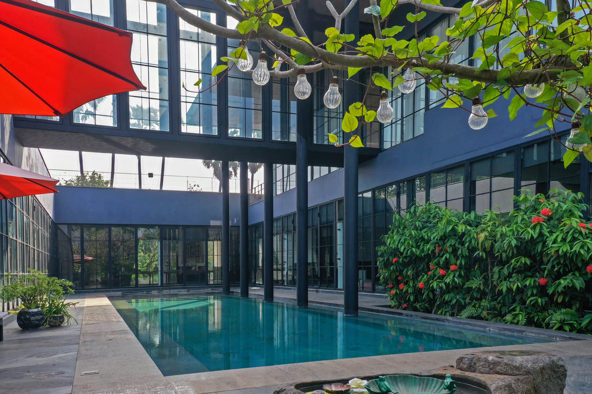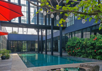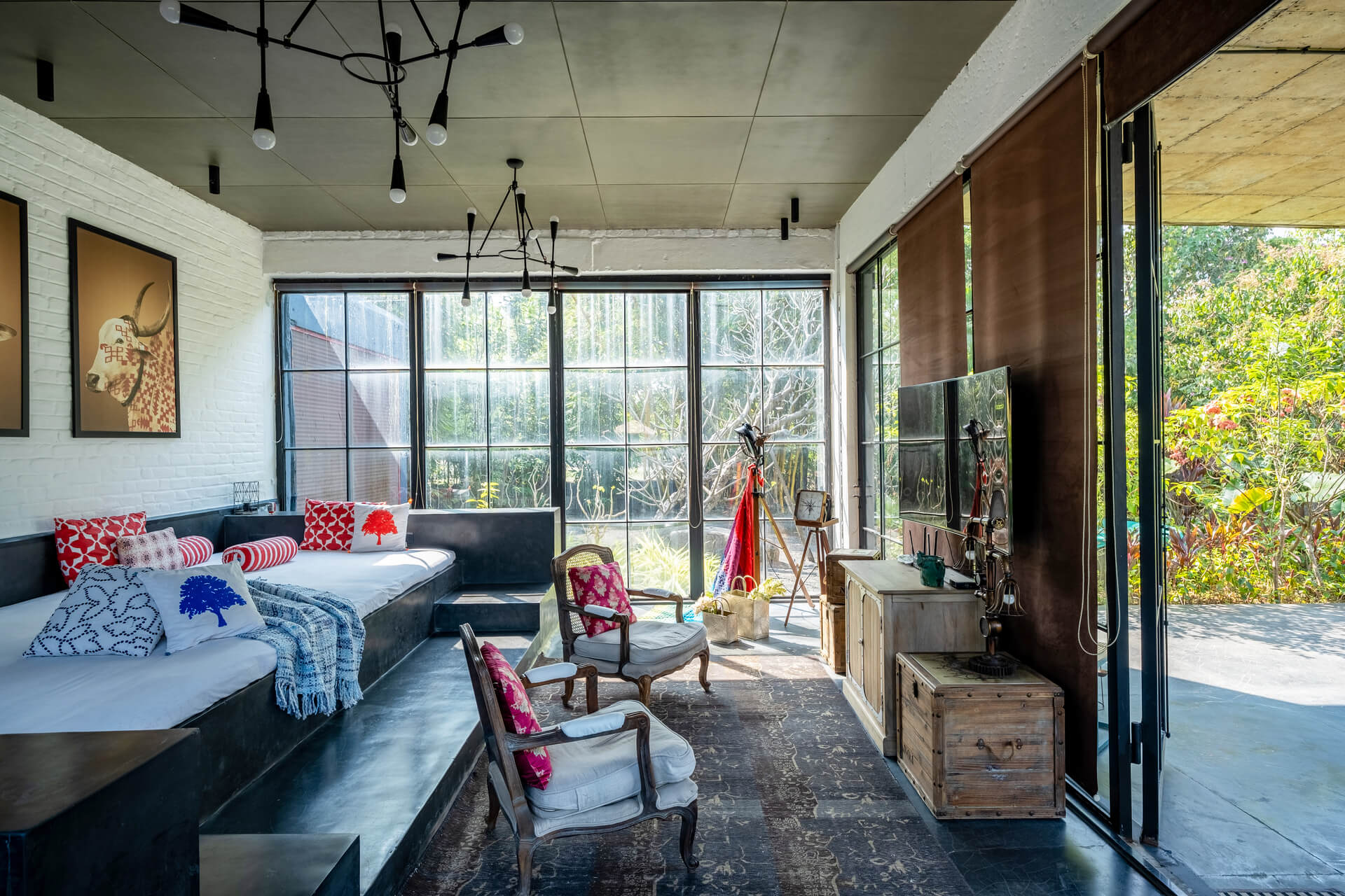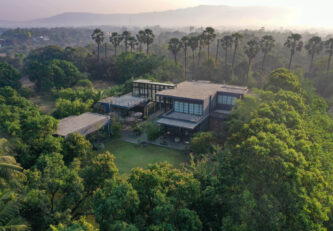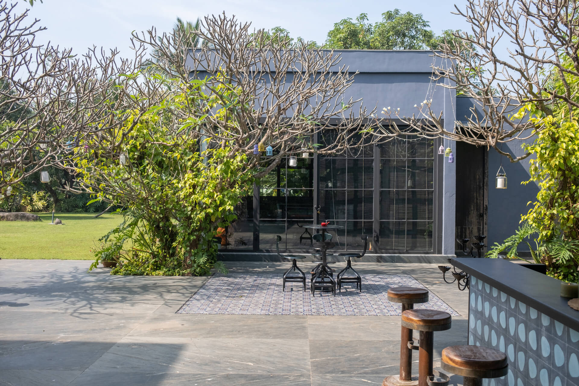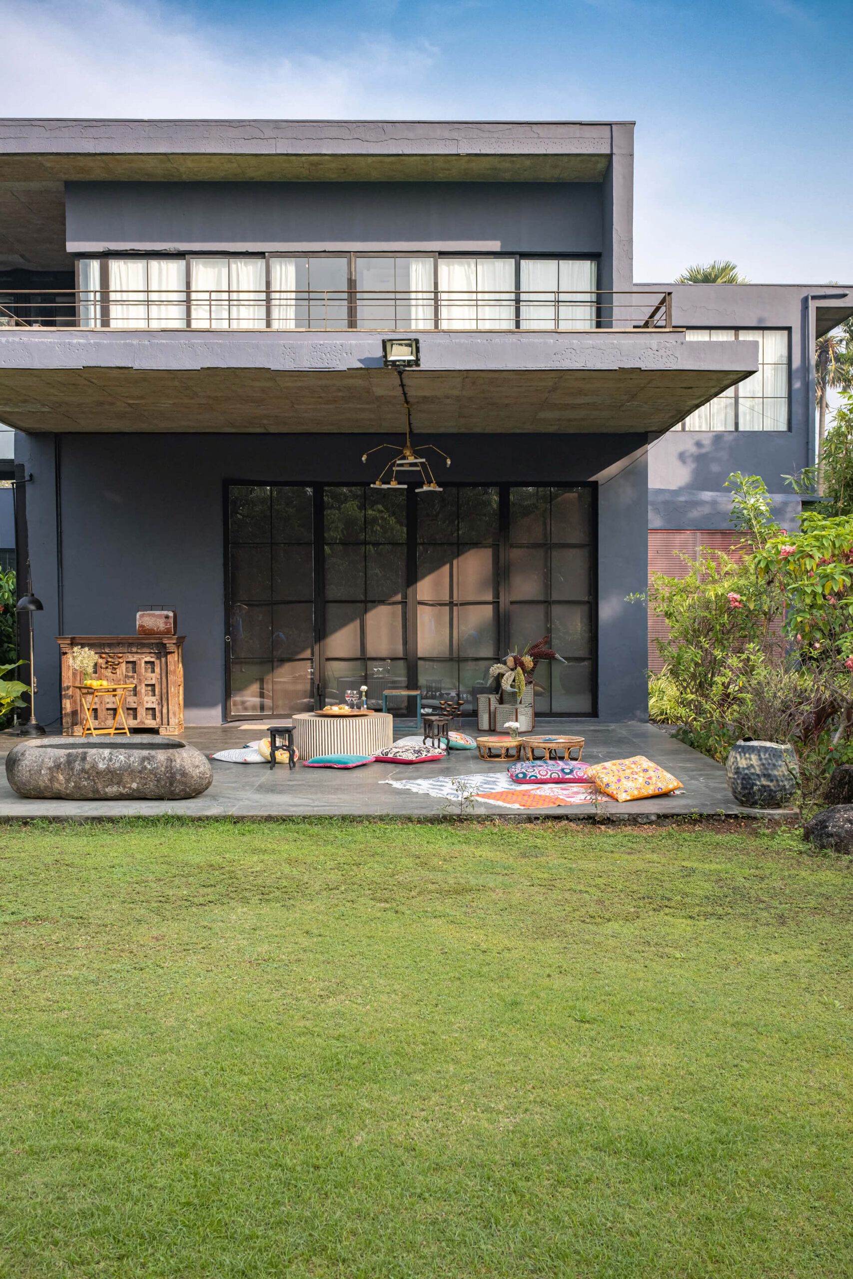 Built on the tenets of California Modernism, Greystone Manor, located in Awas, Alibaug, is a grand 5-bedroom villa that gracefully blurs the boundaries between indoors and outdoors. The transparent glass panels and the clever layout, centered around the pool, encourage interaction and spending time with loved ones. The colourful Bohemian decor strikingly contrasts the grey coloured exterior which echoes the indigenous rocks. For an intimate gathering with friends, the outdoor bar and seating areas will make the perfect setting, while the expansive lawns and dedicated games room will make for an unforgettable holiday with the family.