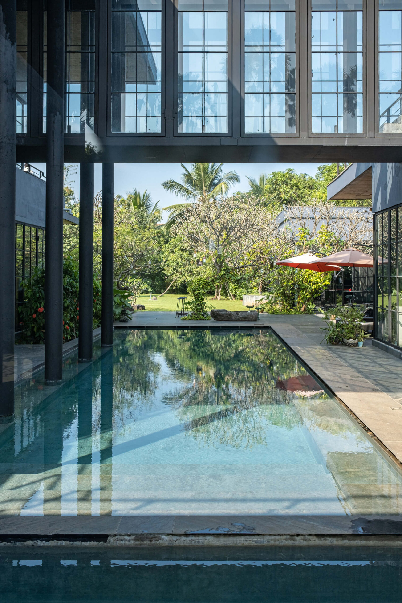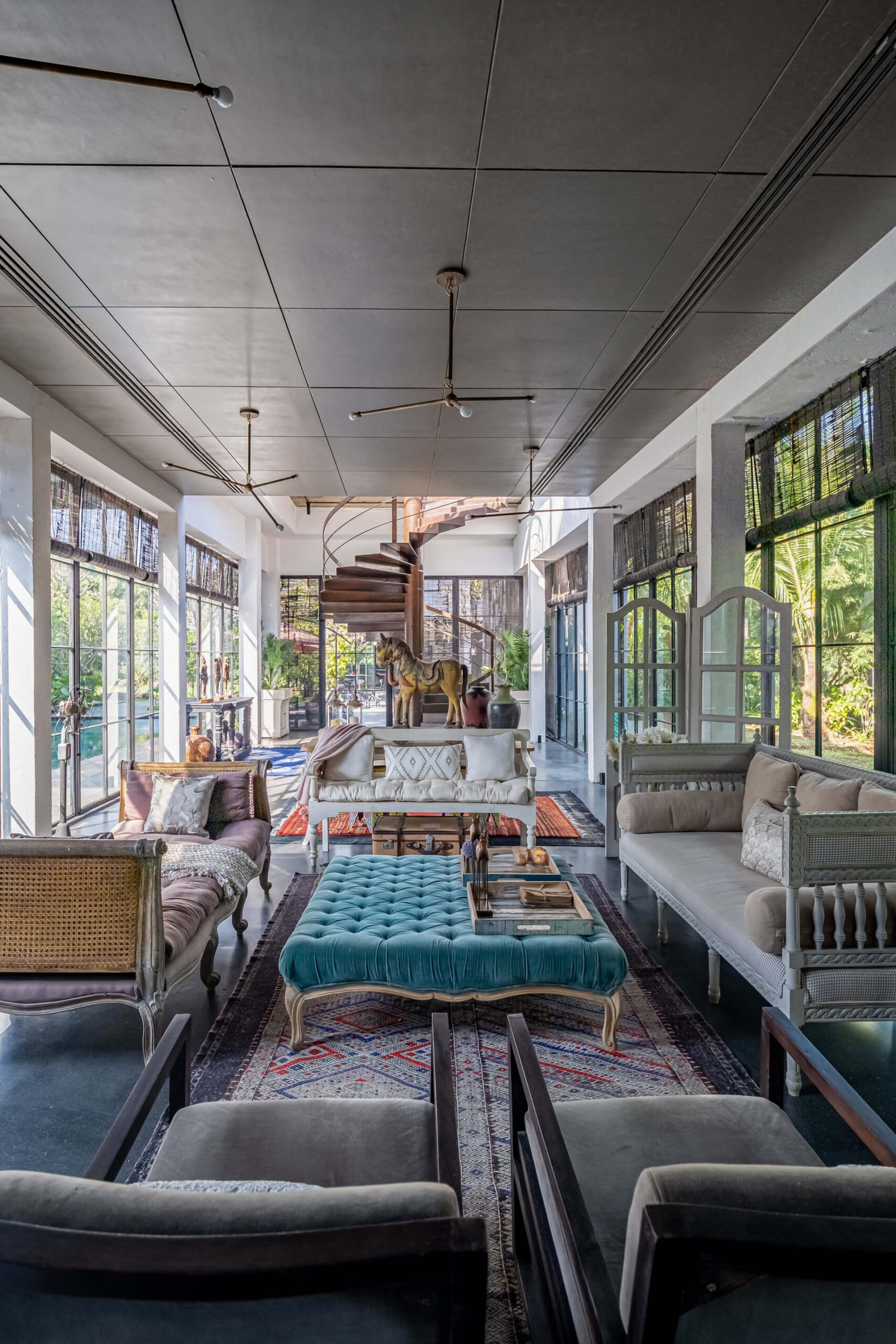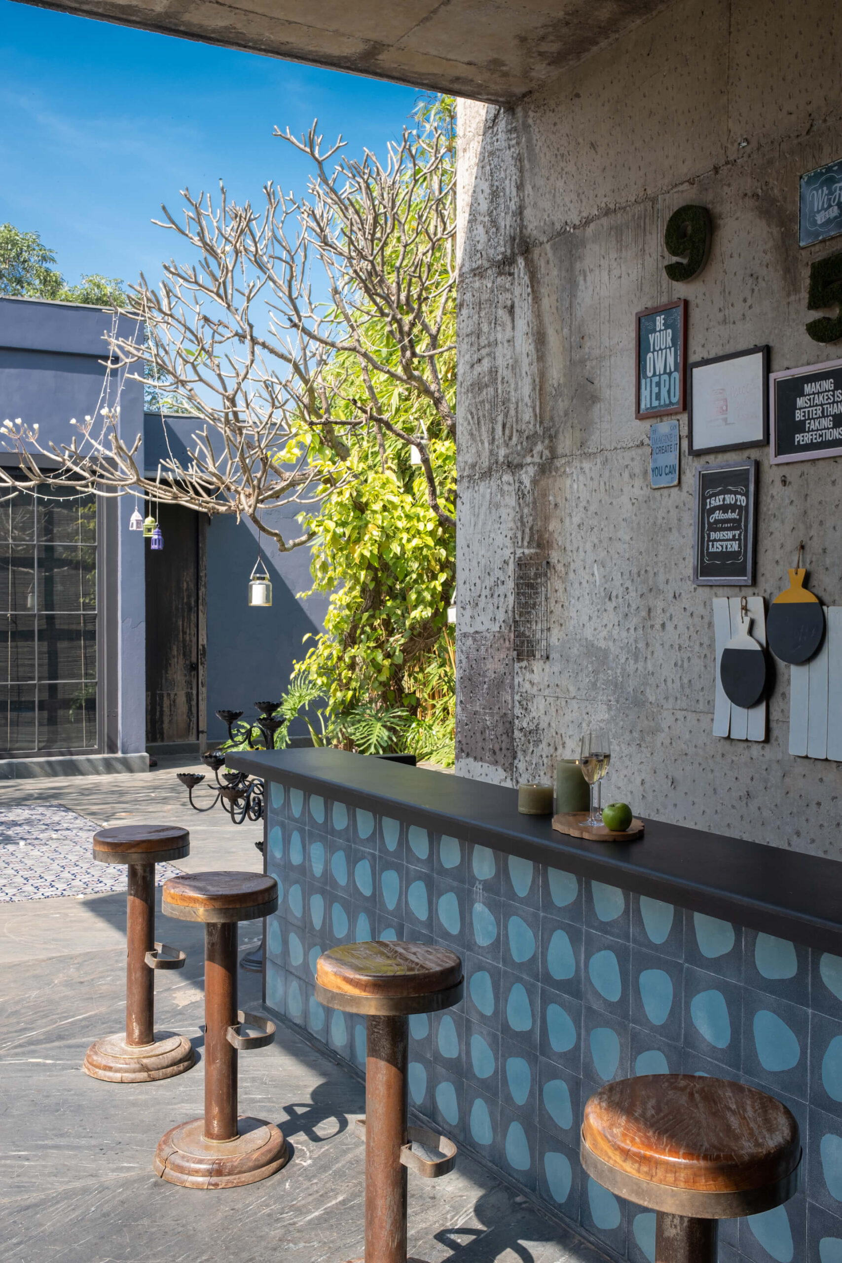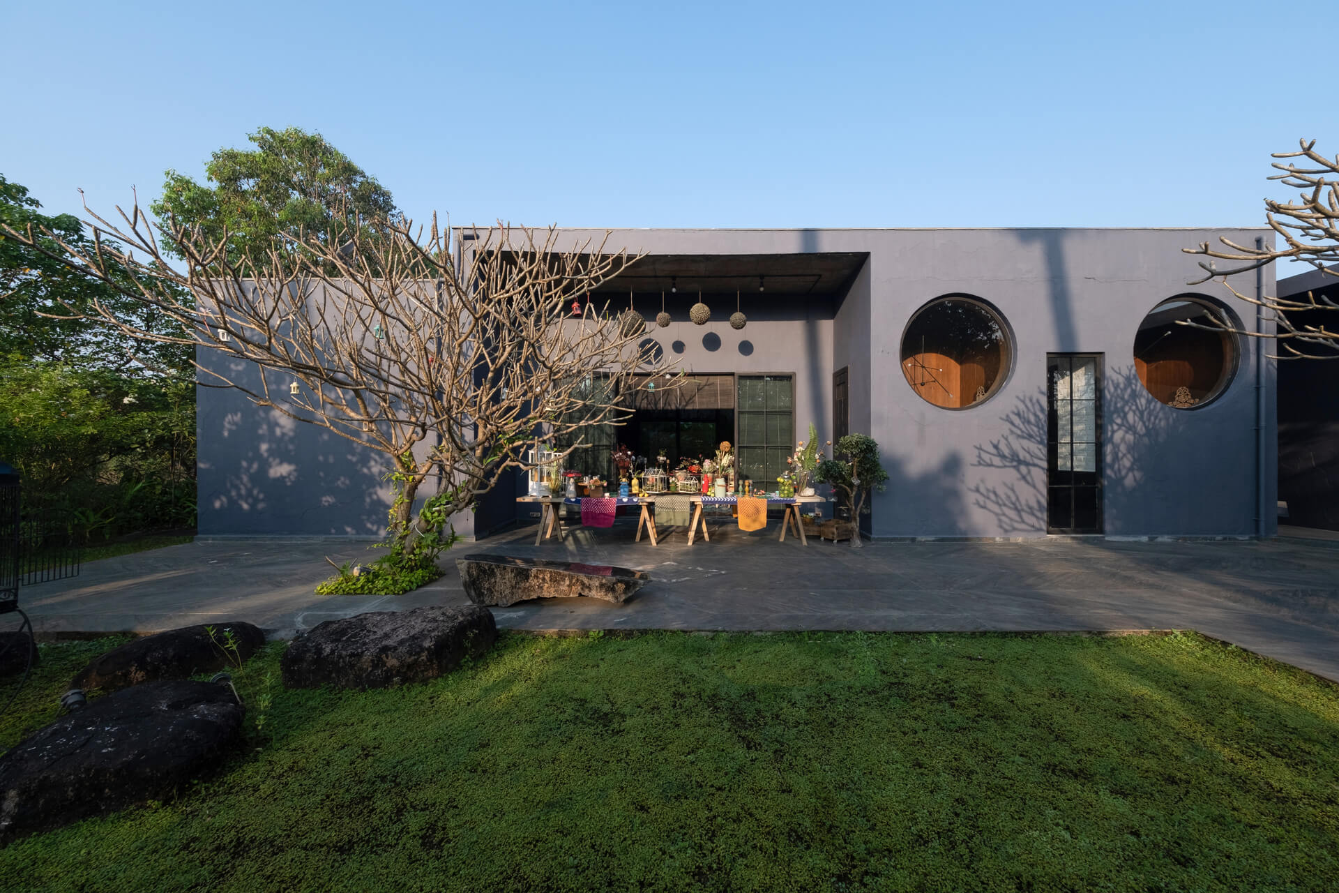 Built on the tenets of California Modernism, Greystone Manor, located in Awas, Alibaug, is a grand 5-bedroom villa that gracefully blurs the boundaries between indoors and outdoors. The transparent glass panels and the clever layout, centered around the pool, encourage interaction and spending time with loved ones. The colourful Bohemian decor strikingly contrasts the grey coloured exterior which echoes the indigenous rocks. For an intimate gathering with friends, the outdoor bar and seating areas will make the perfect setting, while the expansive lawns and dedicated games room will make for an unforgettable holiday with the family.