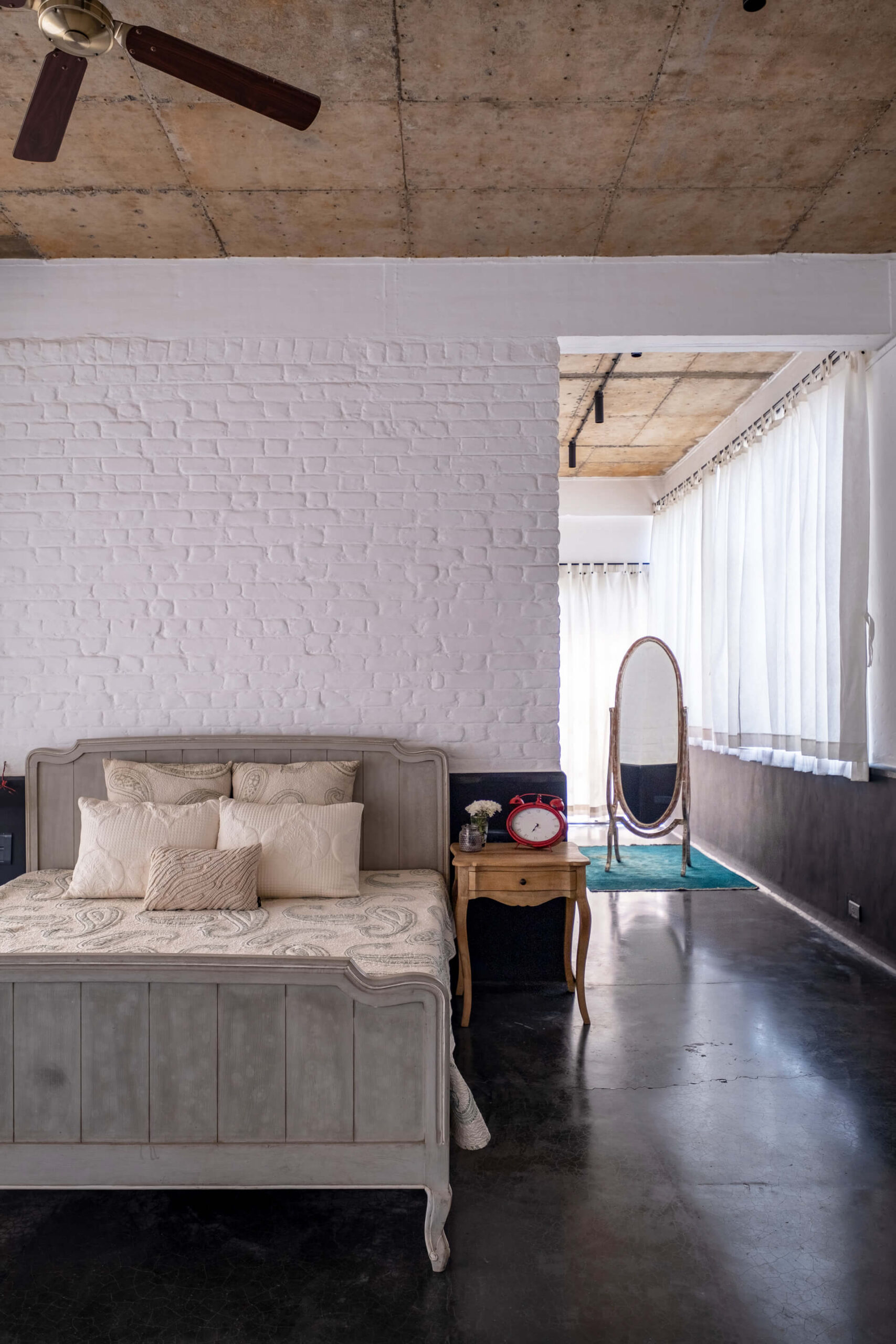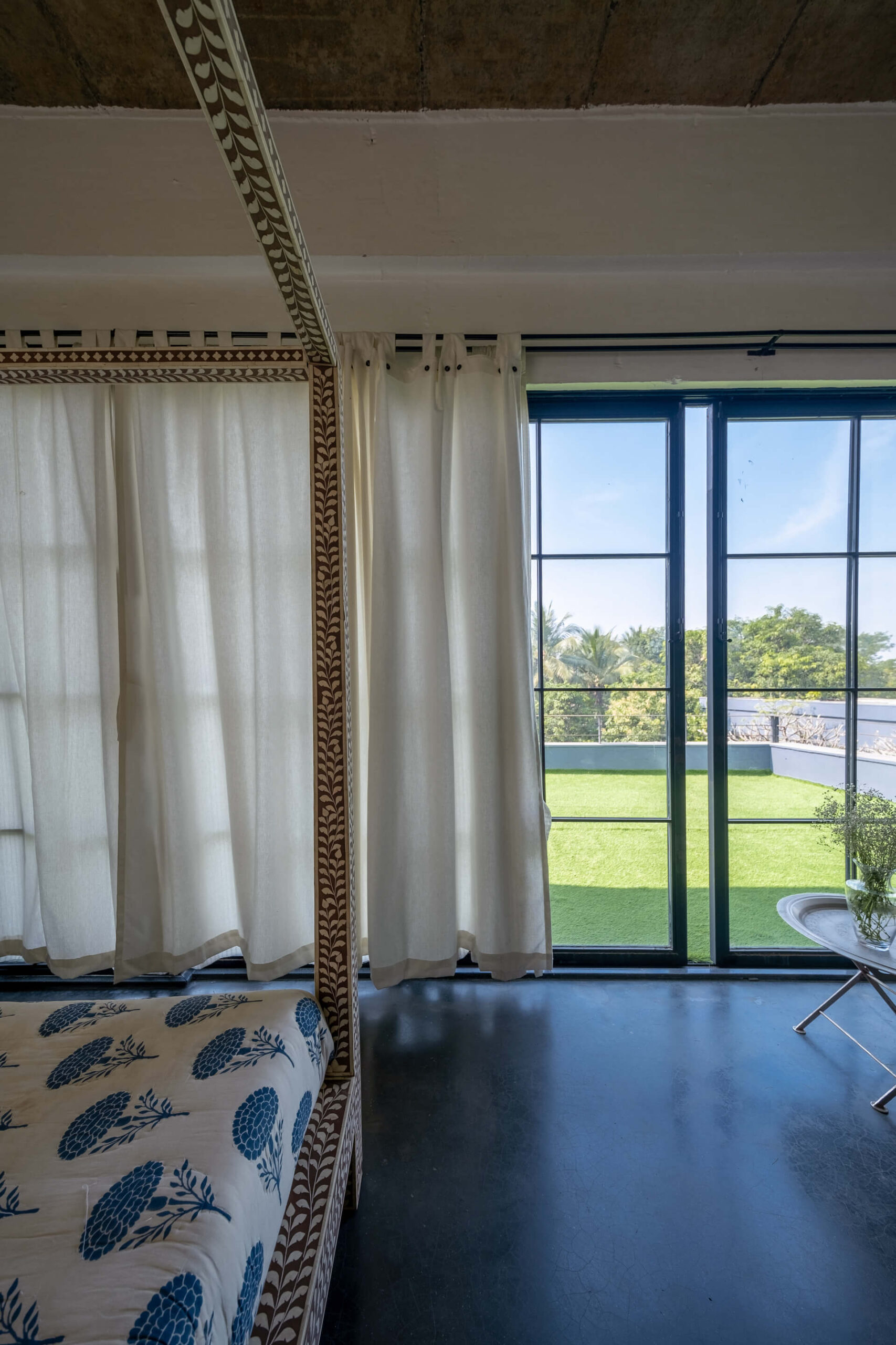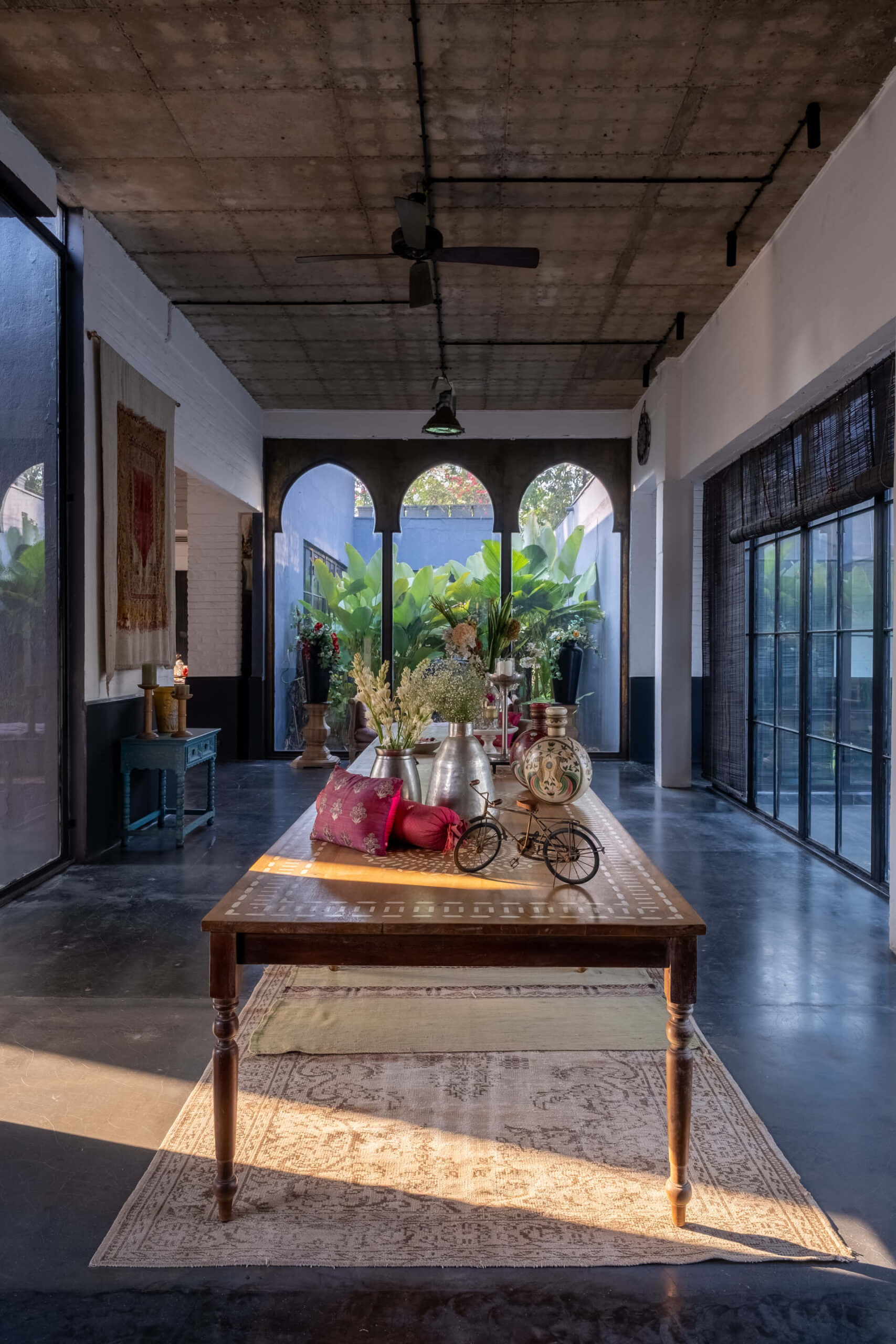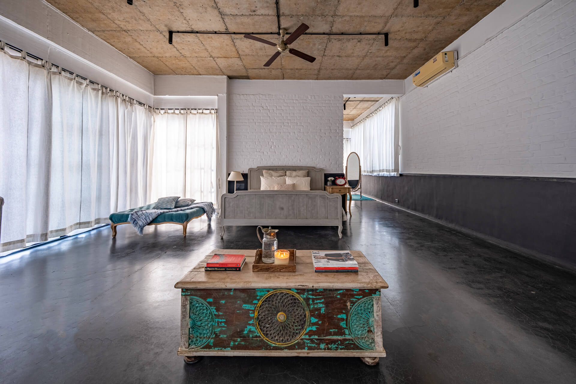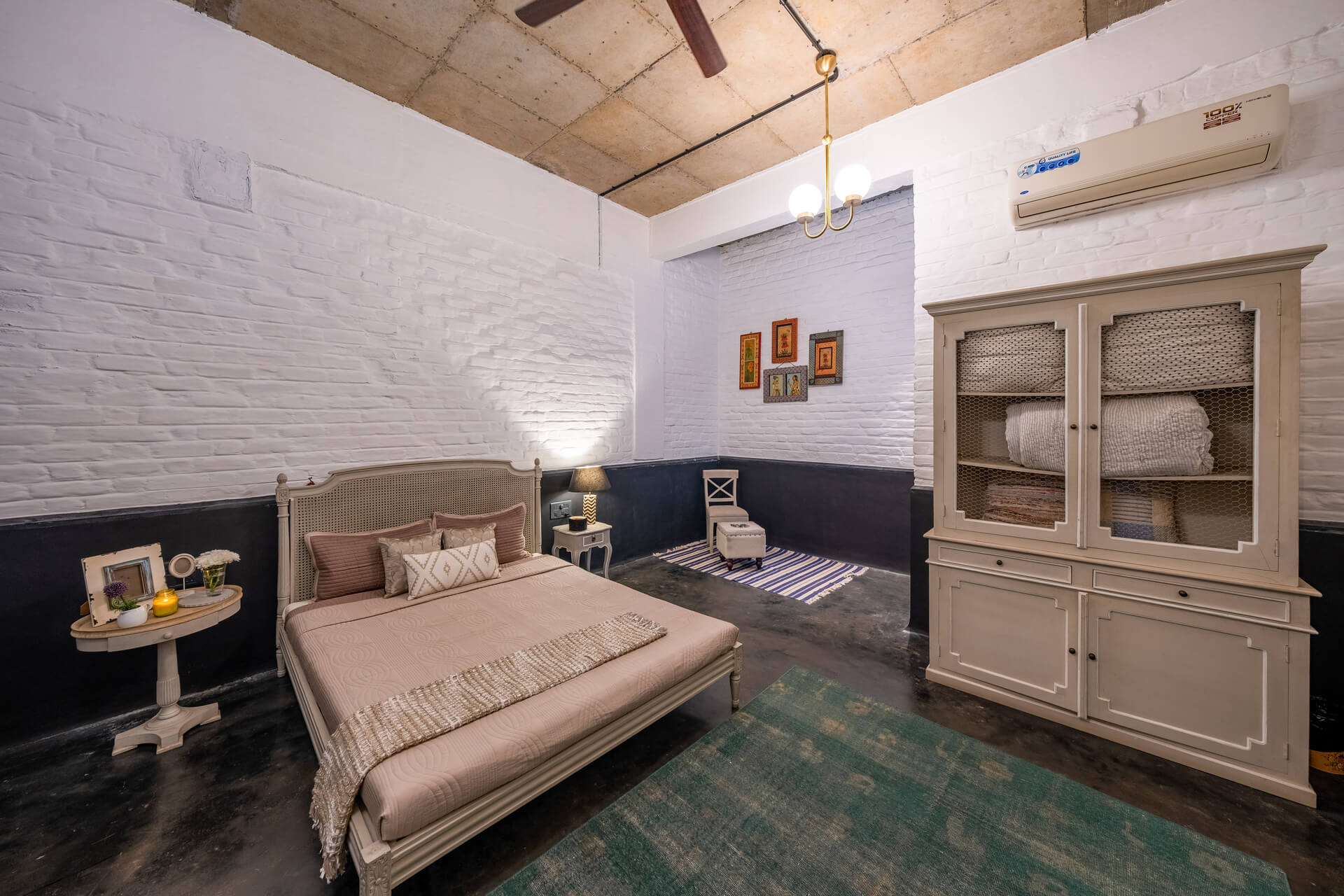 Built on the tenets of California Modernism, Greystone Manor, located in Awas, Alibaug, is a grand 5-bedroom villa that gracefully blurs the boundaries between indoors and outdoors. The transparent glass panels and the clever layout, centered around the pool, encourage interaction and spending time with loved ones. The colourful Bohemian decor strikingly contrasts the grey coloured exterior which echoes the indigenous rocks. For an intimate gathering with friends, the outdoor bar and seating areas will make the perfect setting, while the expansive lawns and dedicated games room will make for an unforgettable holiday with the family.