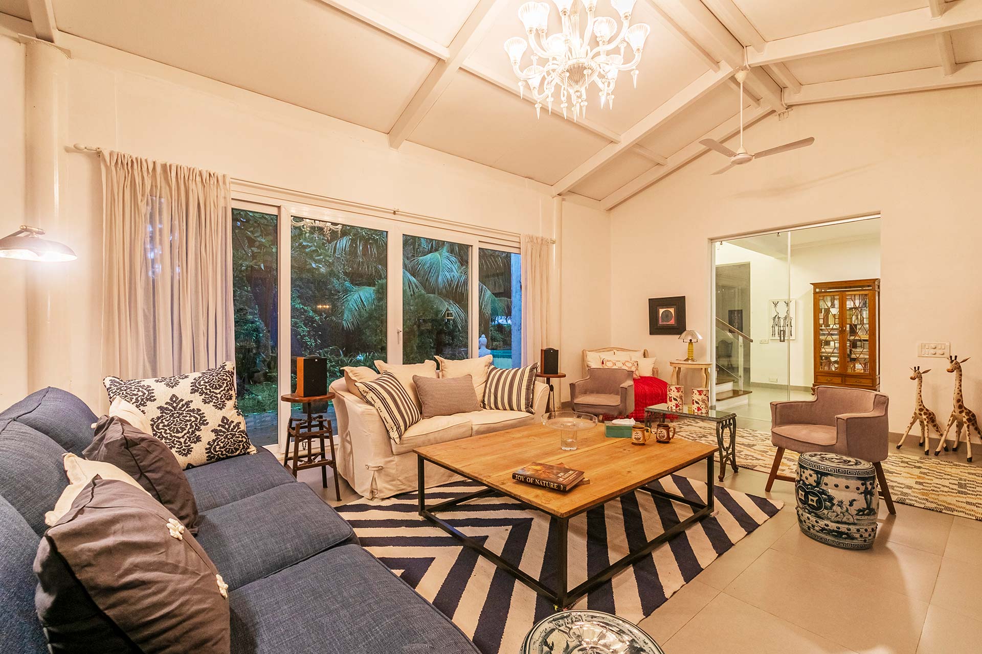 – Both living rooms are on the ground floor and offer WiFI, AC, music system and seating for 12-15 people each. One of them has a TV.