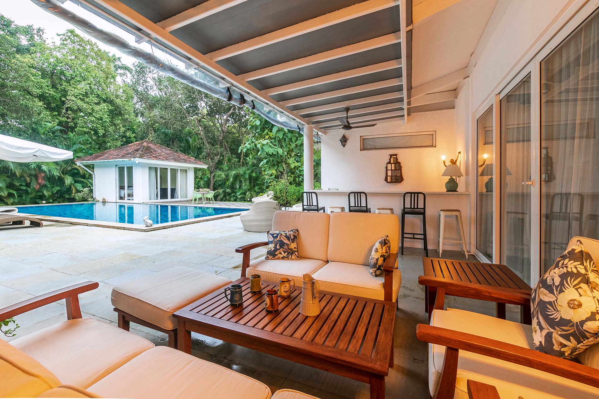 – There are 2 lawns, 1 balcony, 1 pool deck, lounge and bar counter.