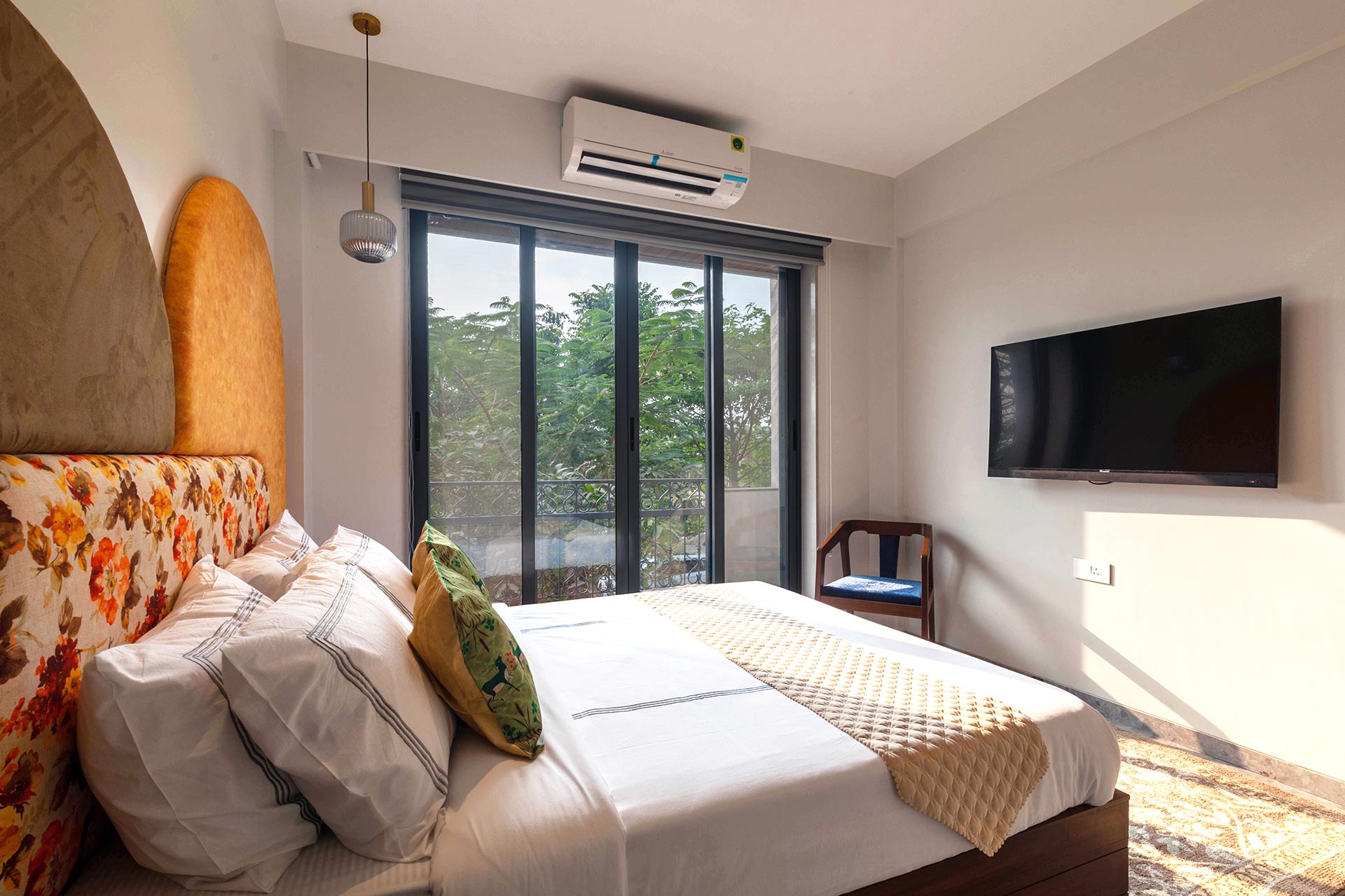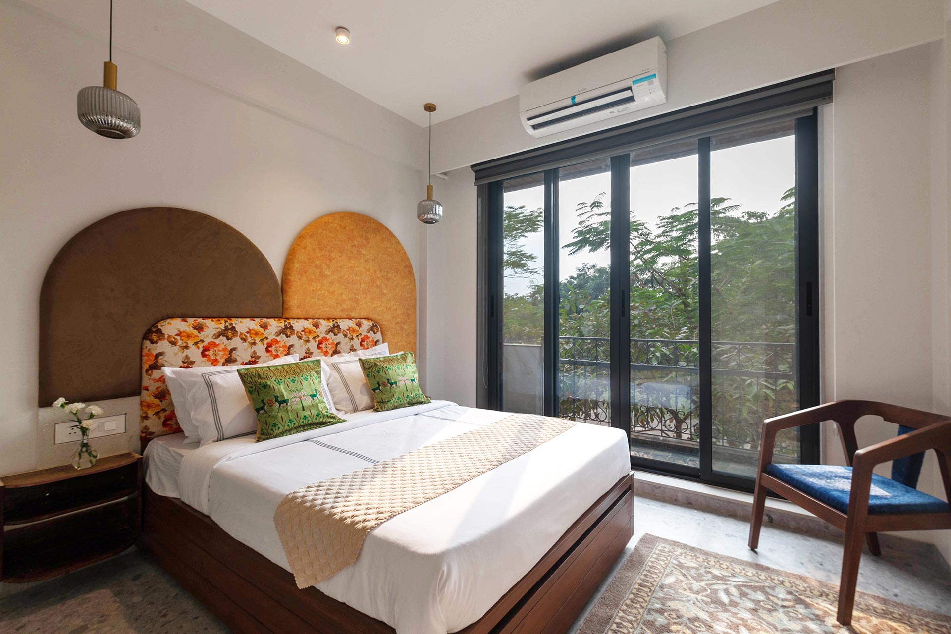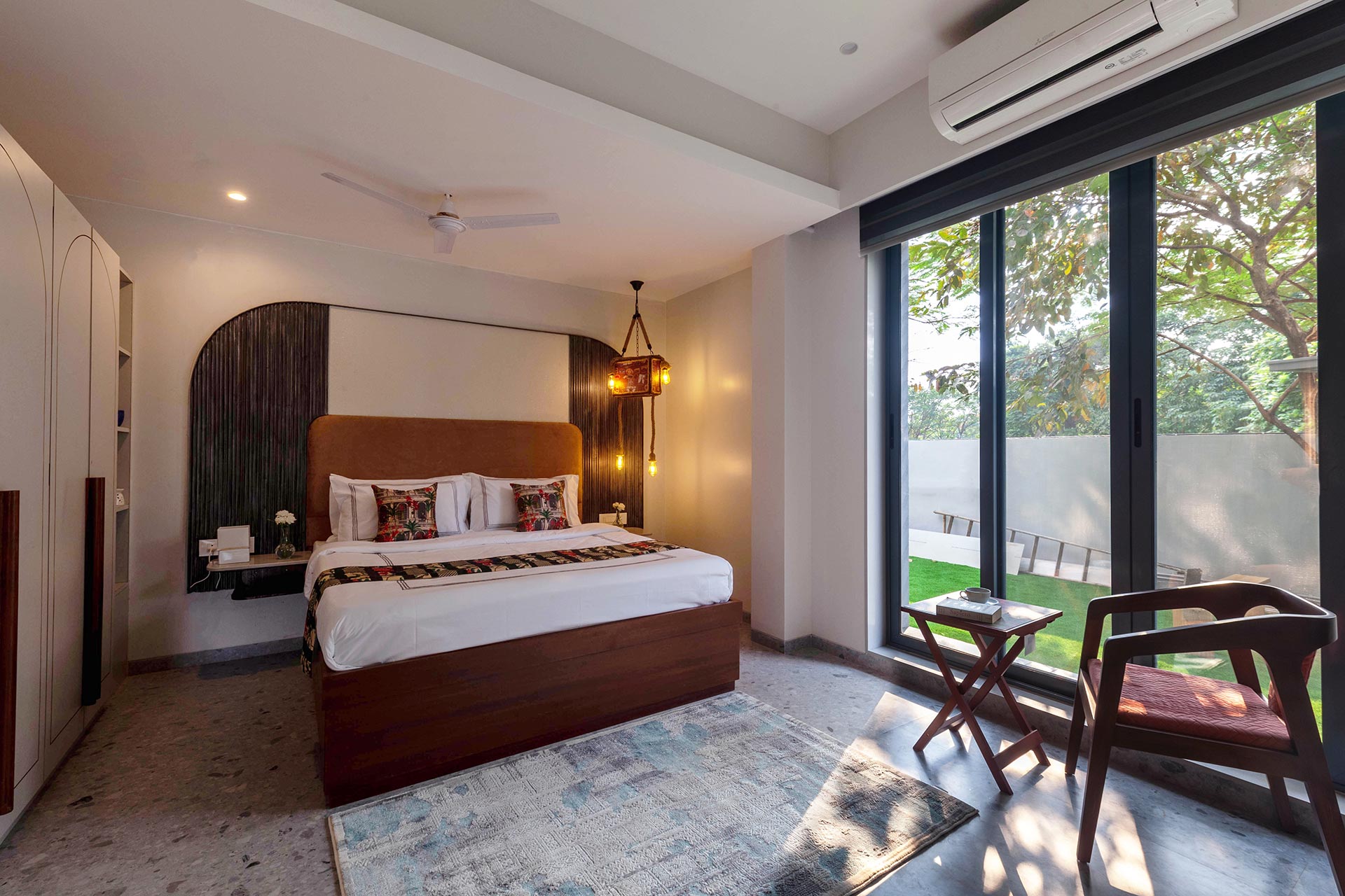 The living room overlooks the soothing facade, with muted tones and greenery and is decked with sofas that can seat up to 10 people, AC, a smart TV and Wi-Fi access. The lawn alongside offers an al-fresco dining experience as well. With seating for 5 to 6 people, a scrumptious breakfast by the pool is recommended.