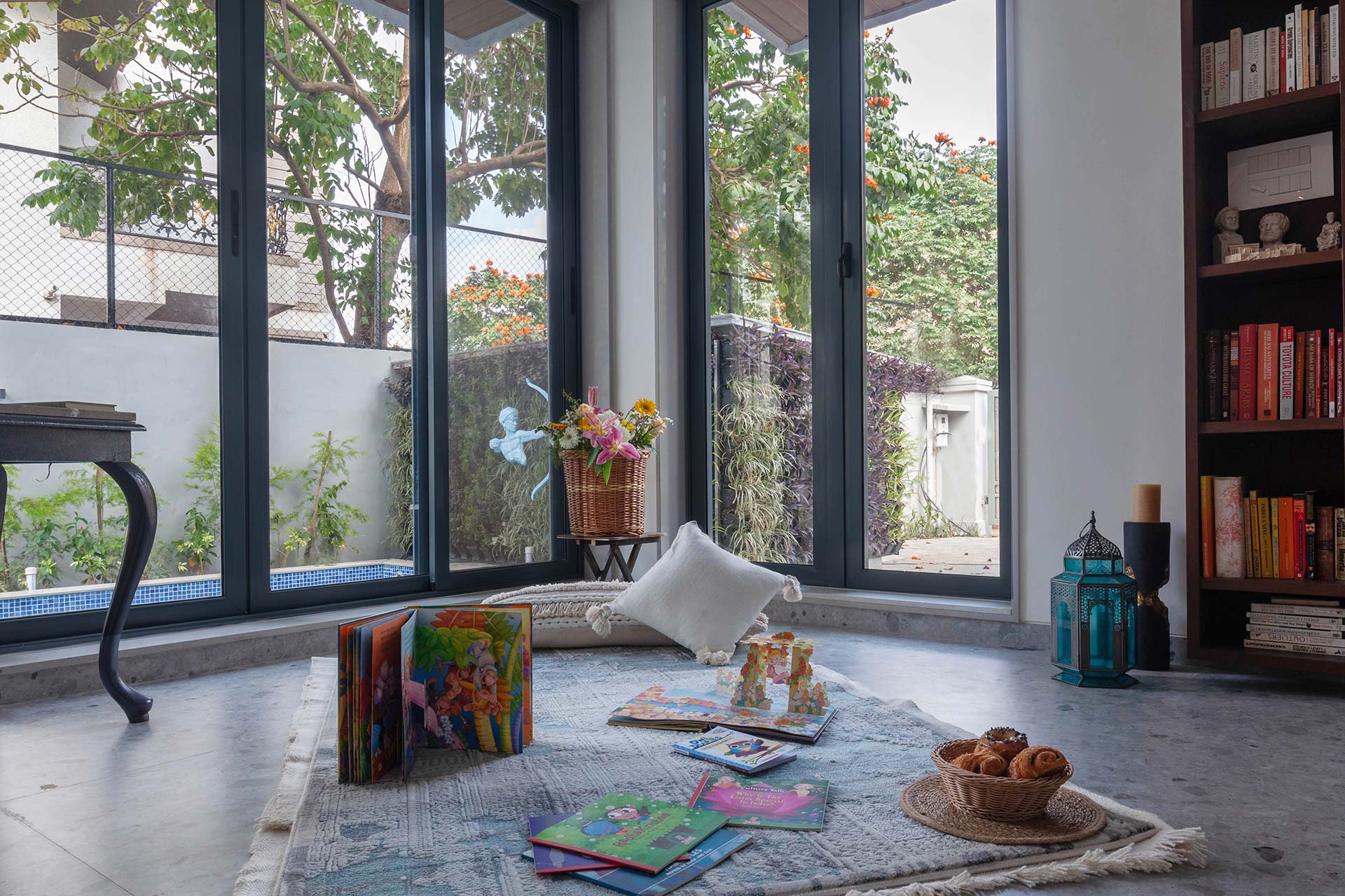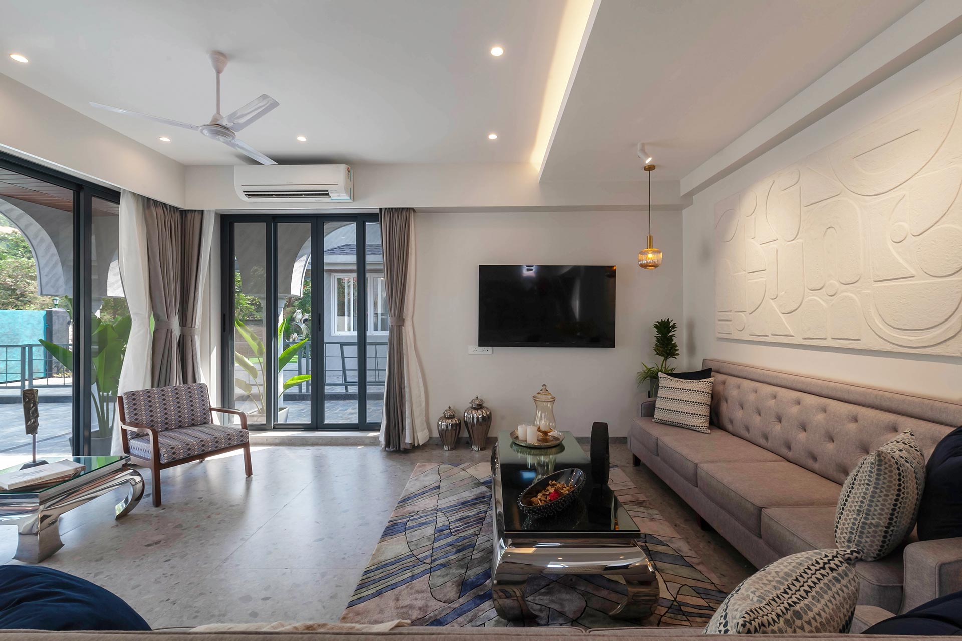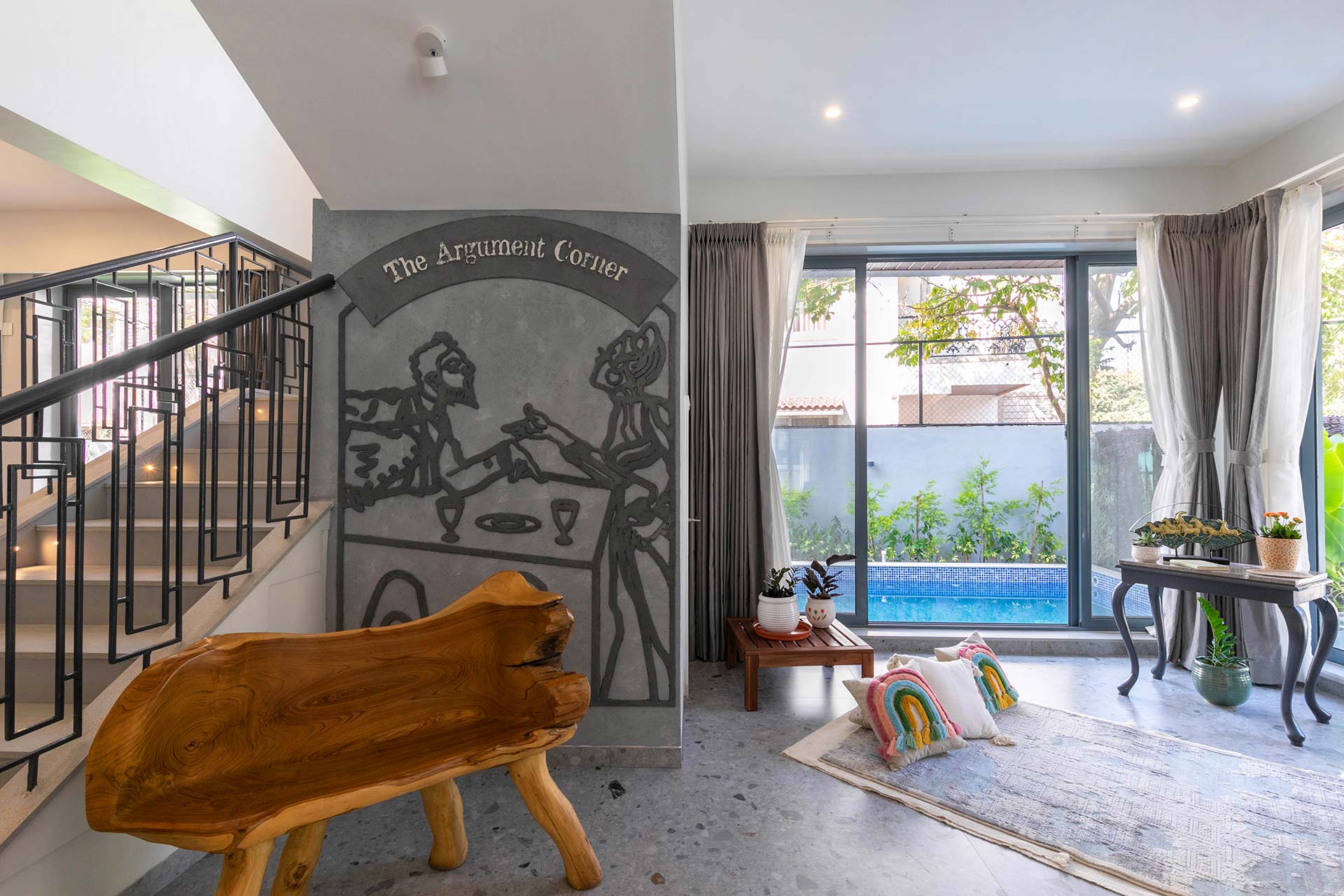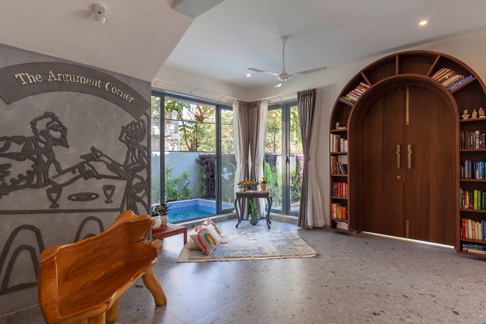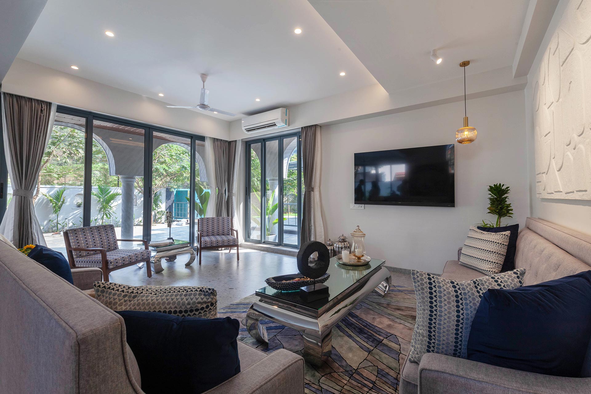 No matter where you look, in each nook, corner, and artefact at this home; you are sure to find an arch, a curve somewhere which is the most engrossing part of this stay. As you enter this abode, you will come across this tastefully designed living area surrounded by glass slides on all sides.