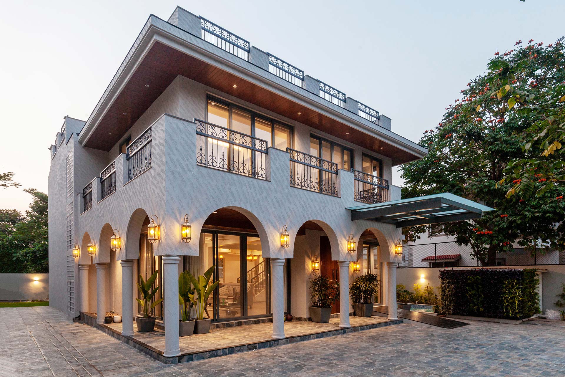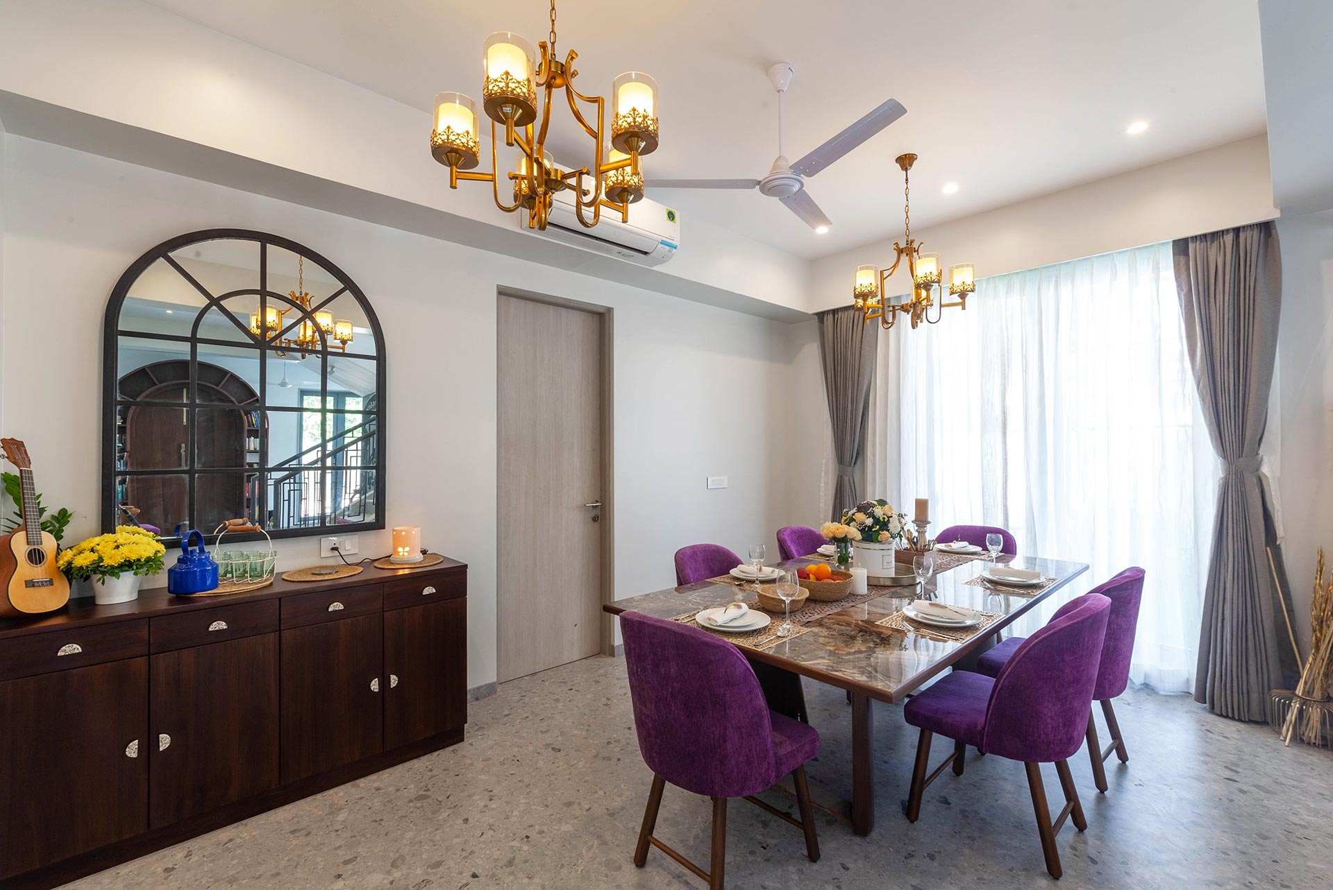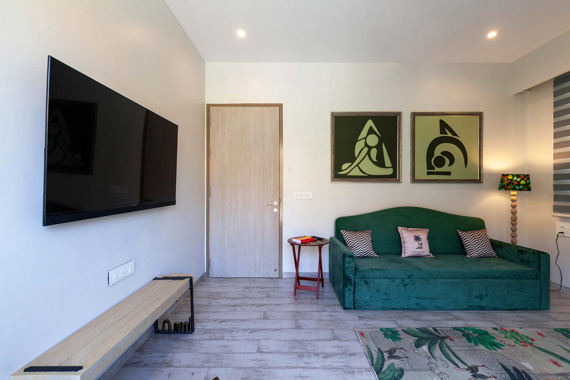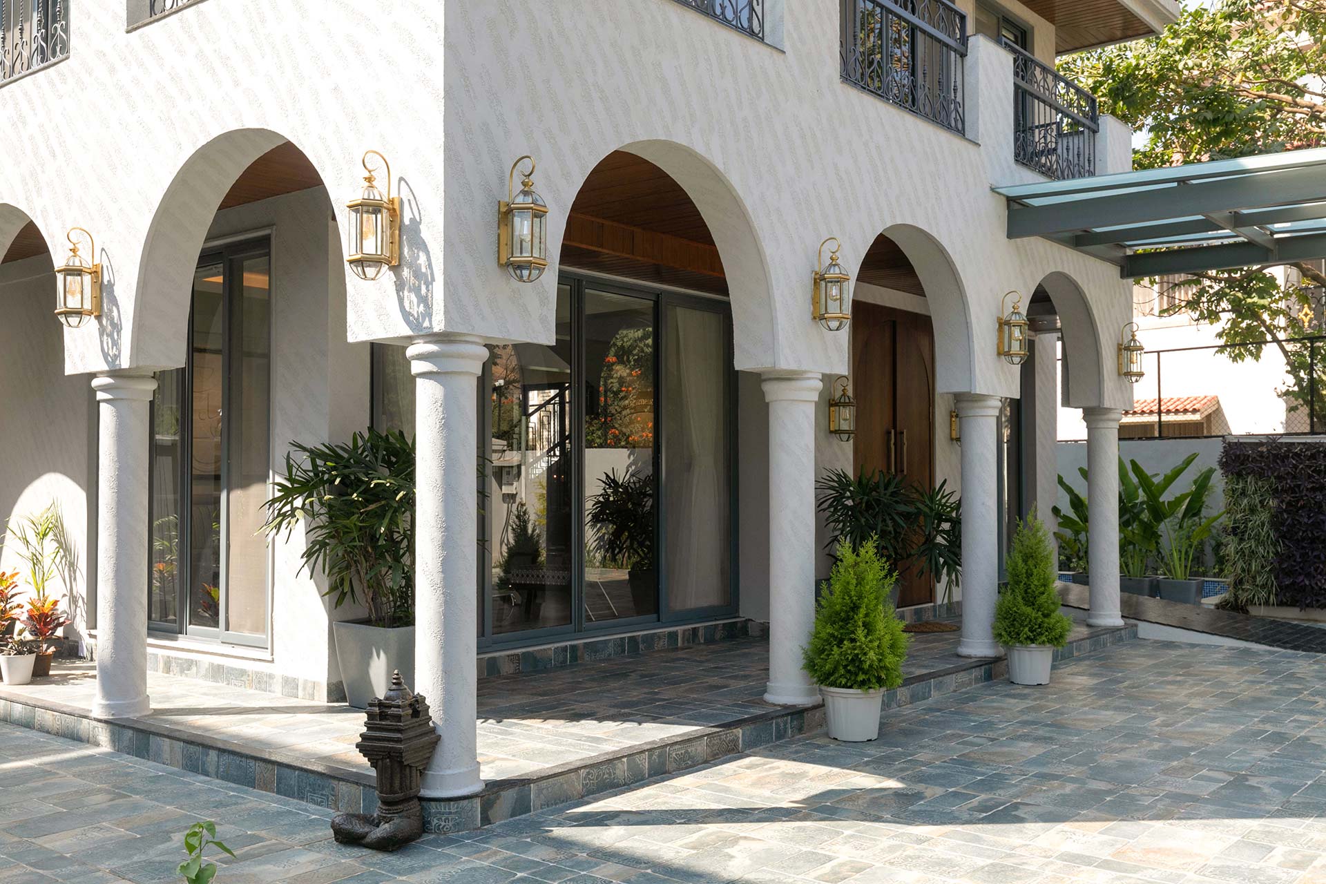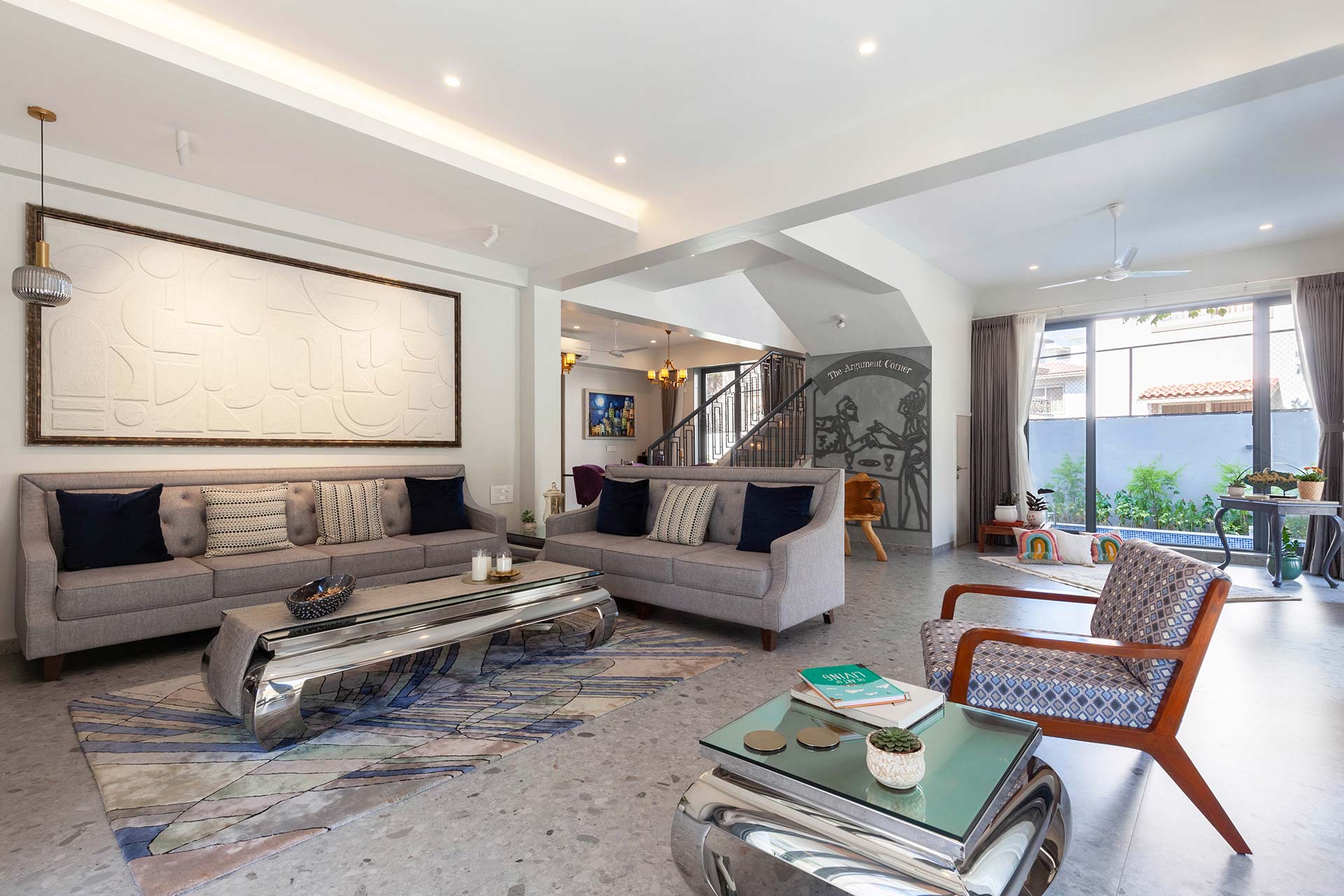 No matter where you look, in each nook, corner, and artefact at this home; you are sure to find an arch, a curve somewhere which is the most engrossing part of this stay. As you enter this abode, you will come across this tastefully designed living area surrounded by glass slides on all sides.