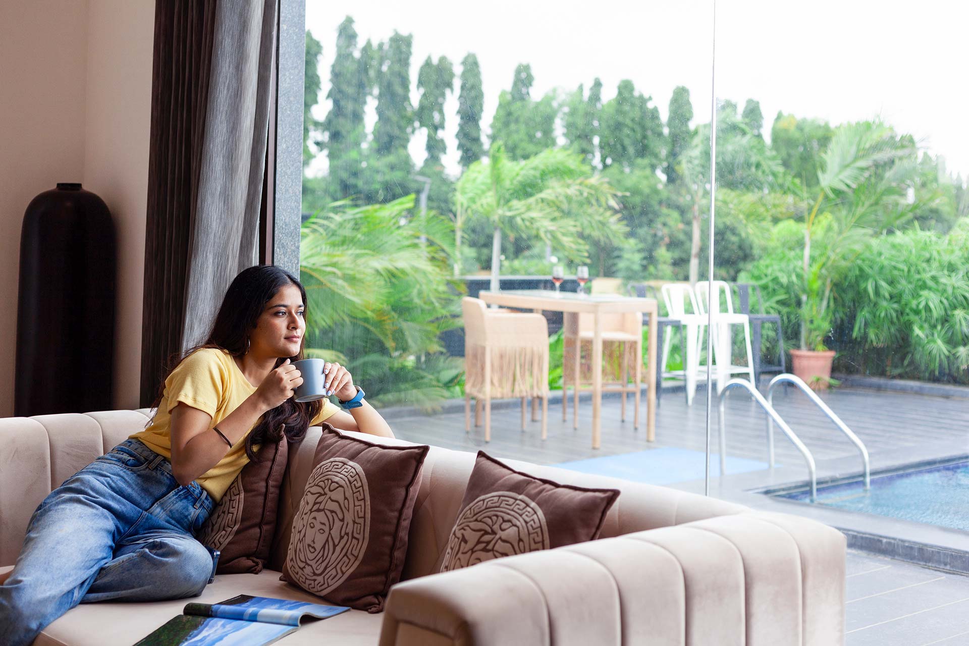 – Wake up to stunning vistas of the verdant lawn and azure pool that each room here has to offer.