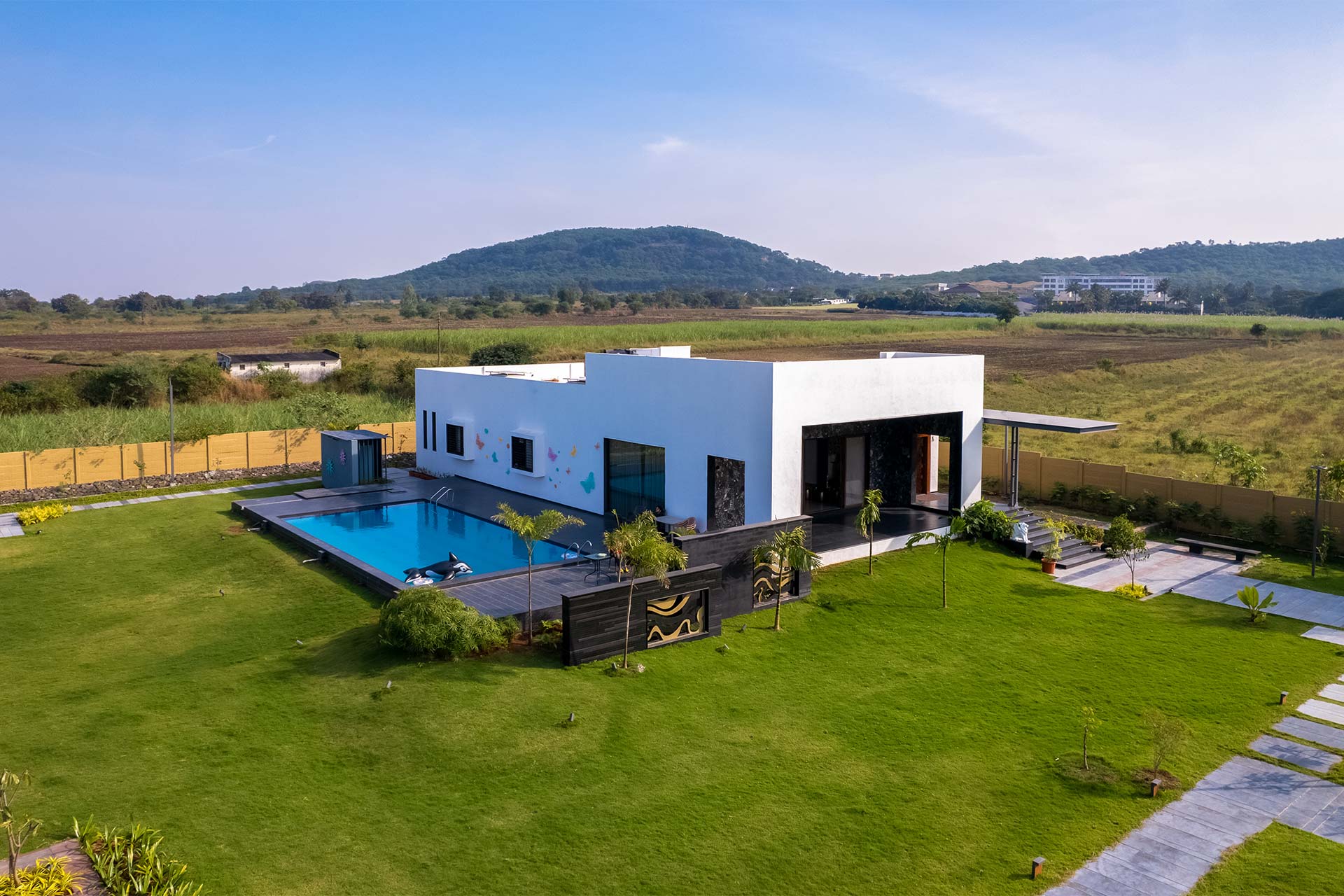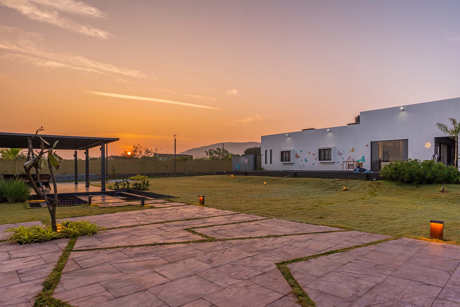 Le Bon Horizon; a contemporary and sleek home tucked away in the heart of Nashik’s breathtaking scenery hits all the boxes for a short escape away from the hubbub. With panoramic views and a wealth of thoughtfully designed amenities, this idyllic sanctuary is the ideal spot for a much-needed break with your friends and family. Relish an early morning stroll along the dewy grounds, a short plunge in the outdoor pool, or the ideal ambience this villa delivers for a stunning view of the sunset’s crimson shades.