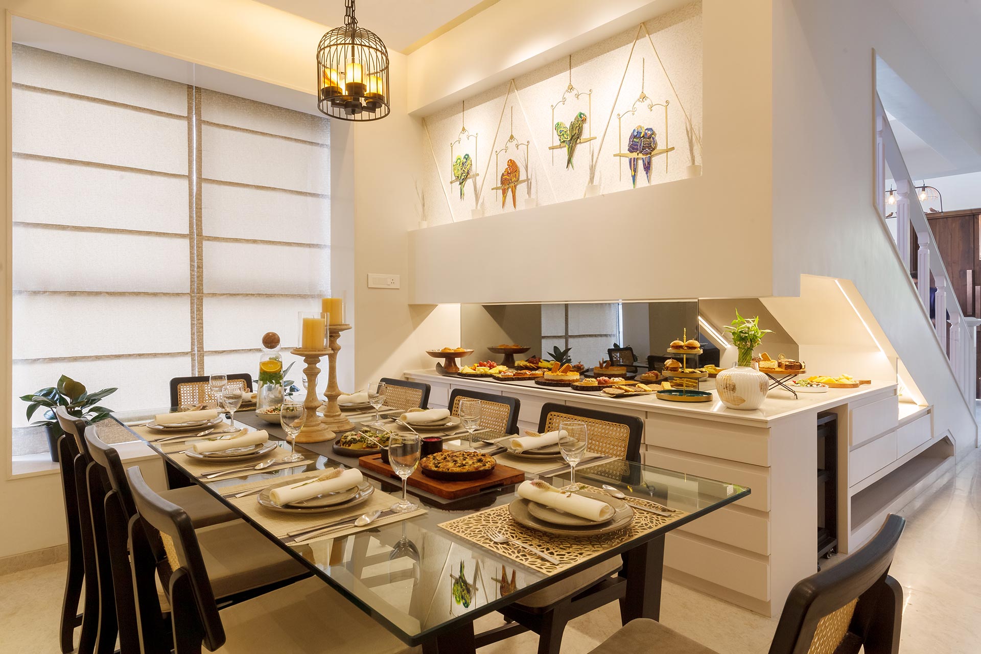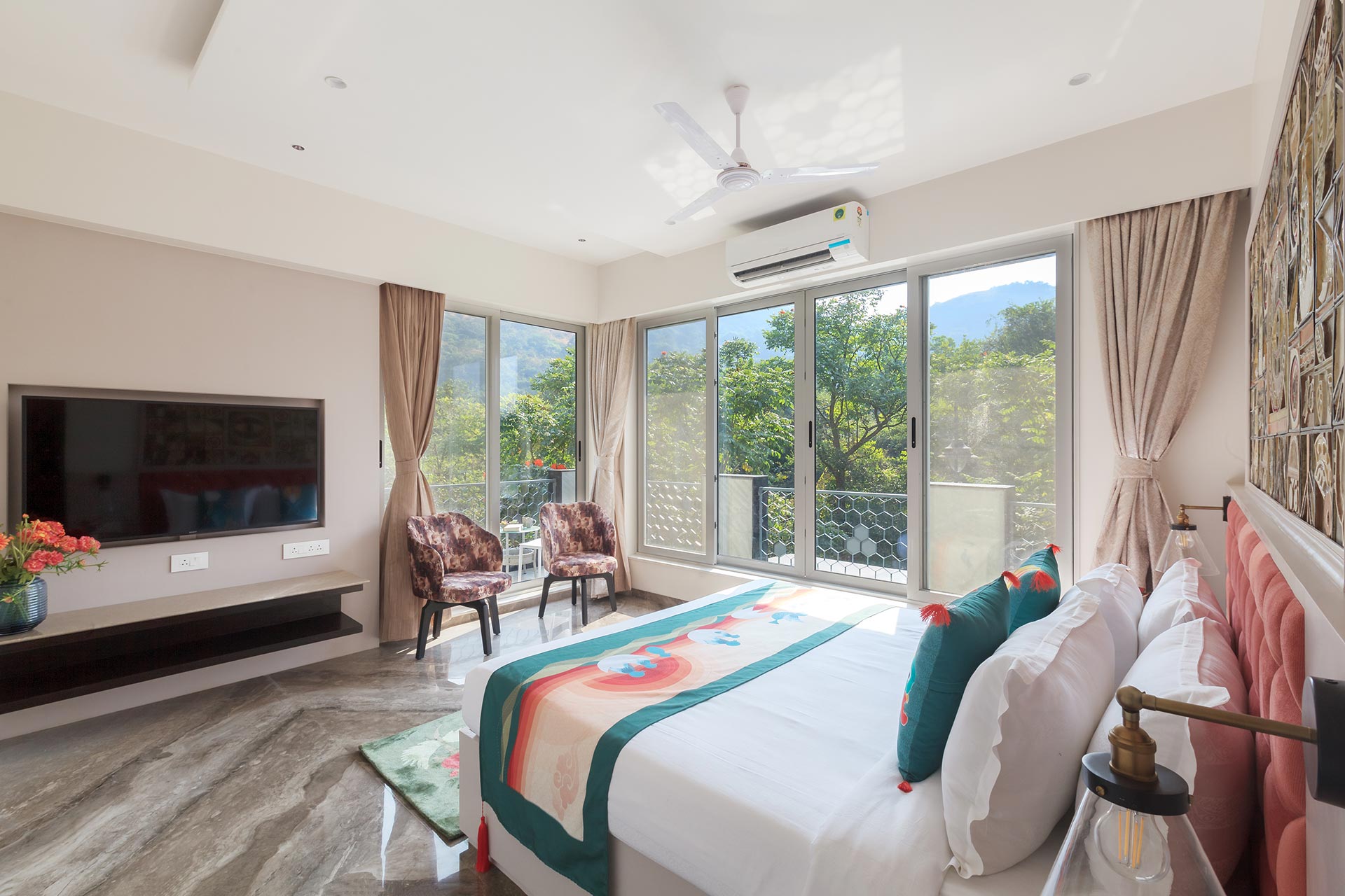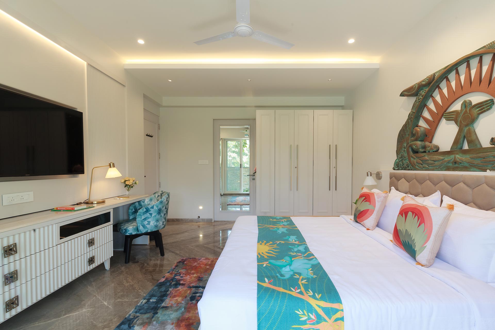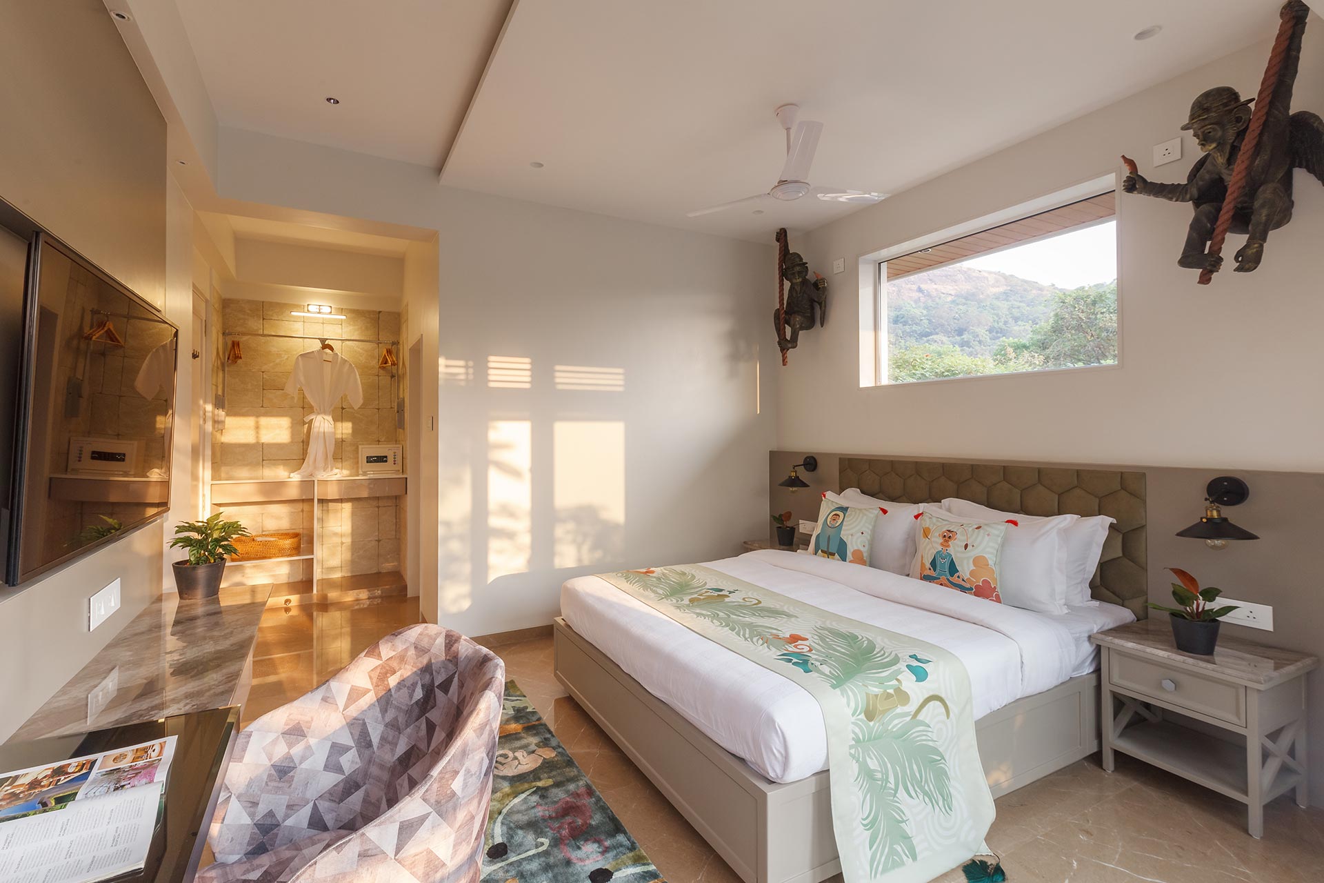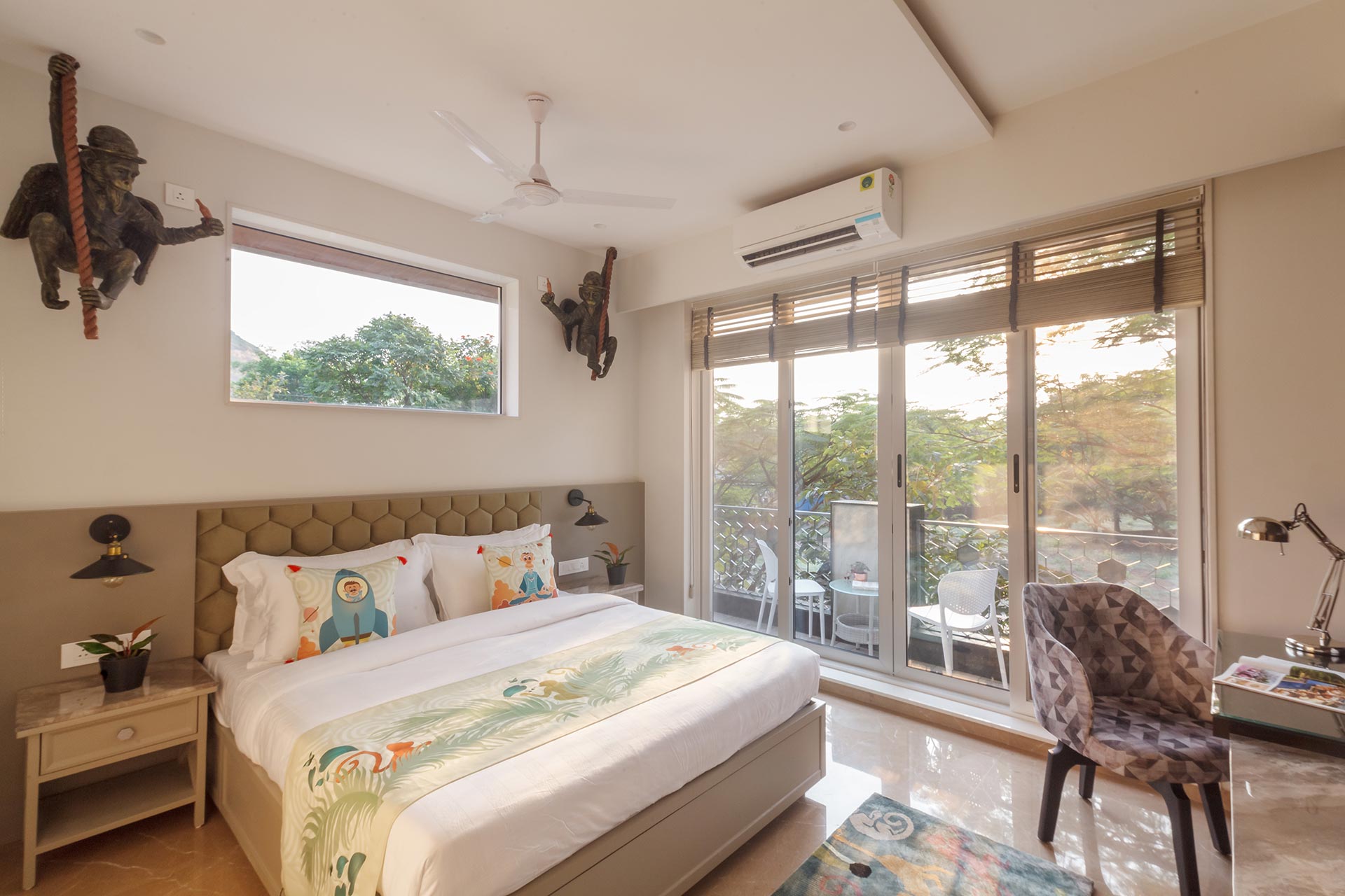 Udaan can only be described as a captivating Pinterest moodboard brought to life. From the stunning installations to the eclectic art, it is meant to stimulate your senses and let your imagination soar. As soon as you enter this magical wonder, it’s like walking into a gallery with stunning works of art, the Mischievous Monkeys, Romance Of The Birds, and the adorable ‘Ullu ke pathe’ exercising in the garden along with the ‘Cutie-kopakka’, inspired by Etikoppaka, a wood-turning craft form, is a catch-ball toy with luminous eyes that will set your heart aflutter – it is no less than a fairytale! The living and dining area is just striking – thanks to the large windows, astounding art-pieces and handsome marble surfaces. As well as letting in copious amounts of natural light, the glass slides lead out to a charming garden space with a mini-fountain to enjoy foot massages by and some seating for warm evenings. Flanked on the east by the majestic Western Ghats, on the west by open space, and on the south by undisturbed, lush forests, Udaan is an intoxicant for aesthetical calmness.