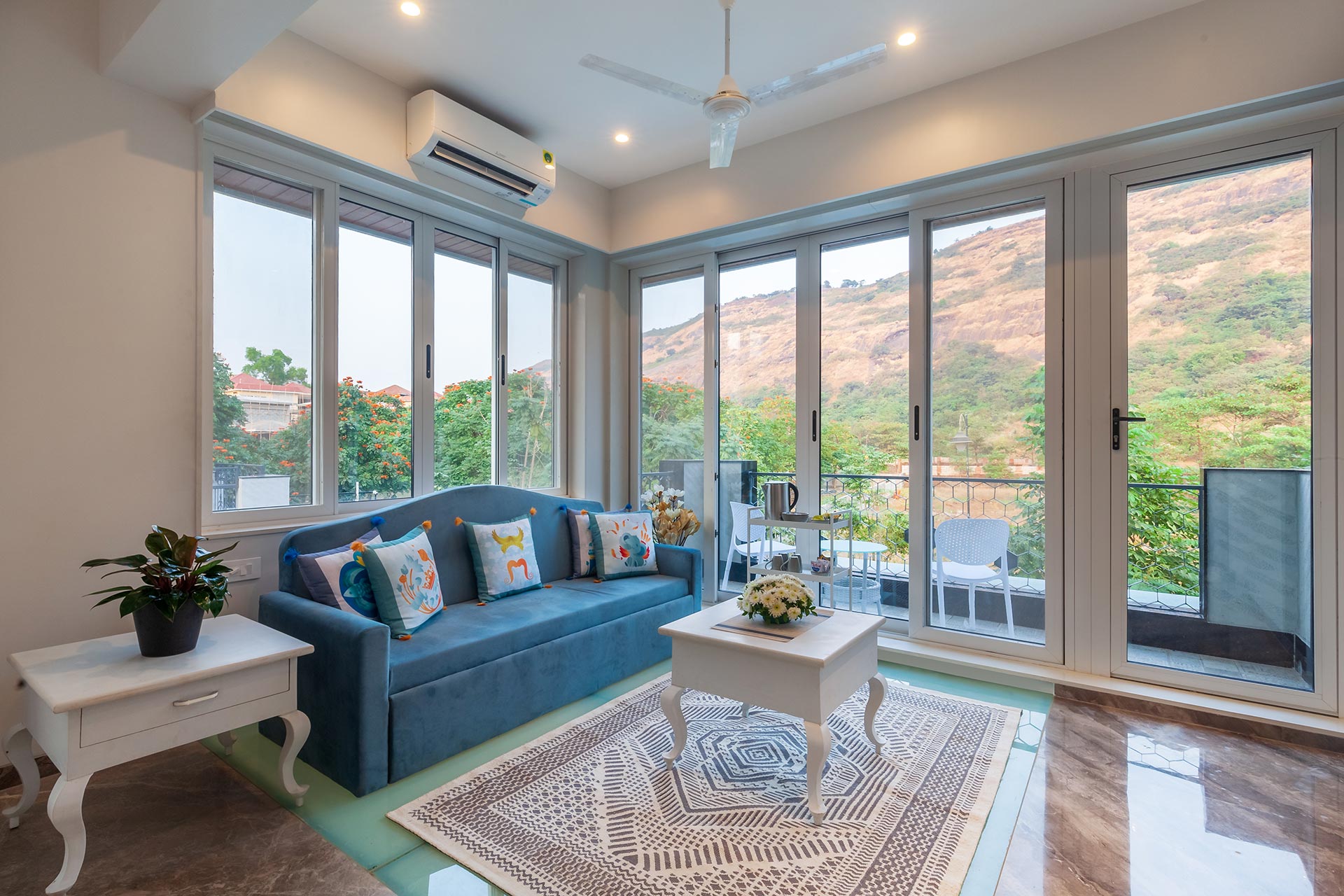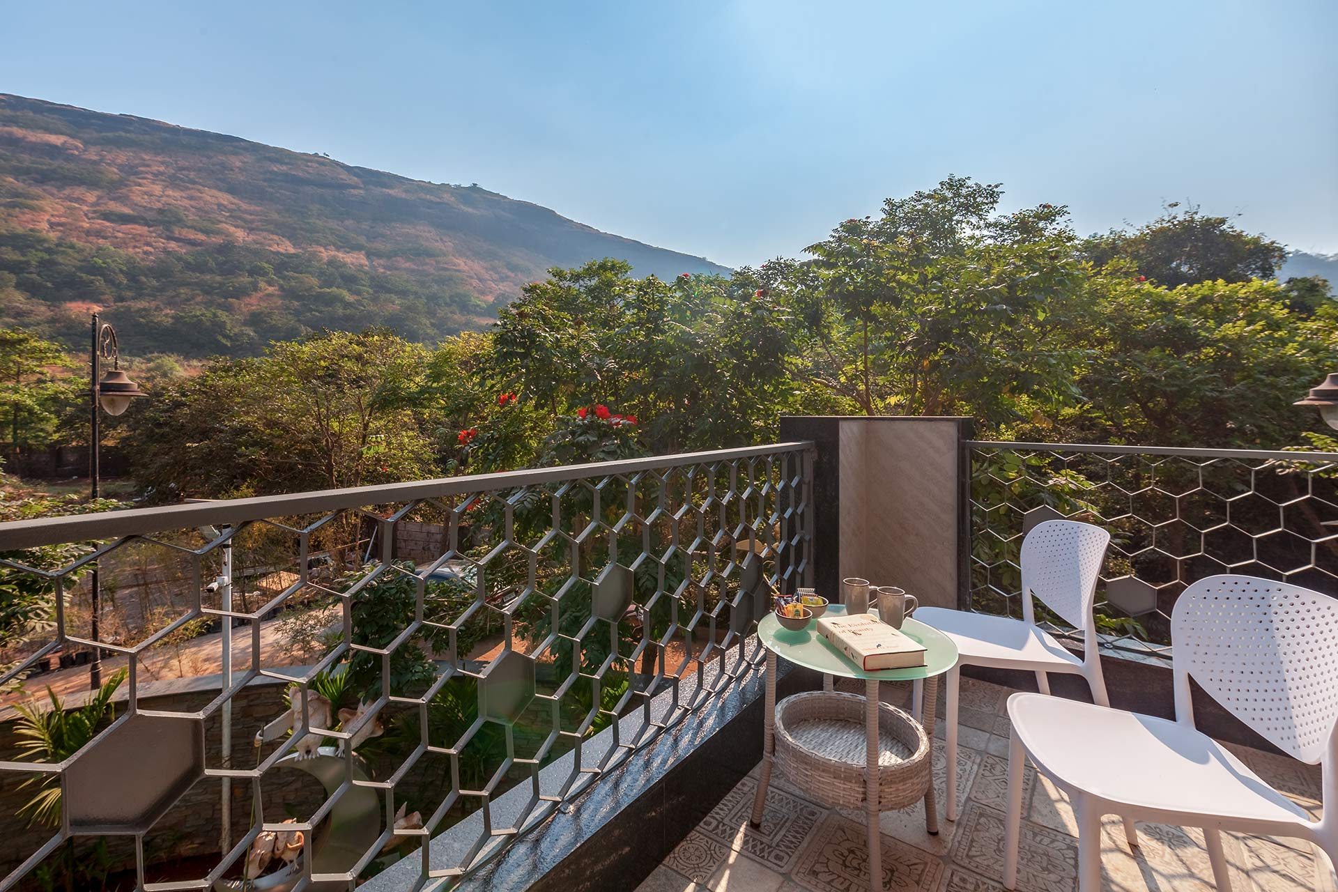 – There’s a balcony with chairs set up so you can enjoy your evening coffee here. And for a closer, more panoramic view of the Lonavala hills, head up to the terrace and let the fresh, wafting breeze flow through your hair.