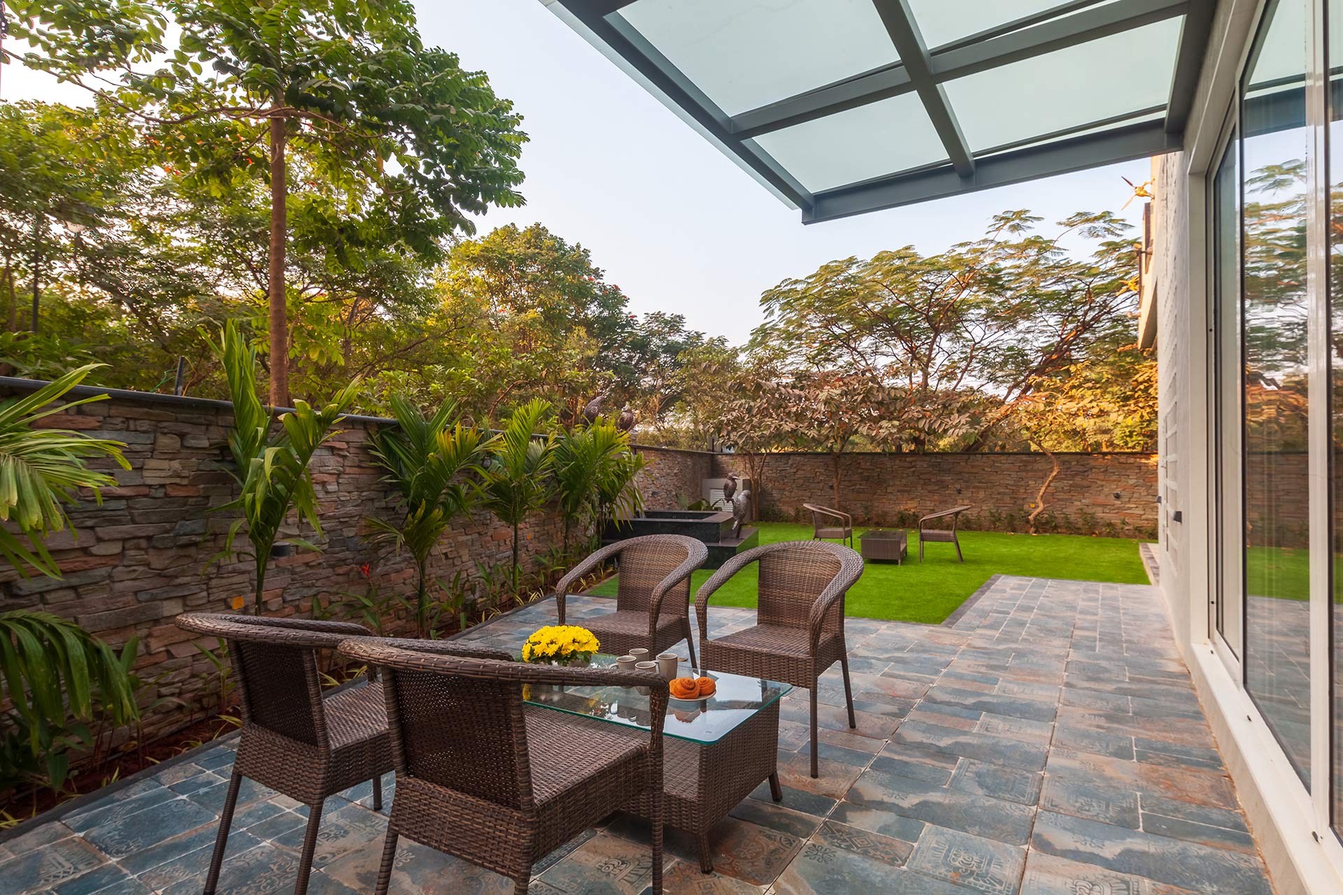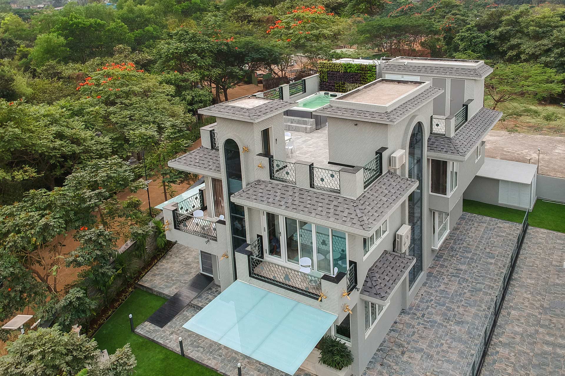 – The bedroom on the ground floor offers direct access to the lawn whereas 2 of the bedrooms on the first floor offer L-shaped balconies with seating to relax and unwind by the views.