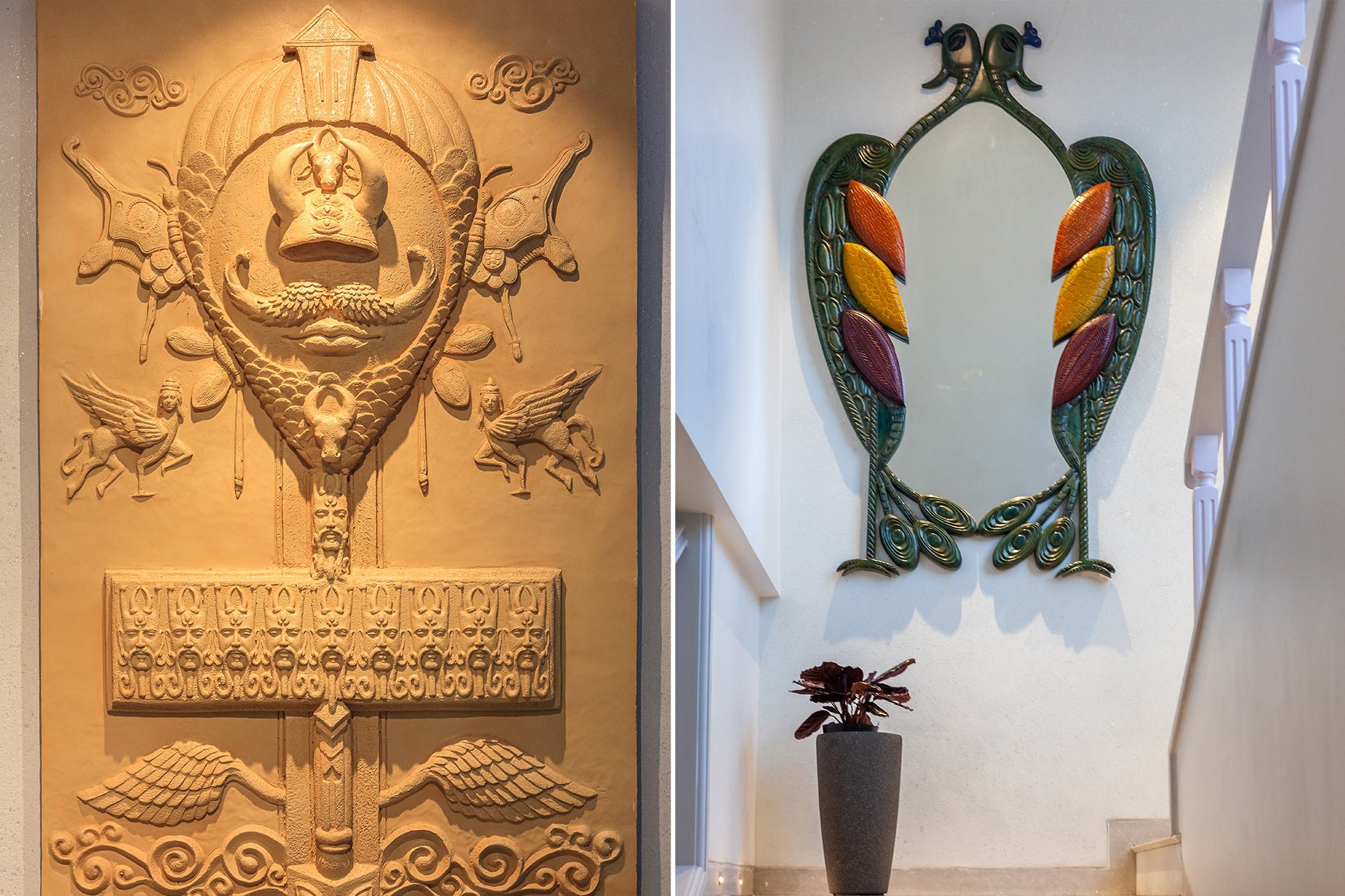 – When you take the stairs, you will come across the hand-carved peacock mirror, a simple but breathtaking piece of art you’d love to click an aesthetic selfie at before you head up to the first floor.