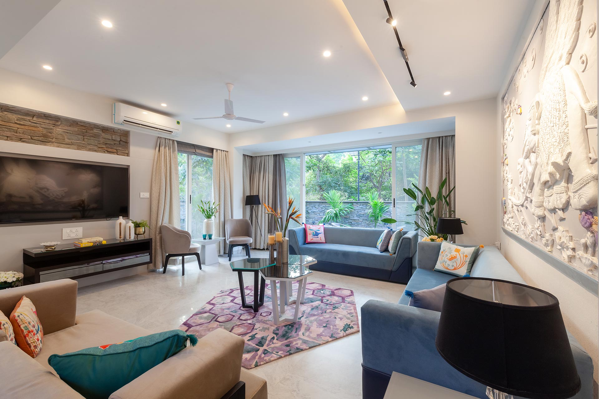 – This living room is equipped with plush sofas offering seating for up to 11 people, AC, a 65-inch TV, a music system, Wi-Fi, and direct access to the lush lawn.