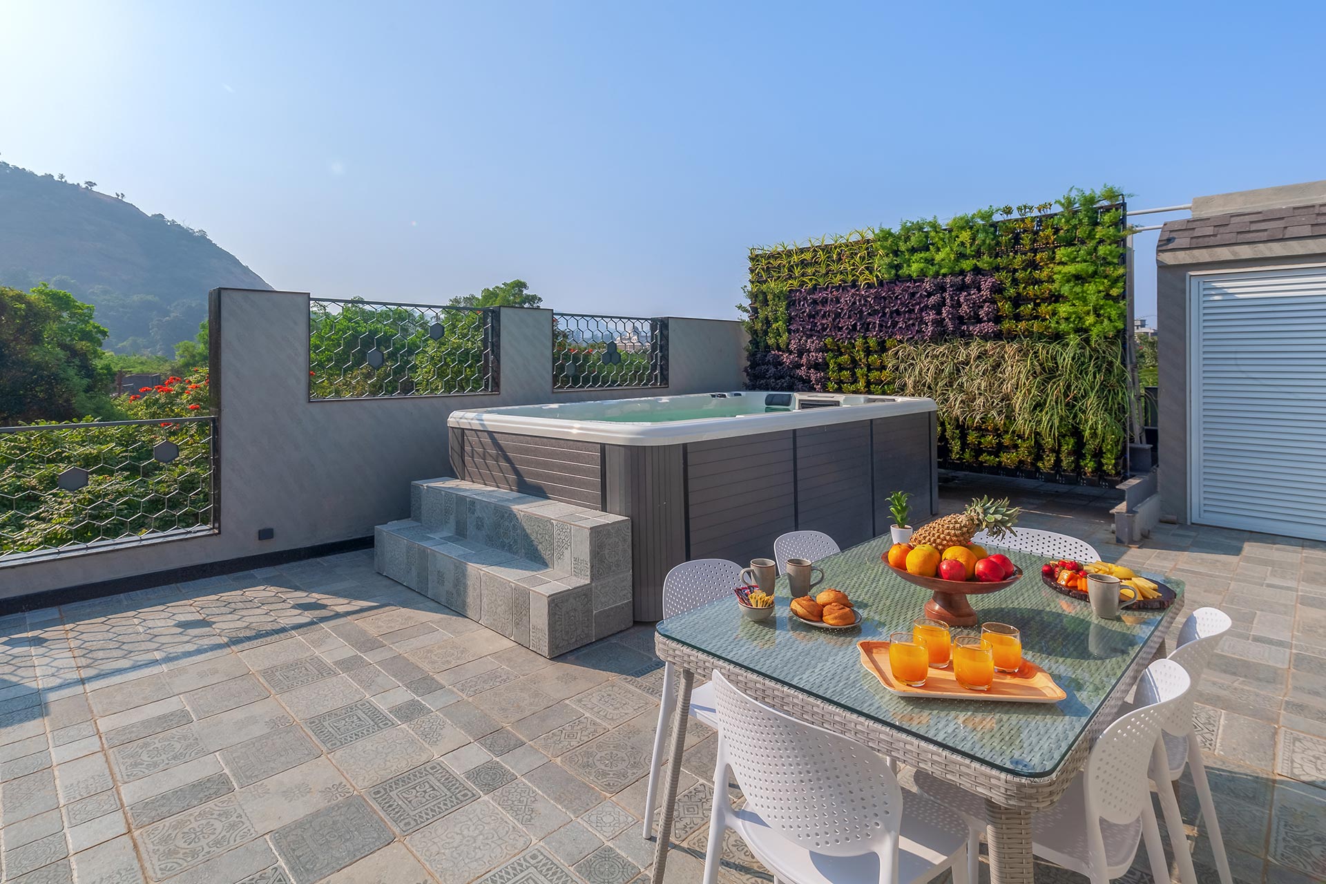 – Serene rooftop jacuzzi set in the lap of nature