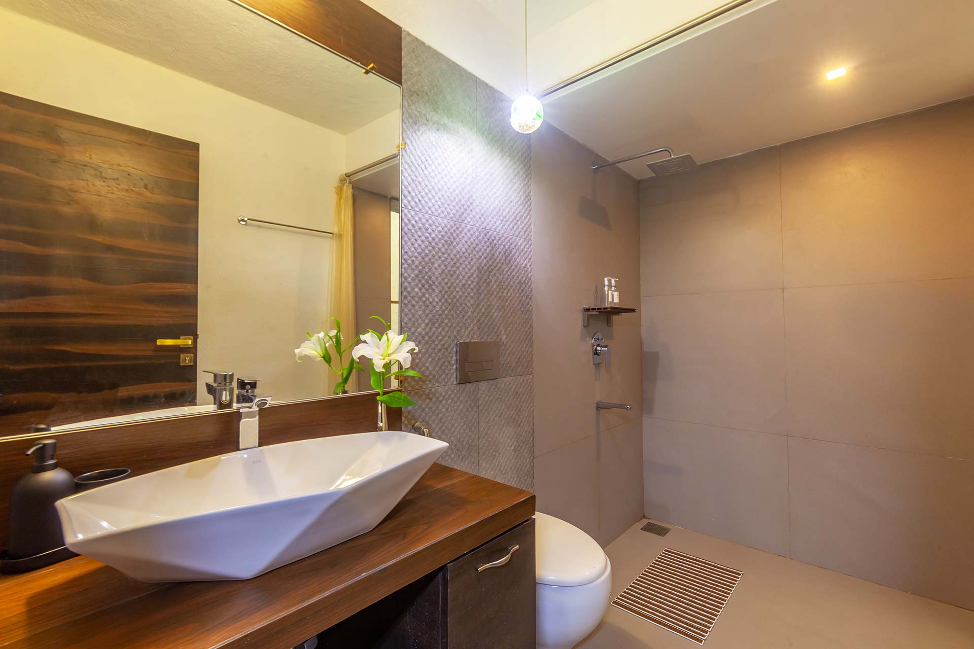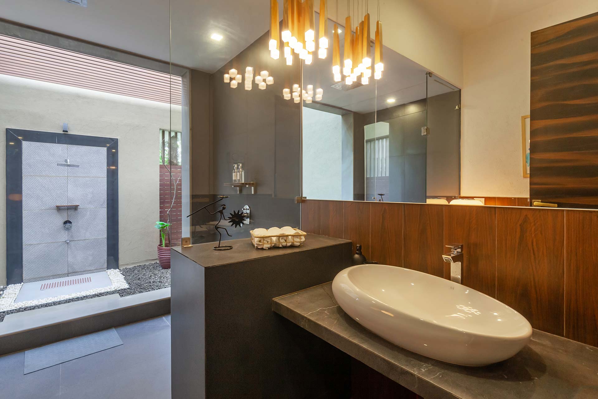 A culmination of a dream home, Mokshah is a wellness retreat alright. Right from the manicured gardens featuring a temple, to the private infinity pool that shines under the glistening sun, the transcendent beauty of this property cannot be understated. When you wish to spend time indoors, the entertainment room beckons, with its snooker table and its huge dance floor. For a more relaxing sojourn, unwind and relax in the steam and sauna, or enjoy a soothing massage. The TV room is the perfect set-up to simply laze around, stay in and enjoy your favourite movies with your loved ones. The relaxing ambience entices a laidback luxurious getaway, far away from the urban clamour.