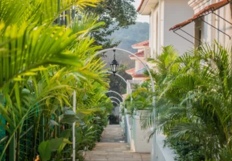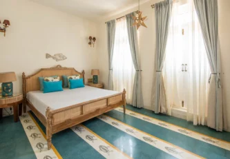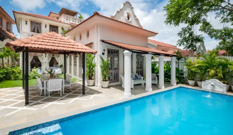 Villa Verde is a four-bedroom home located on the border of Anjuna and Assagaon. This luxury holiday home has a rectangular courtyard with the pool in the centre, three bedrooms plus a study surrounding it. Antique doors open up to an airy living room with remarkably high ceilings. The master bedroom upstairs has graphic cement tiles and a Juliette balcony which is the perfect spot to enjoy an espresso or two. Right from the outdoor deck to the alfresco dining table surrounded by exotic plants, guests who have stayed here, love Villa Verde’s common areas.