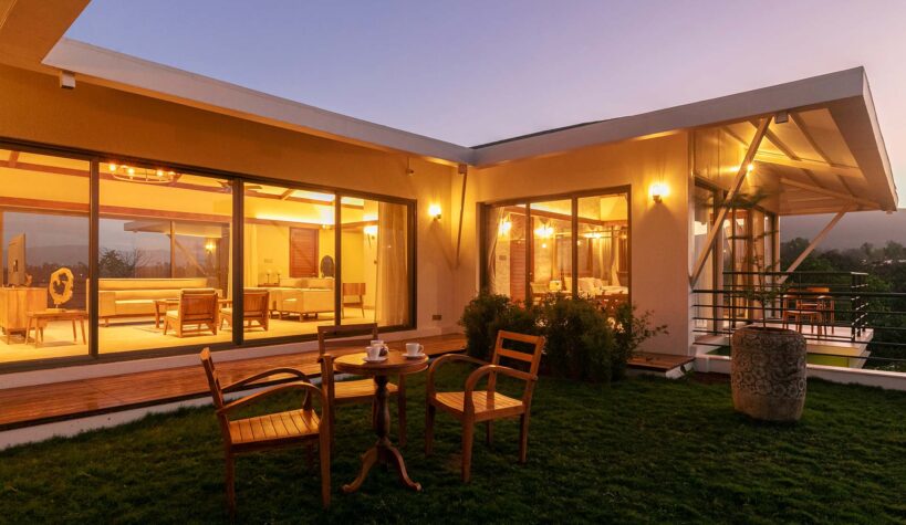– Either side of the living room opens up to terrace lawns, offering 270 degree views of the mountains and the lake. There are seating arrangements for 3 people in each.