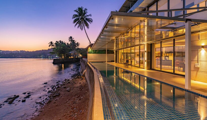 Upon entering the villa, guests are immediately struck by the splendid panoramic views of the pristine Mandovi River and the clear skies. The villa is designed to ensure that the views never leave your sight, thanks to its eye-catching glass facade. The panoramas will leave you mesmerized, providing the perfect backdrop for a relaxing and rejuvenating stay. The interiors are eloquently ornamented with ample frames, olden furnishings, and assorted knick-knacks, creating a charming and rustic feel. One of the villa’s most striking features is its pool deck overlooking the river, replete with comfortable loungers. This is the perfect spot to relax and enjoy the surreal, while the river gently flows by. All in all, this villa offers a truly enchanting and unforgettable experience, basking in the natural beauty of Goa.