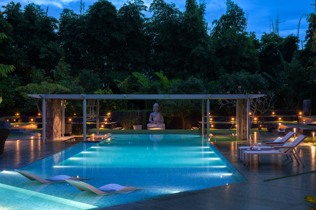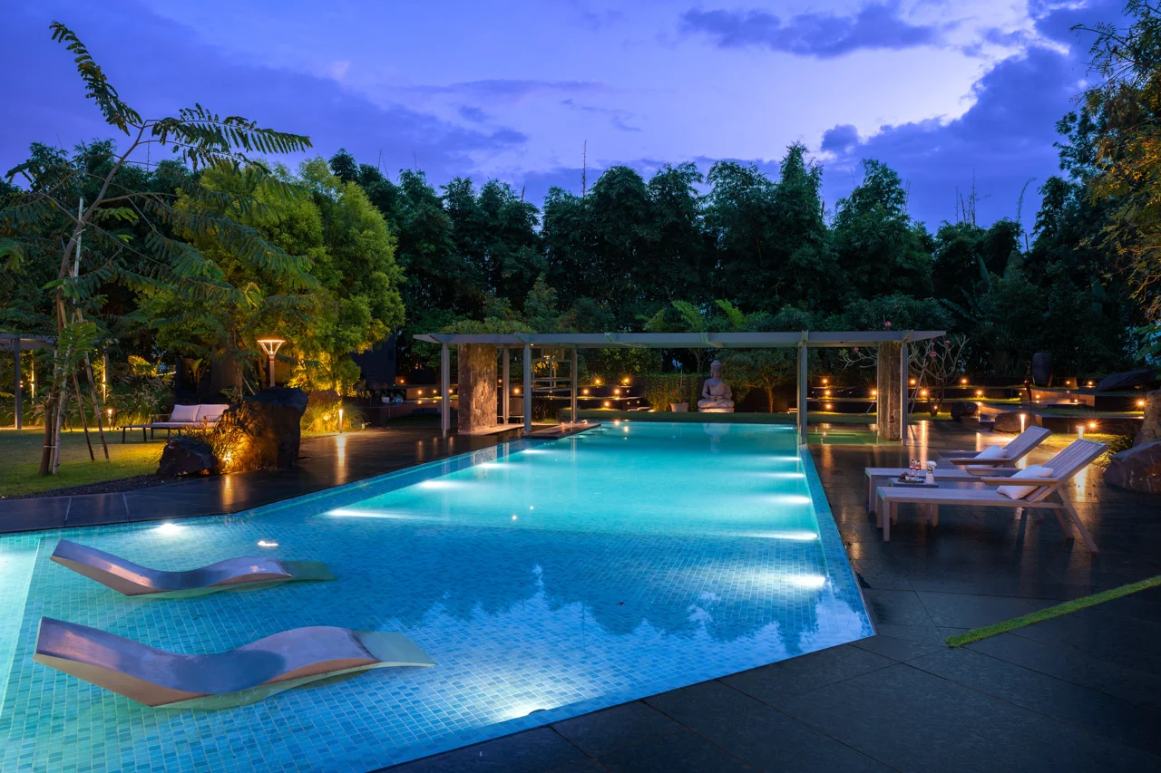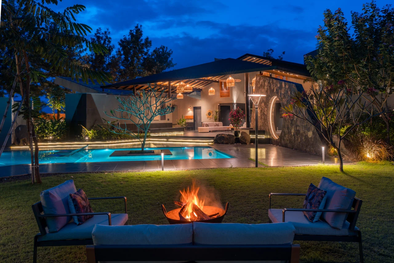 Nestled amidst the tranquil farms of Nashik, Prana Zen House offers an idyllic escape that seamlessly blends luxury with nature. This serene retreat is celebrated for its Bali-inspired interiors that evoke a sense of tropical calm through earthy textures, wooden accents, and sunlit spaces. The villa features a private pool lined with inviting sun loungers, perfect for slow afternoons under the open sky. Its beautifully manicured lawn and thoughtfully designed sit-outs create picture-perfect corners to unwind or share conversations over evening tea. As the sun sets, the ambience transforms with cosy bonfires and barbecue setups, ideal for gathering with loved ones. For those seeking deeper relaxation, the villa’s steam room and spa services provide a sanctuary of rejuvenation. Whether you wish to soak in the quiet countryside charm or indulge in holistic comfort, Prana Zen House stands as one of Nashik’s most exquisite and soulful villa experiences.