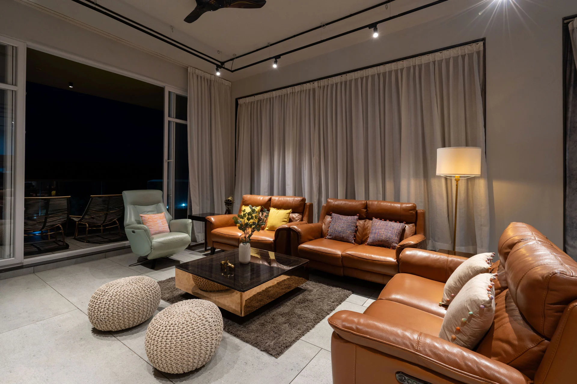 This living room is adorned with leather seating arrangements for up to 7 people.