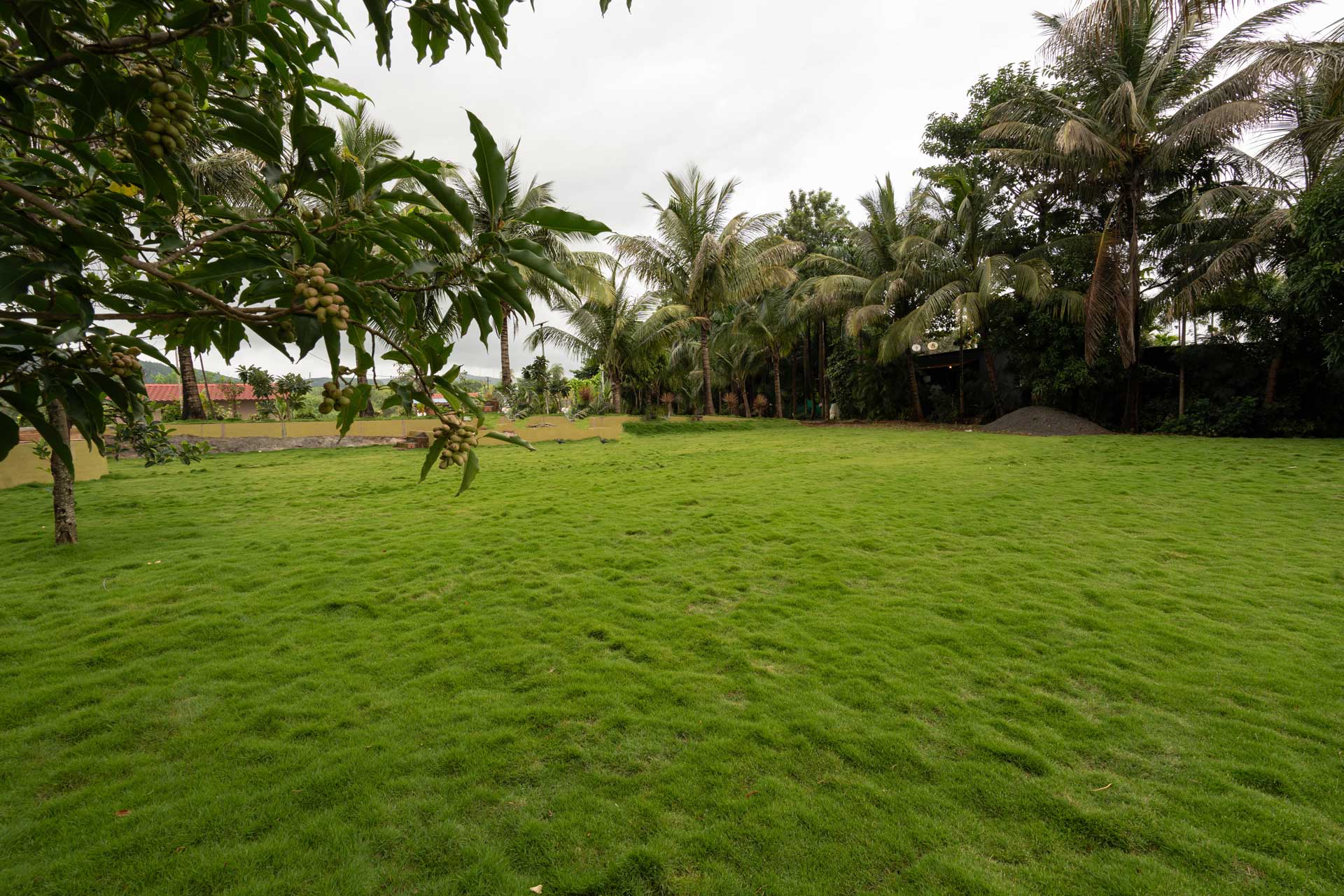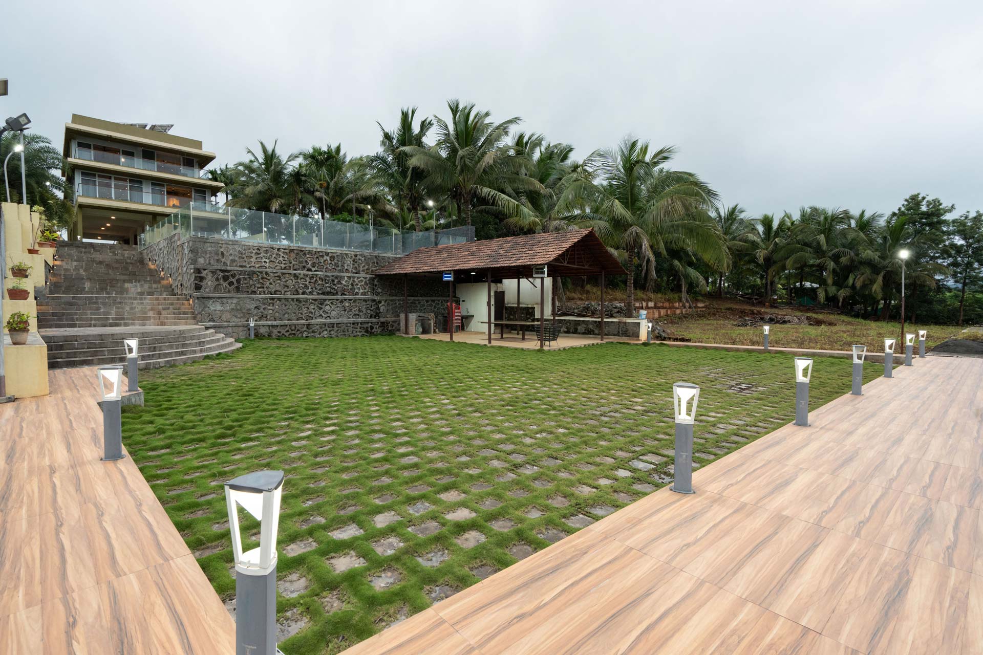 There is a 5000 sqft sq. ft lawn fit to partake in workout sessions and play outdoor games.