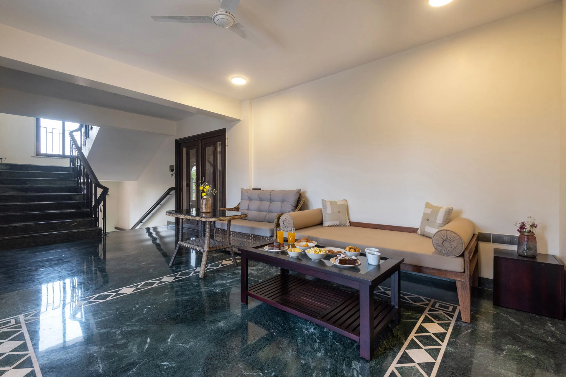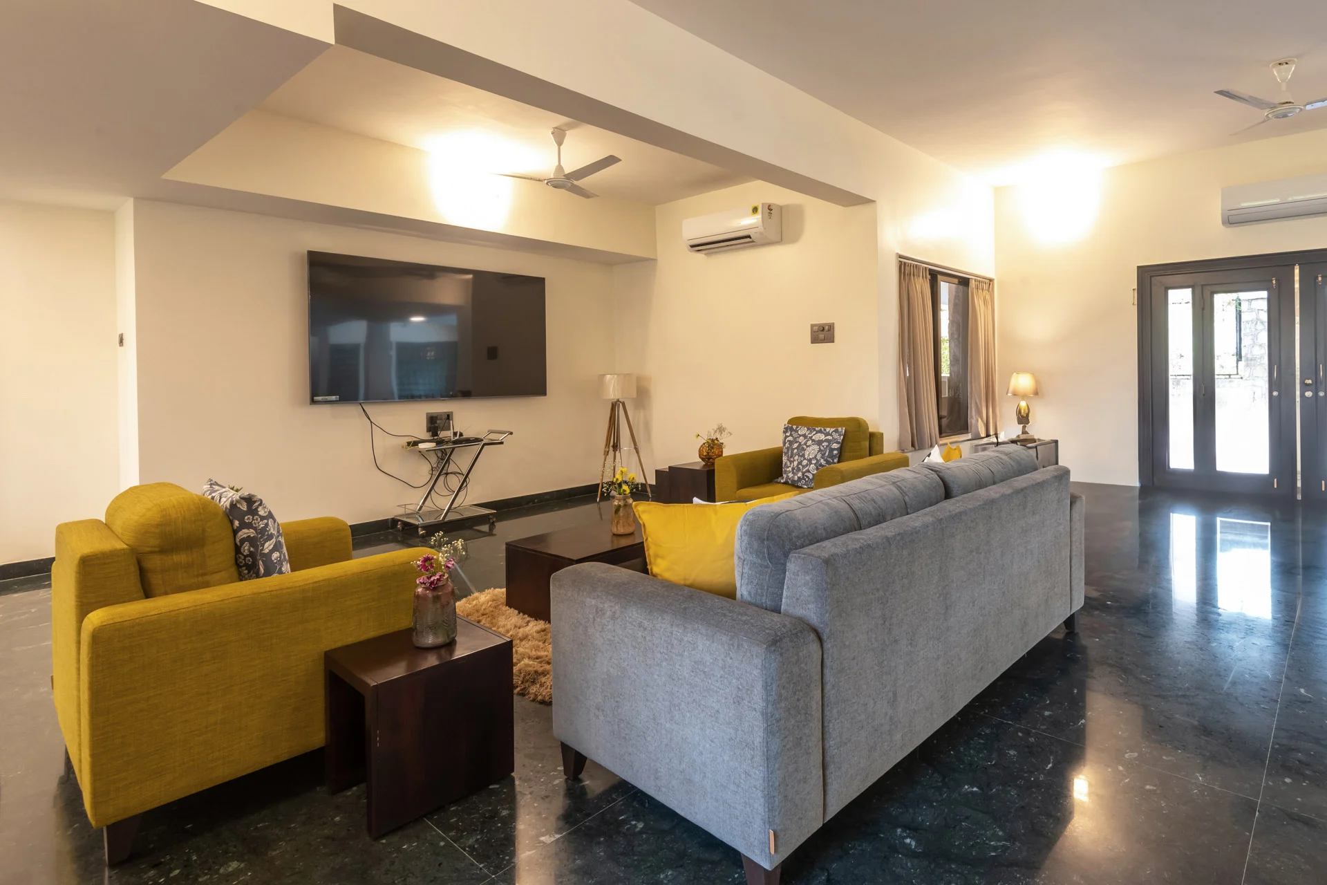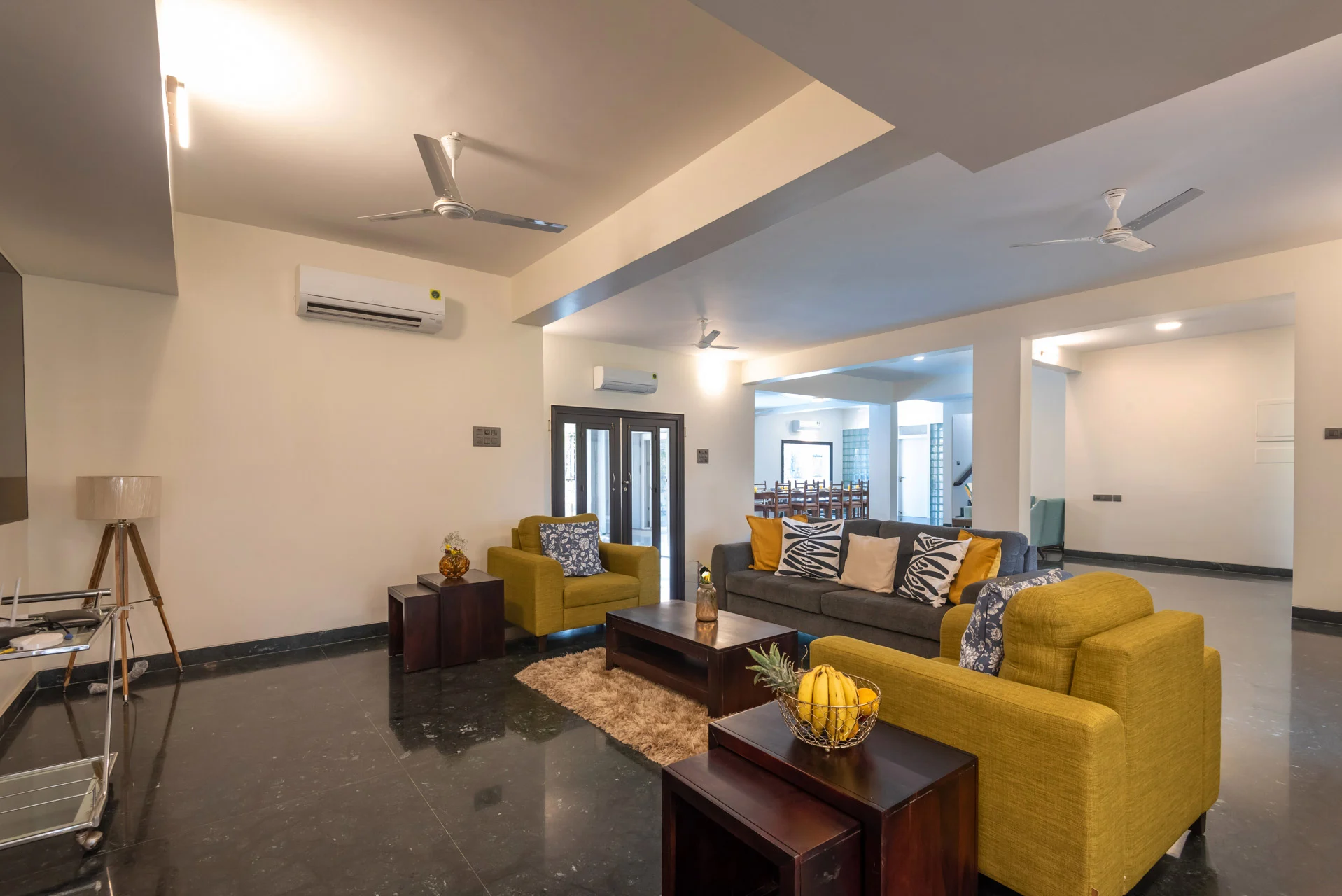 There is a spacious living room designed in a minimalist yet luxurious way.