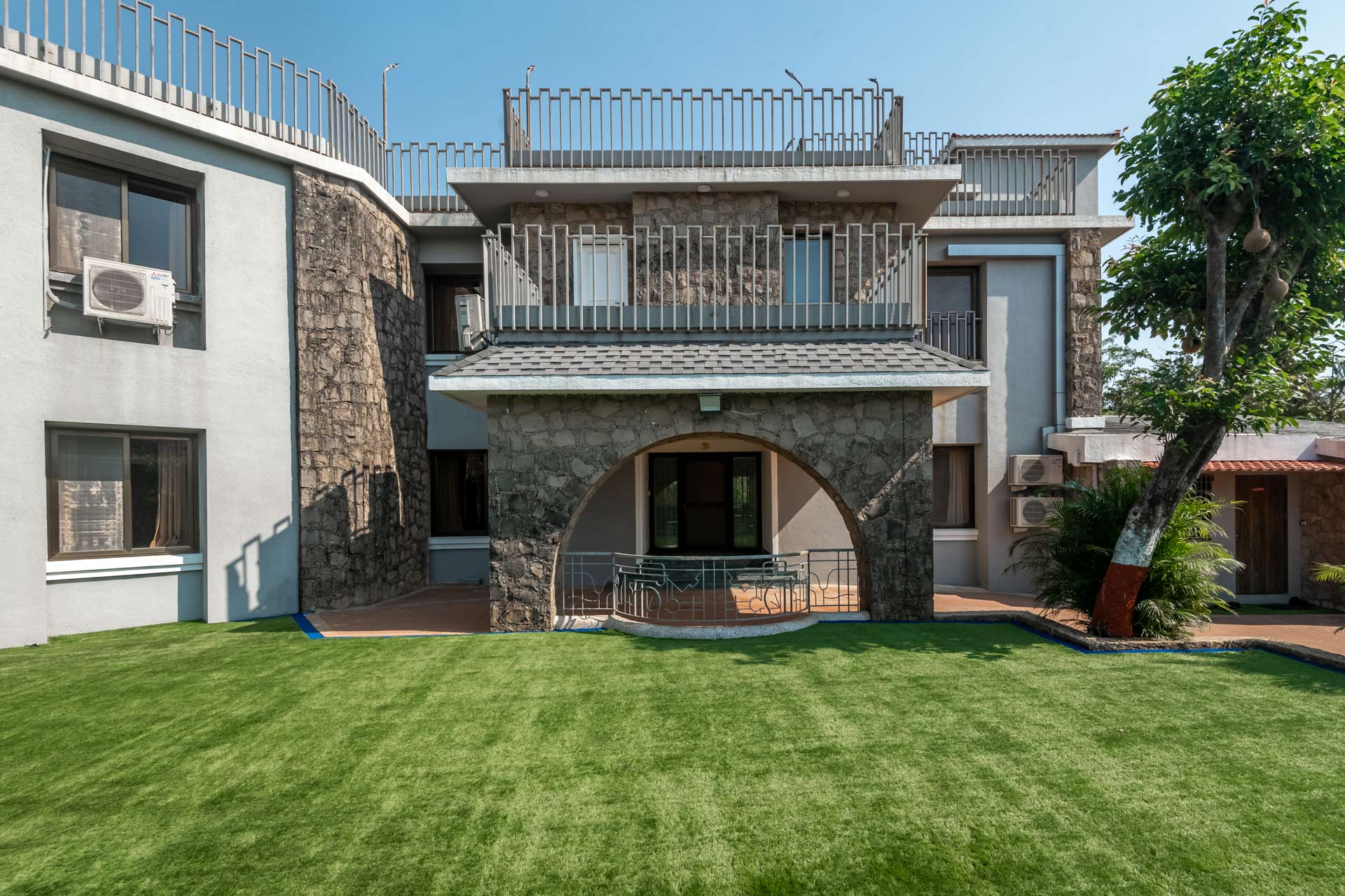 There is a 10,000 sq. ft artificial lawn with seating space