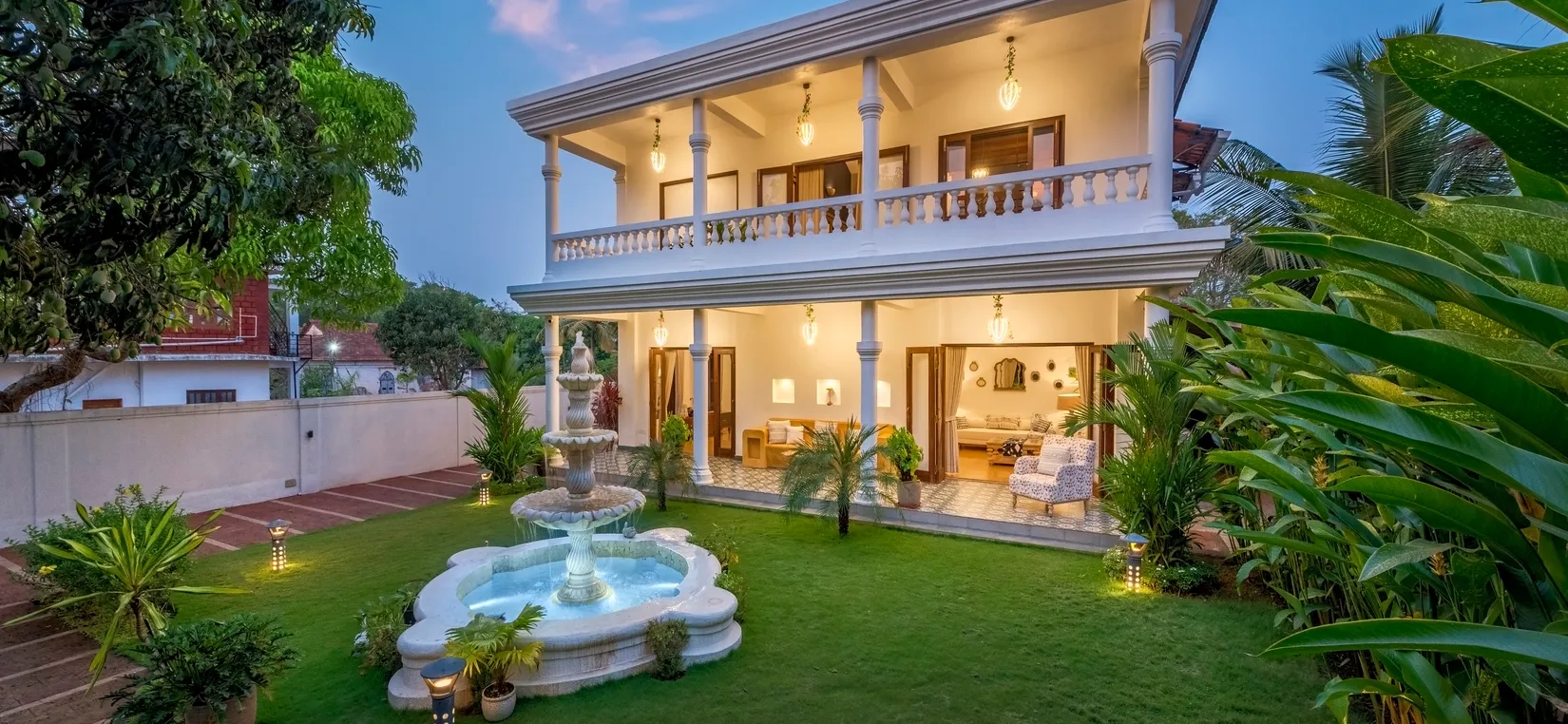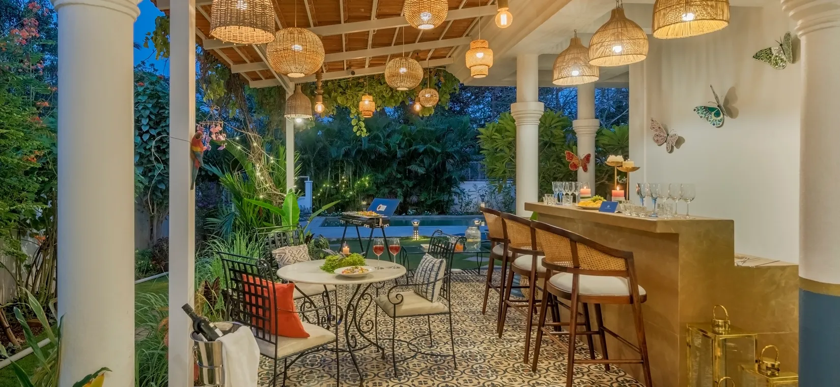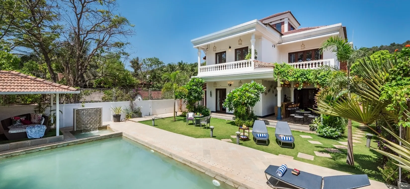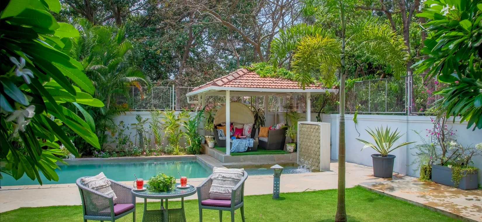As you walk through the main gate, you are welcomed by a manicured lawn and a serene fountain—setting the tone for a restful holiday. The landscaped garden leads you to the patio, bar table, gazebo, and the inviting swimming pool.