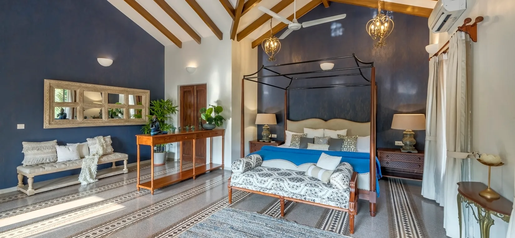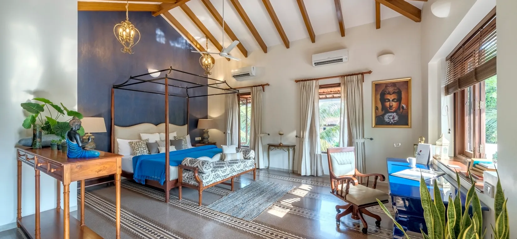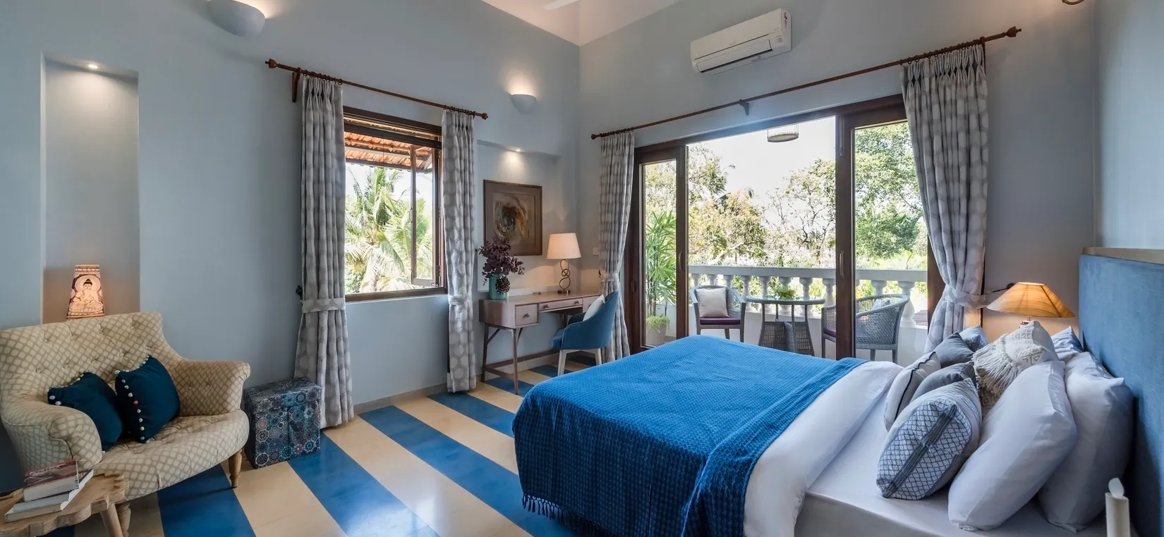 Each bedroom is thoughtfully designed with luxurious furnishings, soft linens, and warm décor elements—creating a peaceful sanctuary after a day of exploring Goa’s lively attractions.